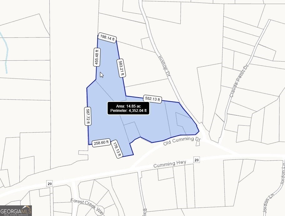 $6,393,000 for this approximately 14 Acre assemblage of relatively level land with little to no topographical challenges. Direct access onto Hwy 20. Industrial grade cut-de-sac capable of handling 18 wheeler truck and trailers. Commercial buildings and residential homes are on the 4+ ac property for $2,000,000. Land sits high with excellent visibility on Hwy 20. Approx. 1500 ft of road frontage on Old Cumming Dr, Bishop Dr. and Hwy 20. Traffic count of 22,400. is from 2022 which is before construction on Hwy 20 and just as Covid restrictions were lifted. The traffic count has grown exponentially and will continue to increase as Hwy 20 construction wraps up. Parcels included: 14N29A 013, 14N29A 012, 14N29A 011, 14N29A 008, 14N29A 008A, 14N29A 006, total price is $6,393,000.
