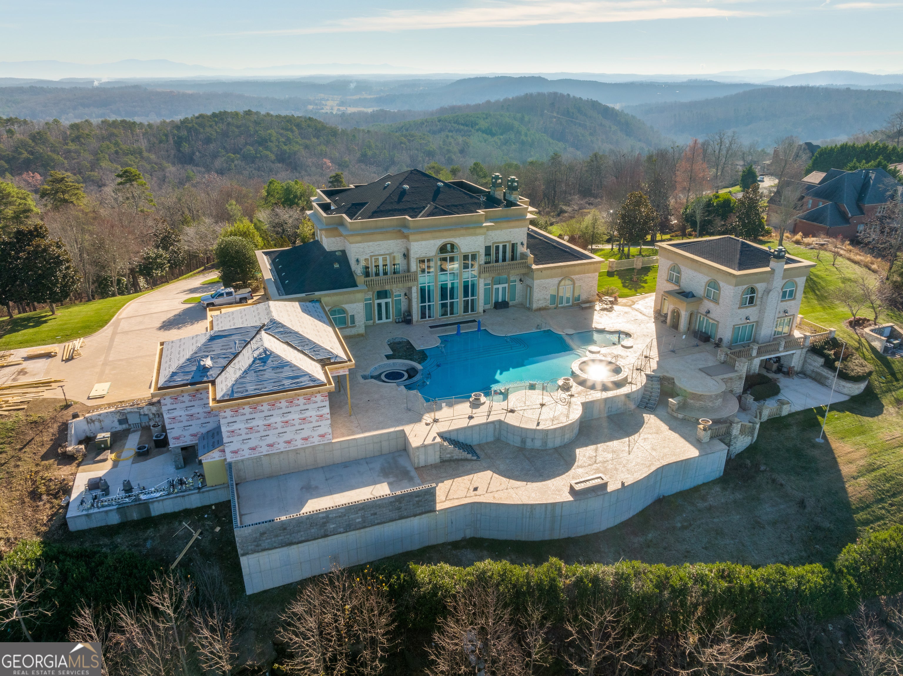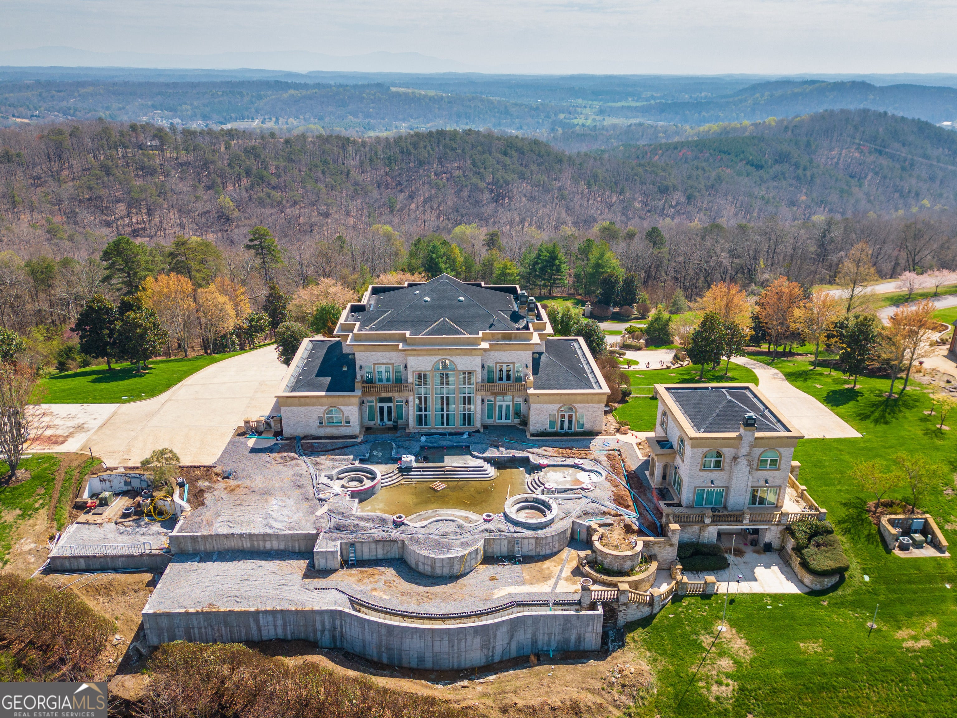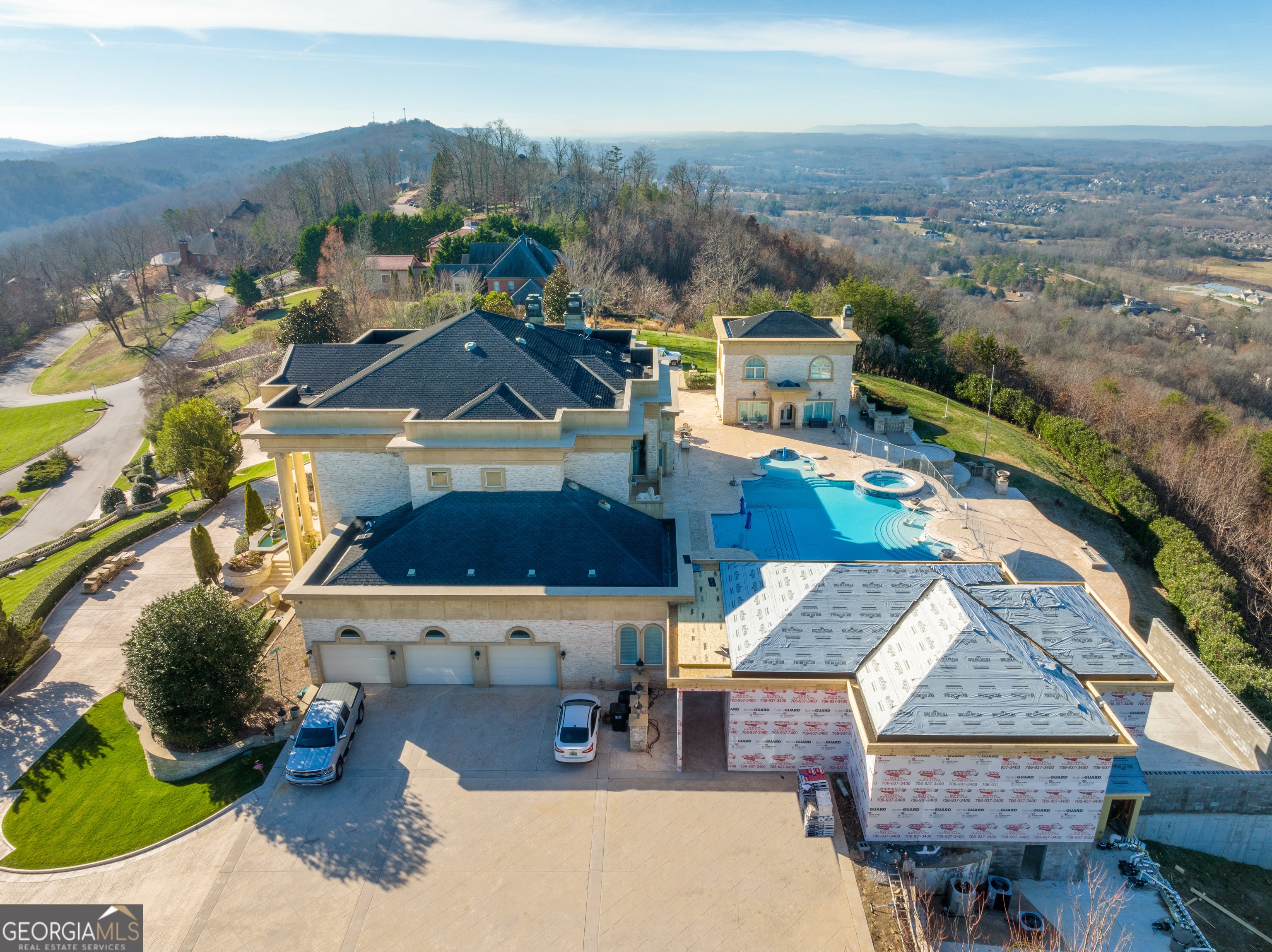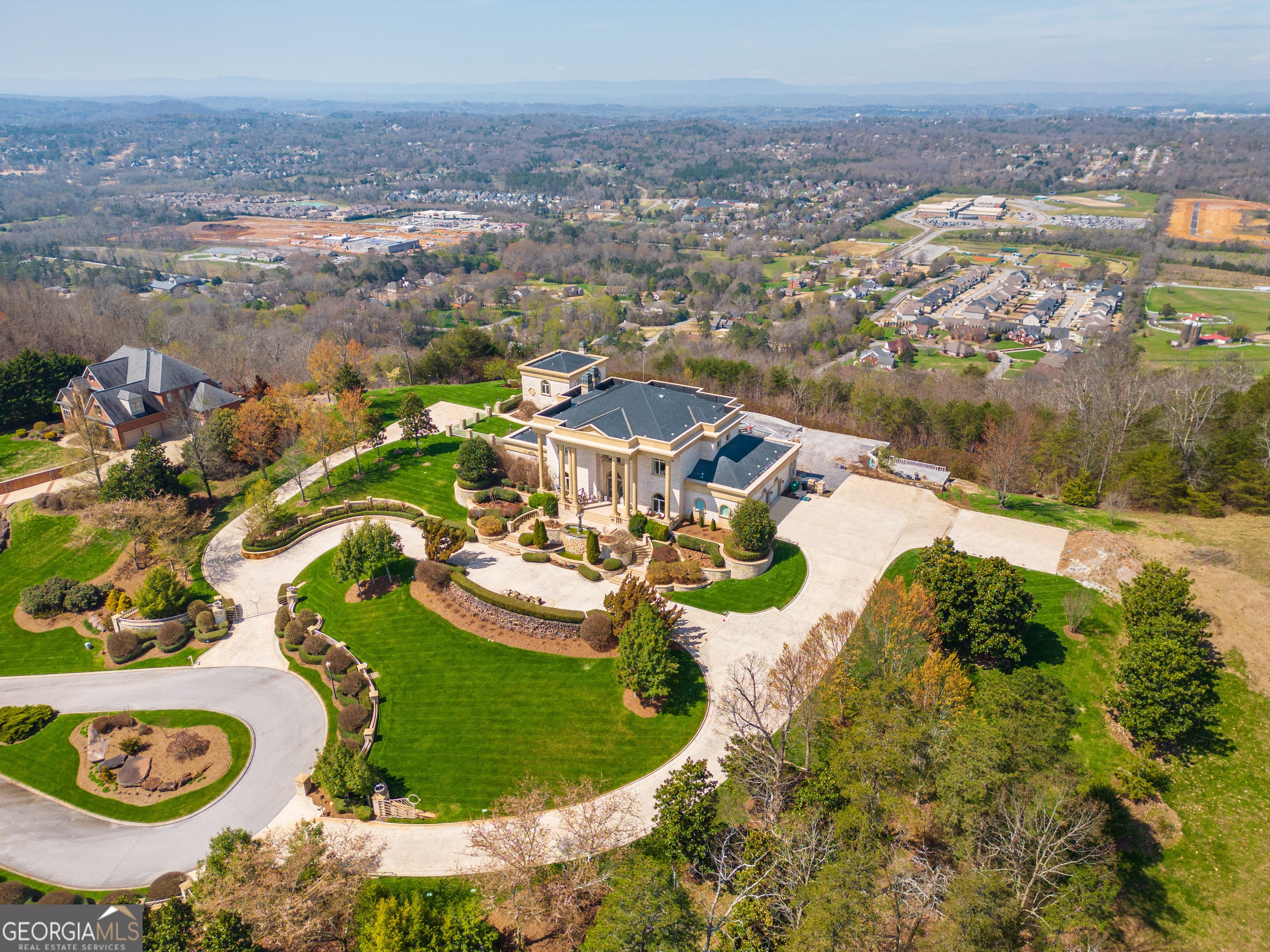 ''The Windy Hill Estate''. Prime Ooltewah, TN location. Gated privacy. Breathtaking views. ''Heavenly Views'' A rare find to say the least. Endless southeastern views of ''The Horizons,'' and/or southwestern views Lookout Mountain and city lights. Eleven acres at the top of White Oak Mountain, at the end of a cul-de-sac street. This luxurious estate features elegance and comfort (built like a fortress). Quality custom built featuring the finest craftmanship of stone throughout the estate (inside and outside). Main house consists of 8800 Sq Ft. 5 bedrooms, 5.5 baths. Luxurious master suite and luxurious master bath with his and hers walk in closets all on the main level. Soaring high ceilings throughout. Beautiful and/or elegant marble staircase thereby showcasing a grand chandelier. Elegant 2 story foyer. Elevator. Open floor plan features a piano bar that includes a wet bar, dishwasher, and ice maker. Separate dining room, family room, separate sitting room (living room), custom butler's pantry which features a dishwasher, ice maker, and sink. Breakfast room that features a Scenic City view. Second level foyer overlooking the grand marble stone staircase, along with the front entry foyer and at the same capturing eastern and western view. 5th bedroom is currently customized as an office with custom built-in cabinetry. All bedrooms feature full bathrooms. Custom, gourmet kitchen includes a Thermador gas cook top with warming shelves, Thermador double (wall) ovens and side by side built-in Sub-Zero refrigerator and freezer. Island with second sink and Kitchen Aid dishwasher. Main house features side rear entry attached 3 car garage. Large laundry room with sink, custom cabinets, built-ins, and pull-outs galore. Plantation shutters throughout. Custom trey ceilings throughout. House consist of Pella Windows and Doors. Lush landscaping with water fountains, flower beds, and retaining walls. The overall layout and/or presentation is simply elegant. The separate guest More...house consists of 2400 Sq Ft, 2 bedrooms, 2.5 baths, which includes panoramic views. The grand design outdoor entertainment area has too many features to mention in doing the subject justice. Multi-level pool side features are nothing less than spectacular. The grandeur display of quality and custom marble features is breathtaking. The pool and pool house features are all new and/or under construction and near completion. Pool side entertainment features are incredible: Unite (with pebble tech) heated pool and hot tub. Pool features zero entry and tanning deck 1 & 2. Two badu jets. Swim up bar to fire pit with custom sunken seating. 2 accent fire bowls flanking the pool side. Poolside basketball goal. Custom Mushroom foundation. Pool house/outdoor kitchen equipped with state-of-the-art appliances, allowing you to entertain guests with gourmet meals. All sports court includes basketball and pickle ball courts overlooking the western brow with scenic city view. The pool house features a theater room, a wine cellar room, and a full bathroom along with a gourmet kitchen and grilling with open air full retracting sliding doors to the pool, thereby capturing the scenic city, brow front views. Perfect for hosting poolside parties and enjoying a vibrant outdoor atmosphere. Providing endless entertainment options for you and your guests within this luxurious back yard oasis. All of the water features create a soothing ambiance. LED lighting creates an enchanting nighttime pool atmosphere with fire bowls, mushroom fountains, and waterfall via an integrated hot tub along with many customized features, all overlooking breathtaking views, yet with seclusion and tranquility. A private retreat with resort inspired luxuries.