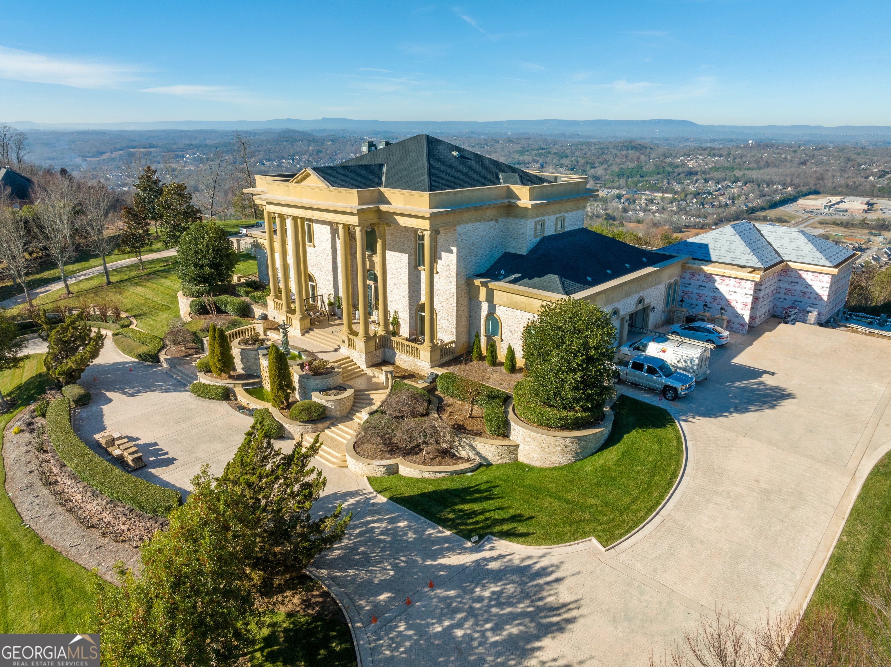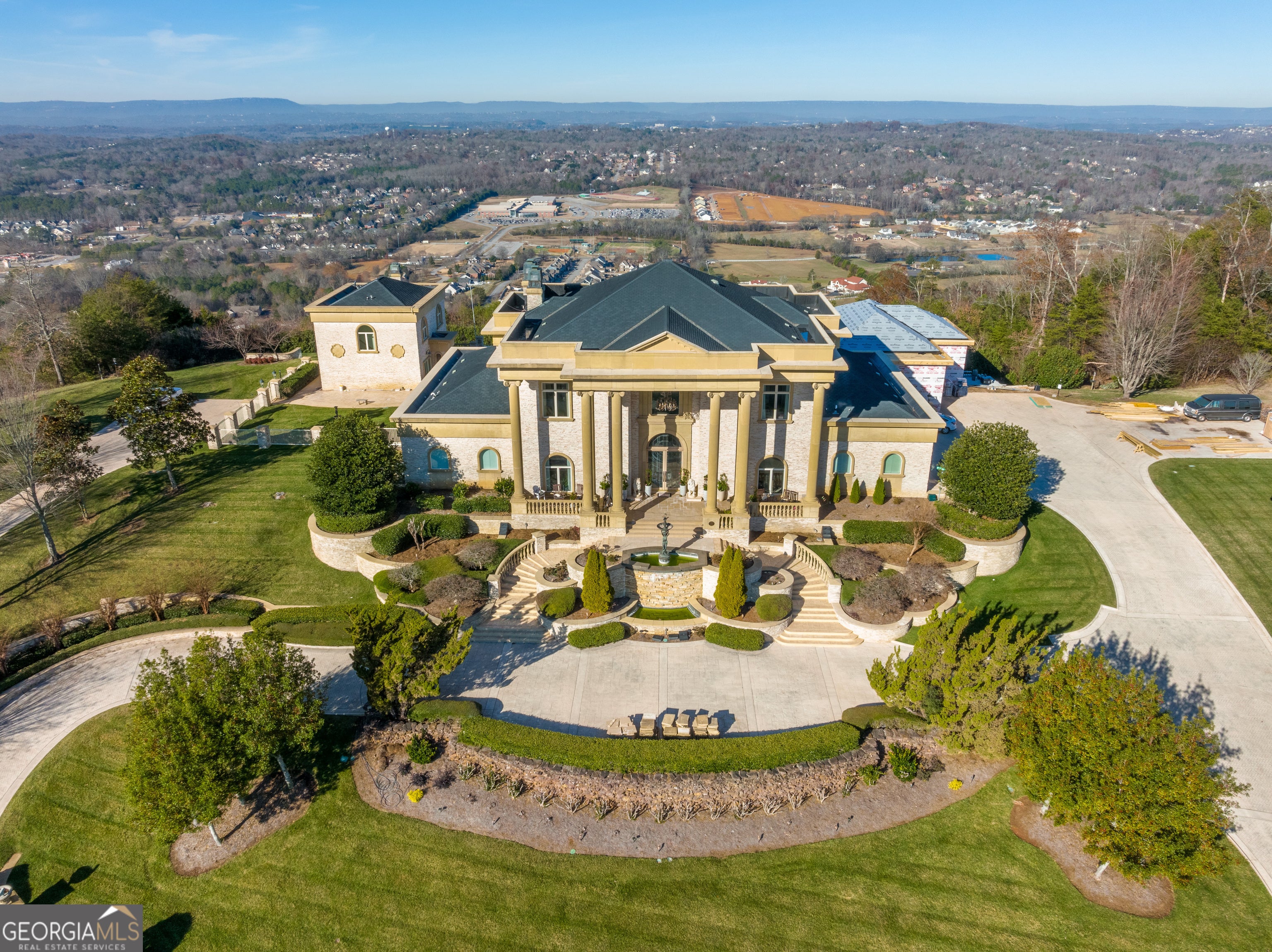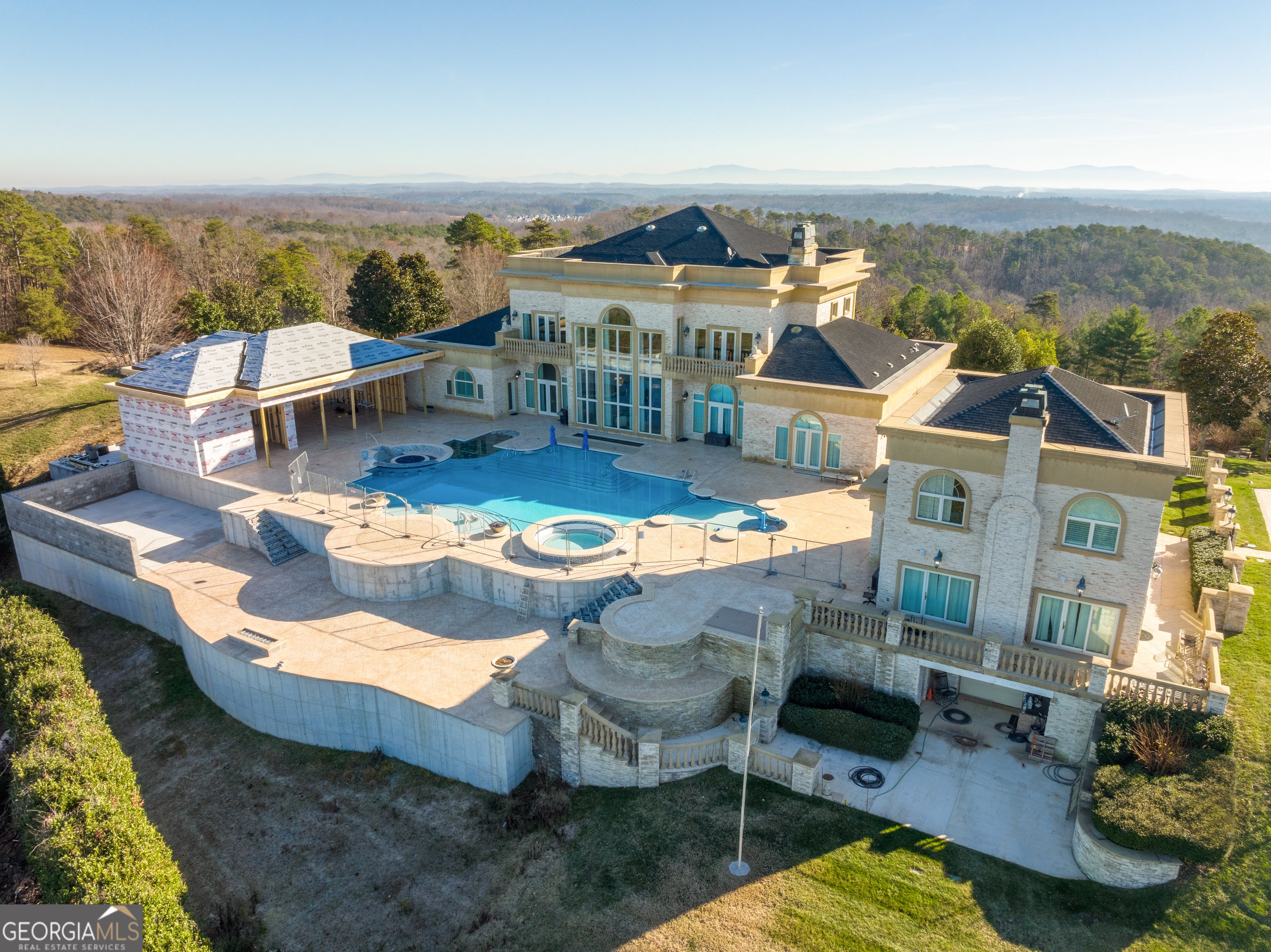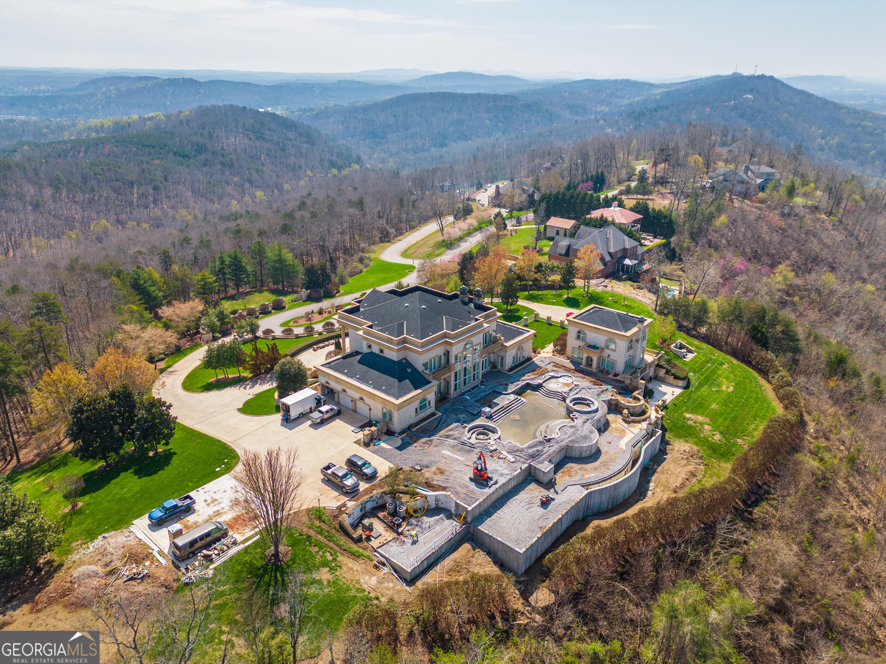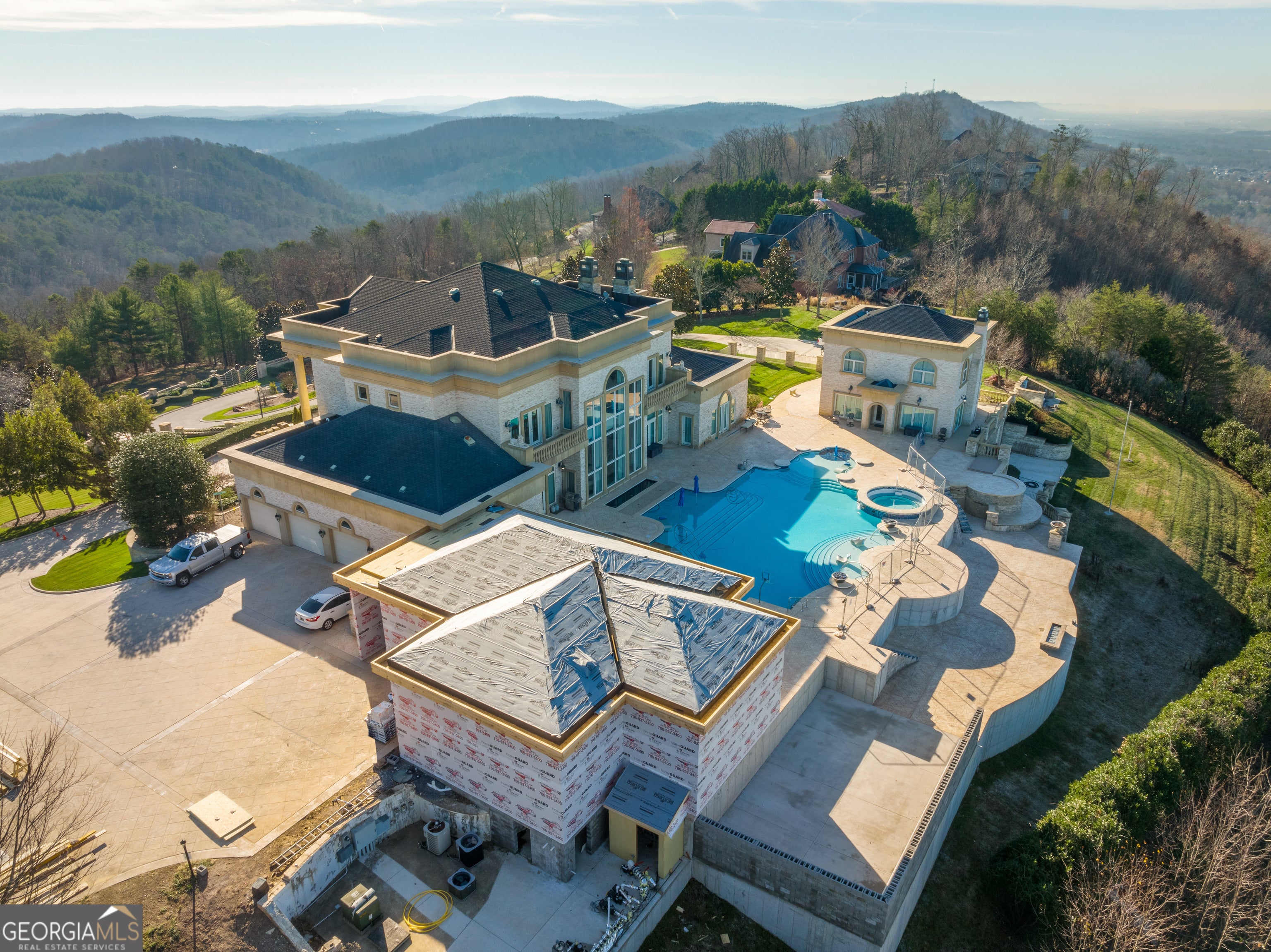 ''The Windy Hill Estate''. Prime Ooltewah, TN location. Gated privacy. Breathtaking views. ''Heavenly Views'' A rare find to say the least. Endless southeastern views of ''The Horizons,'' and/or southwestern views Lookout Mountain and city lights. Eleven acres at the top of White Oak Mountain, at the end of a cul-de-sac street. This luxurious estate features elegance and comfort (built like a fortress). Quality custom built featuring the finest craftmanship of stone throughout the estate (inside and outside). Main house consists of 8800 Sq Ft. 5 bedrooms, 5.5 baths. Luxurious master suite and luxurious master bath with his and hers walk in closets all on the main level. Soaring high ceilings throughout. Beautiful and/or elegant marble staircase thereby showcasing a grand chandelier. Elegant 2 story foyer. Elevator. Open floor plan features a piano bar that includes a wet bar, dishwasher, and ice maker. Separate dining room, family room, separate sitting room (living room), custom butler's pantry which features a dishwasher, ice maker, and sink. Breakfast room that features a Scenic City view. Second level foyer overlooking the grand marble stone staircase, along with the front entry foyer and at the same capturing eastern and western view. 5th bedroom is currently customized as an office with custom built-in cabinetry. All bedrooms feature full bathrooms. Custom, gourmet kitchen includes a Thermador gas cook top with warming shelves, Thermador double (wall) ovens and side by side built-in Sub-Zero refrigerator and freezer. Island with second sink and Kitchen Aid dishwasher. Main house features side rear entry attached 3 car garage. Large laundry room with sink, custom cabinets, built-ins, and pull-outs galore. Plantation shutters throughout. Custom trey ceilings throughout. House consist of Pella Windows and Doors. Lush landscaping with water fountains, flower beds, and retaining walls. The overall layout and/or presentation is simply elegant. The separate guest More...house consists of 2400 Sq Ft, 2 bedrooms, 2.5 baths, which includes panoramic views. The grand design outdoor entertainment area has too many features to mention in doing the subject justice. Multi-level pool side features are nothing less than spectacular. The grandeur display of quality and custom marble features is breathtaking. The pool and pool house features are all new and/or under construction and near completion. Pool side entertainment features are incredible: Unite (with pebble tech) heated pool and hot tub. Pool features zero entry and tanning deck 1 & 2. Two badu jets. Swim up bar to fire pit with custom sunken seating. 2 accent fire bowls flanking the pool side. Poolside basketball goal. Custom Mushroom foundation. Pool house/outdoor kitchen equipped with state-of-the-art appliances, allowing you to entertain guests with gourmet meals. All sports court includes basketball and pickle ball courts overlooking the western brow with scenic city view. The pool house features a theater room, a wine cellar room, and a full bathroom along with a gourmet kitchen and grilling with open air full retracting sliding doors to the pool, thereby capturing the scenic city, brow front views. Perfect for hosting poolside parties and enjoying a vibrant outdoor atmosphere. Providing endless entertainment options for you and your guests within this luxurious back yard oasis. All of the water features create a soothing ambiance. LED lighting creates an enchanting nighttime pool atmosphere with fire bowls, mushroom fountains, and waterfall via an integrated hot tub along with many customized features, all overlooking breathtaking views, yet with seclusion and tranquility. A private retreat with resort inspired luxuries.