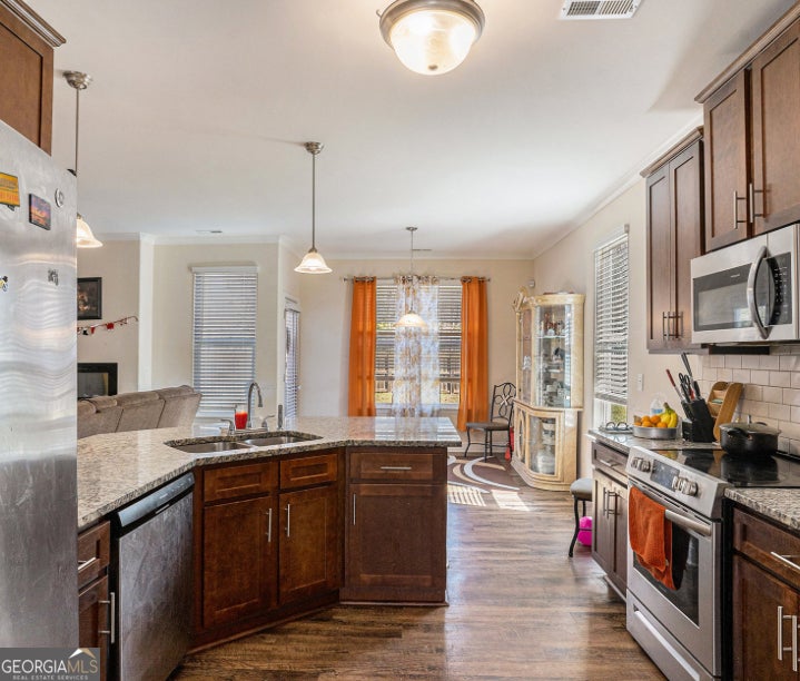 Make this charming home yours! This floor plan has an in-law/guest suite with full bath on the first floor. The other 3 bedroom and 2 full bathroom are on the second floor.The flow of this open floor plan this home offers space for a family that likes to blend in door and out door entertainment.The dinning, kitchen and breakfast area flows seamlessly from the front door and the adjoining foyer area sweeps you through to the great room. The kitchen is open and has a breakfast bar with granite countertops and warm colored wood cabinets that makes the kitchen a joy to cook in and entertain from. Stainless Steel Appliances come with the house making this a move in ready HOME! The windows open up the living room space maximizing the open flow of the first floor living area. The Primary Suite and remaining bedrooms are on the second floor where upon ascending the stairs you are greeted with a large loft area that can be used for anything you can imagine. The other bedrooms larger rooms with walk in closets. The Primary suite has room for a California King and its own living space sitting room. The Primary ensuite has granite counter tops, doubly vanity sinks, a walk-in shower, large soaking tub for a private retreat. There is a separate linen closet in addition to the large walk in closet.