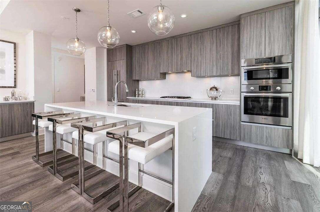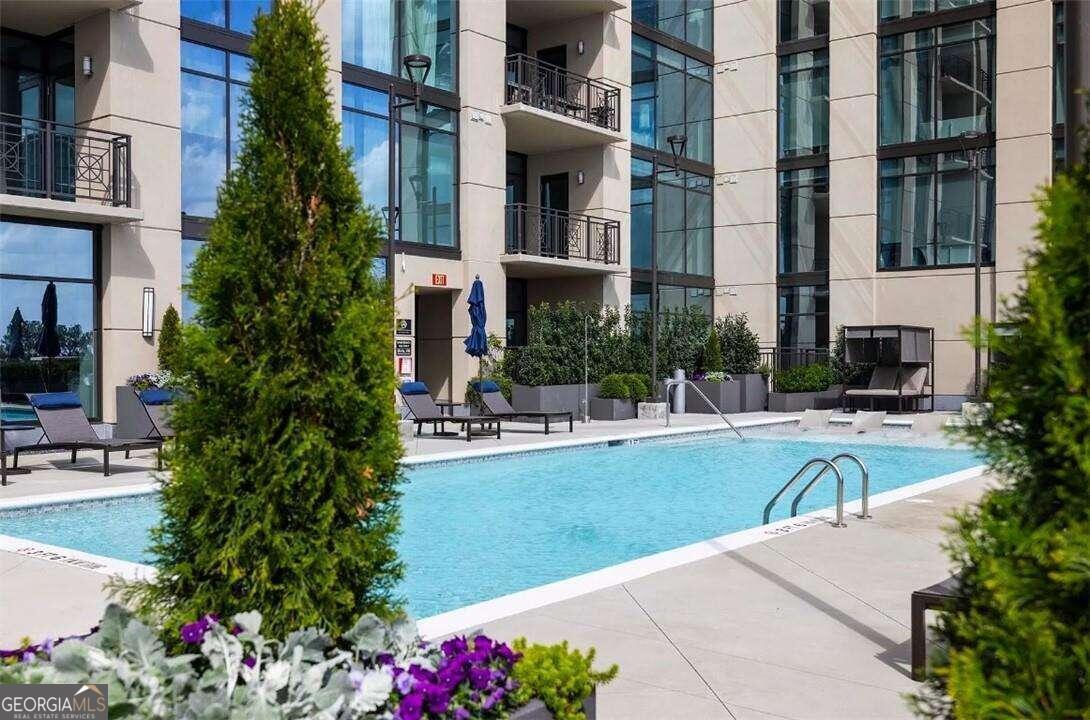 Saltwater pool with sunbathing ledge on spacious terrace level featuring exquisite skyline views. Outdoor amenity deck with cabanas, fire pit, fireplace, grilling stations, plentiful seating and lush landscaping. Spacious two-story lobby with fireplace. 24/7 concierge staff available to assist residents, provide area information, receiving packages and dry-cleaning. Climate controlled personal storage. Large kitchen islands with waterfall quartz. Floor to ceiling windows. Beverage center with wine shelving.