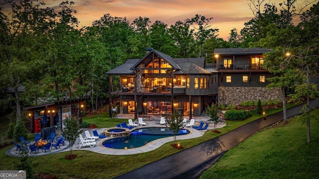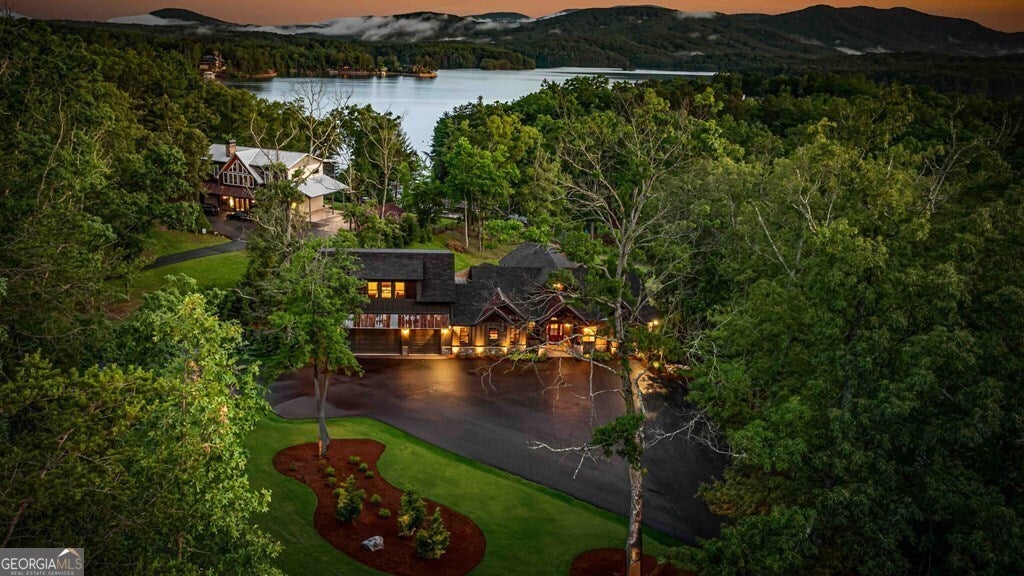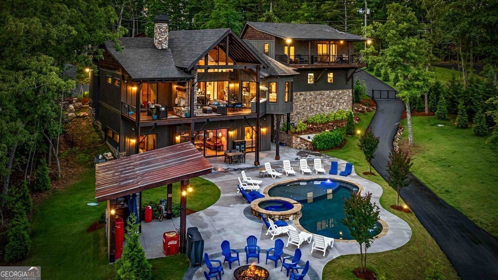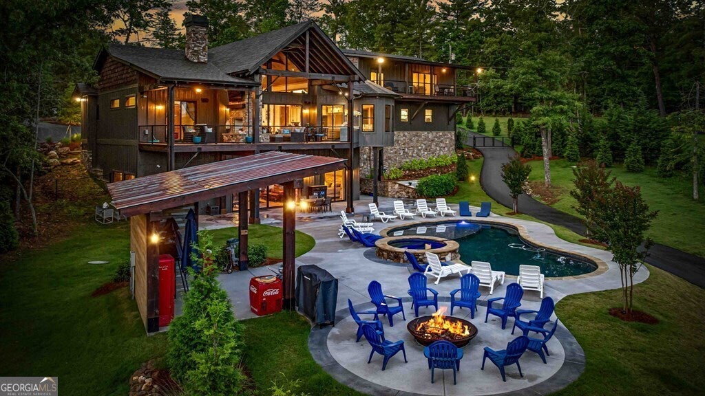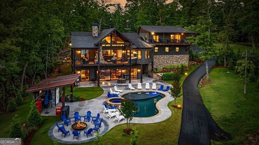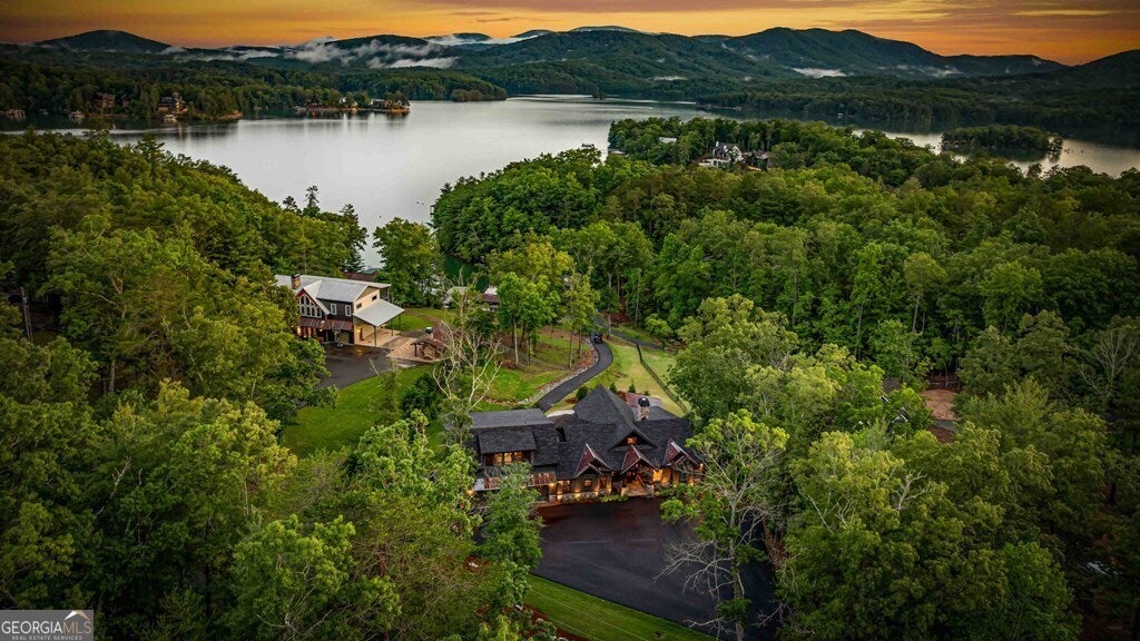 Indulge in the epitome of luxury living at this extraordinary lakefront sanctuary! A grand entrance welcomes you with a majestic floor-to-ceiling stone wood-burning fireplace & intricate architectural & rustic details that frame panoramic views of Lake Blue Ridge & the majestic mountain landscape. Enter the heart of the home, where a gourmet kitchen featuring Viking appliances, an enhanced butler's pantry, & unmatched attention to detail await. With six luxurious ensuite bedrooms spread across both levels of the main residence, each guest is pampered with unmatched comfort. The primary suite is a haven of extravagance, boasting a zero-entry tile shower, heated flooring, a lavish jetted tub, and the ultimate touch of refinement - a bidet for unparalleled luxury. Enjoy entertainment without limits in the lower level, where a full wet bar seamlessly transitions to an outdoor kitchen, a serene pool, a rejuvenating hot tub, a delightful pool house with a half bath, and a captivating fire pit area. For additional accommodations, the three-car garage hosts a sophisticated 2-bedroom, 2-bathroom apartment above, perfect for guests or staff quarters. Live the pinnacle of luxury with premium amenities such as a whole house generator, a private fenced backyard catering to both privacy and pet-friendly needs, and a newly installed double-decker Wahoo boat dock complete with a 2022 Barletta 24' pontoon boat. Additionally, a full RV hook-up including 50 amps, water, and sewer connections adds further convenience and versatility to this remarkable property. Offered fully furnished, this residence presents a compelling opportunity as a successful short-term rental, blending unparalleled comfort with exceptional investment prospects. With a host of exceptional extras included by the homeowner, this home promises a lifestyle of unrivaled opulence and sophistication that surpasses all expectations.
