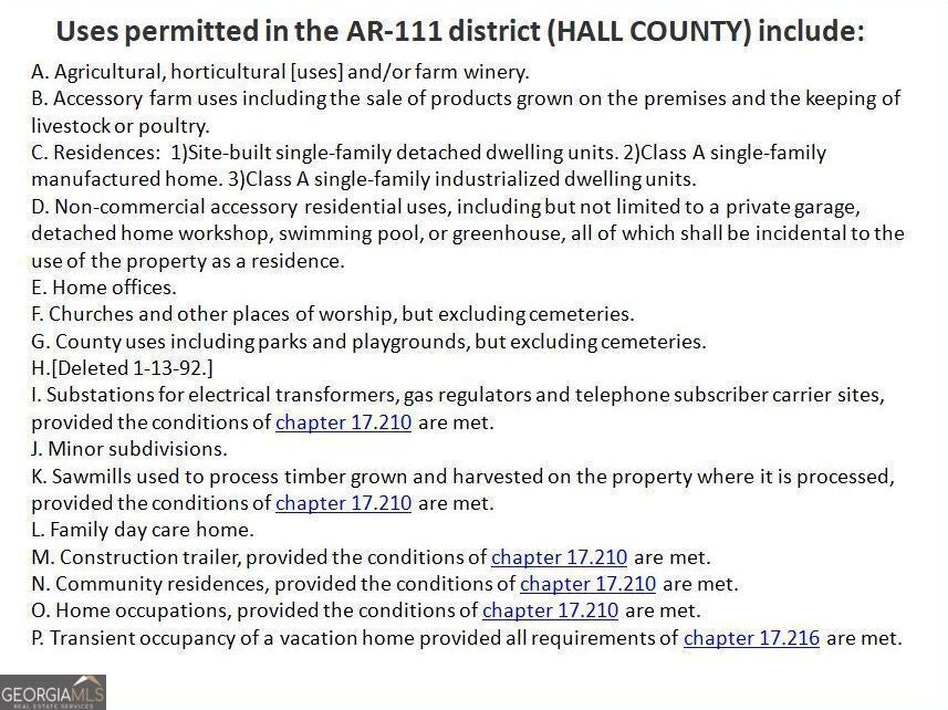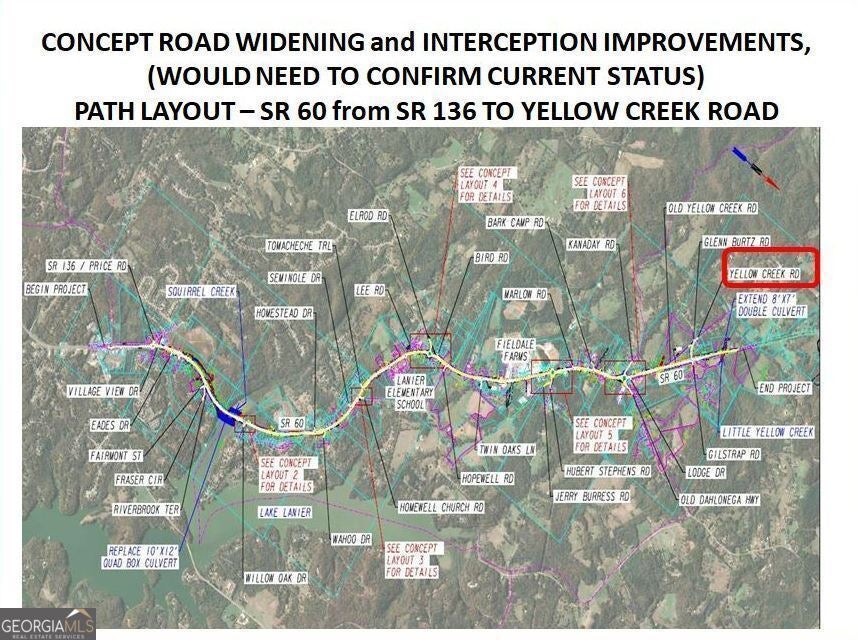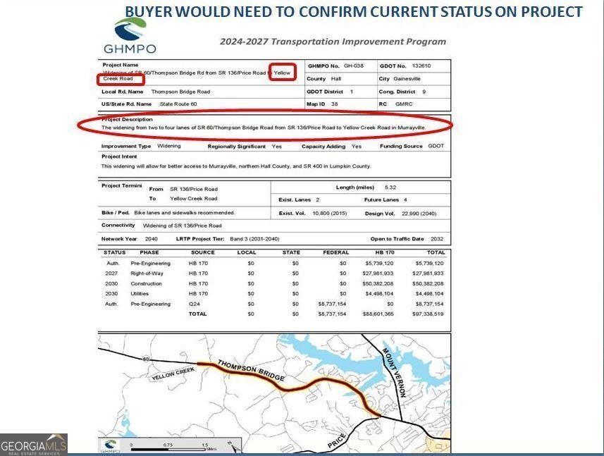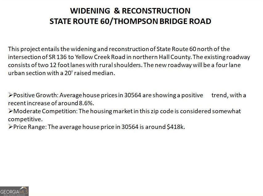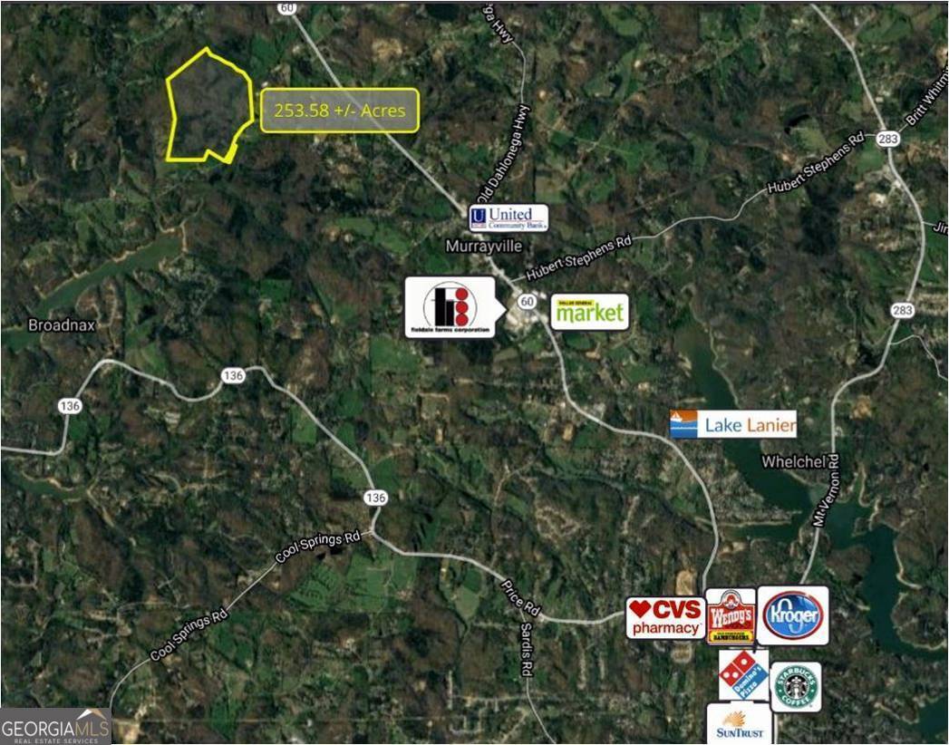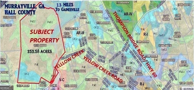 This untouched 253.58 acres of Agricultural land, located in north Hall County is on the trajectory of development. The subject property is located in a rural, yet beautiful and desirable area in North Hall County with quick and easy access to Highway 60 (Thompson Bridge Road) as well as GA 400 to the north. The property boasts Yellow Creek, which flows through the eastern portion of the property. The property has rolling to steep topography producing some beautiful potential home sites with views. There are two ridge lines on the property which show the highest elevations of 1,234 and 1,266 and the lowest elevations are at the creek at roughly 1,080. This location is the end point of a 2024-2027 Transportation Improvement Program, widening the route (6 miles) from 2 lanes to 4 lanes, along with a 20' raised median. The expansion along State Route 60 or Thompson Bridge Road to Yellow Creek Road will positively impact 165 parcels. This acreage consists of wildlife, trees, creeks, springs and more. A wildlife haven, this land attracts deer, black bears, peregrine falcons, red-tailed hawks and owls, to name a few. The property, currently zoned AR-111 is under a CUVA agreement which expires January 2026. Stipulations of any offer is that only upon expiration of the CAVU can any structure be built on the property. Within 2.7-10 miles of this property, you will find Sweet Magnolias Senior Care, Gold Leaf Pet Resort, Kroger Supercenter, Starbucks, the city of Murrayville, Blue Mountain Vineyards, Georgia State Route 60, and the new Northeast Georgia Medical Center. Also, enjoy the proximity to several area attractions: 1) Yonah Mountain Vineyards (25 miles from subject property) a scenic drive offering wine tastings and events in a stunning setting. 2) Smithgall Woods State Park (28 miles from subject property) perfect for hiking, fishing, and nature excursions. 3) Helen, GA (29 miles from subject property) a charming Alpine-inspired village with dining, shopping, and entertainment. 4) LAKE LANIER Park (29 miles from subject property) offers a resort complex which includes hotels, water parks, golf course, conference and meeting venues, beaches and boat docks as well many more amenities.