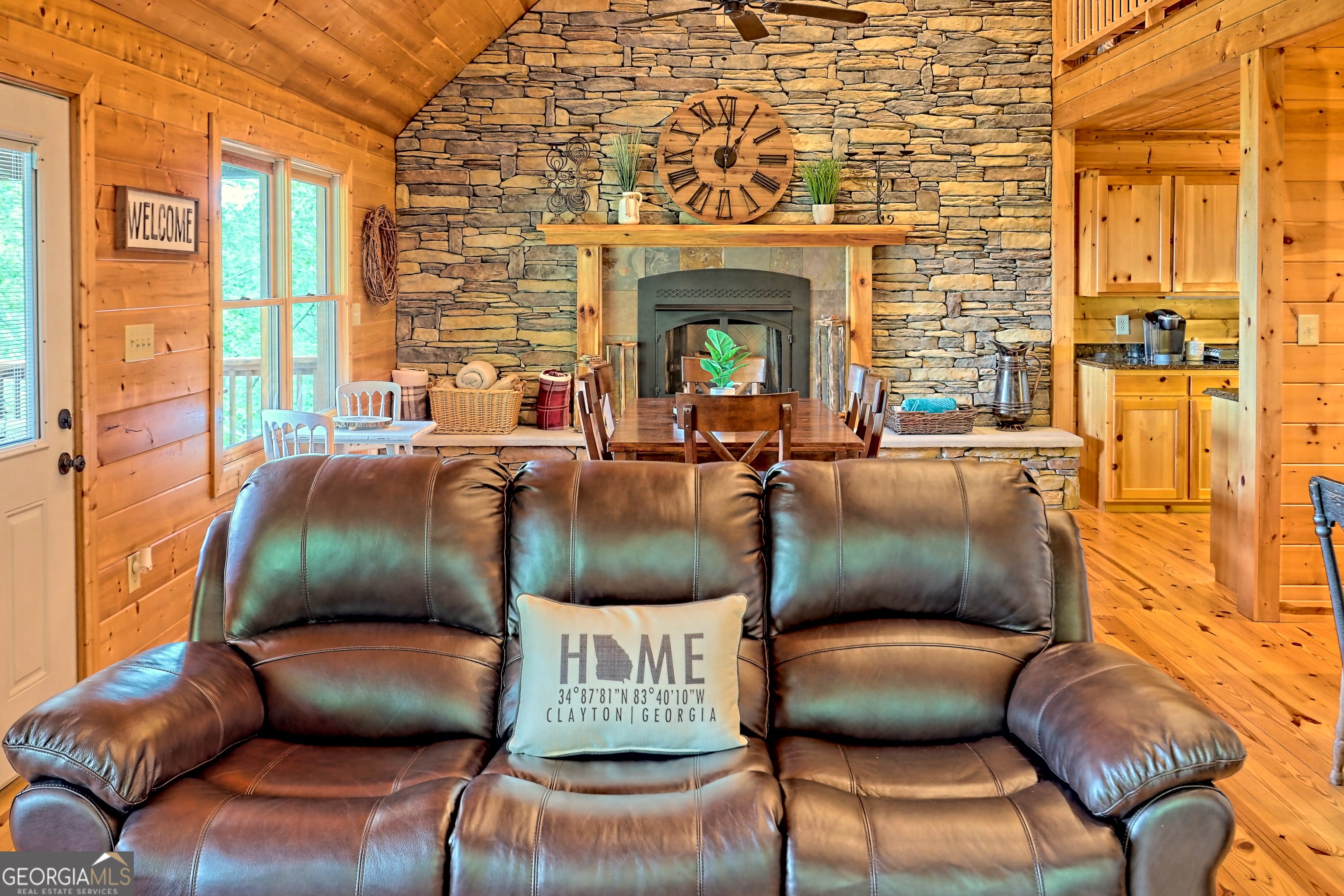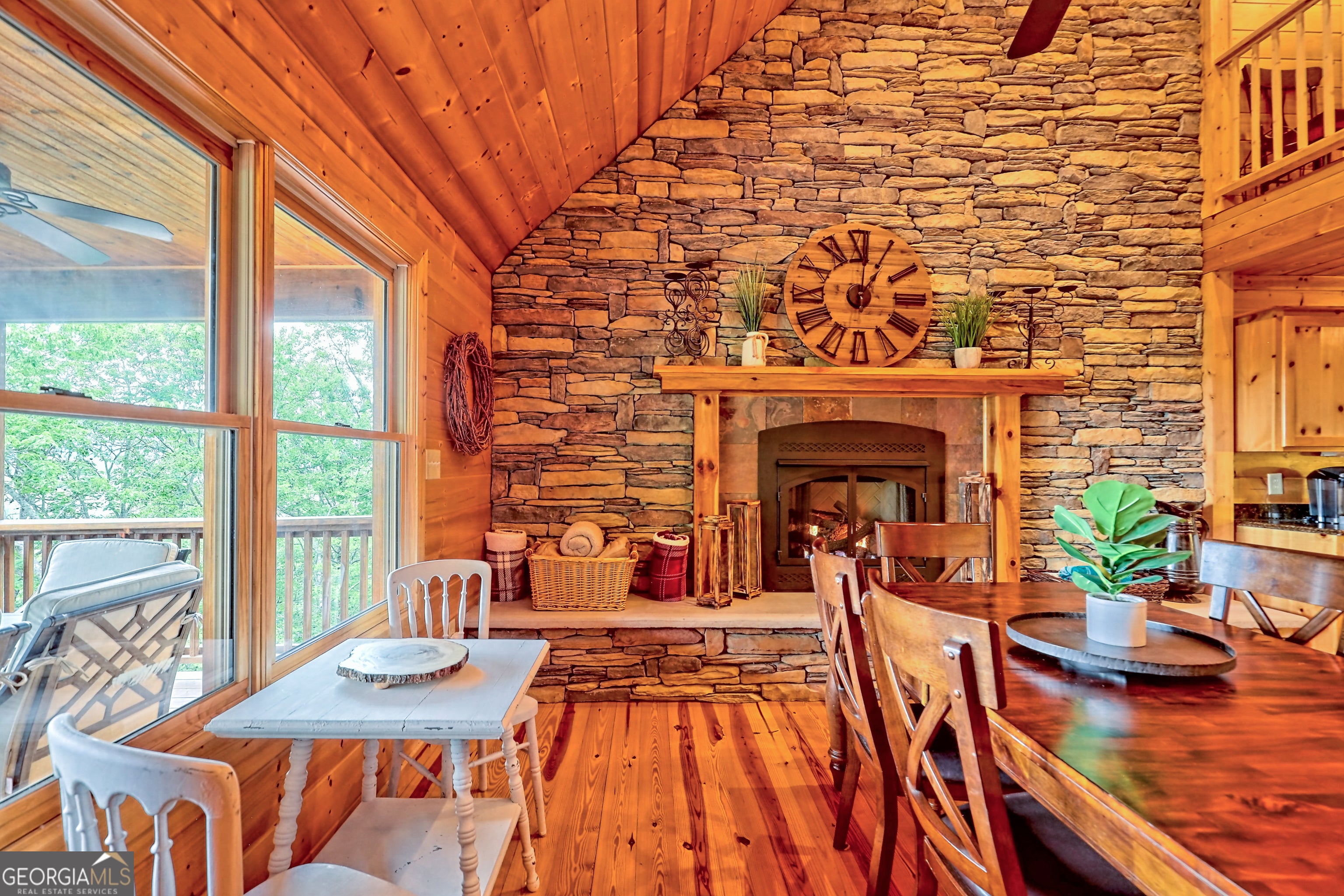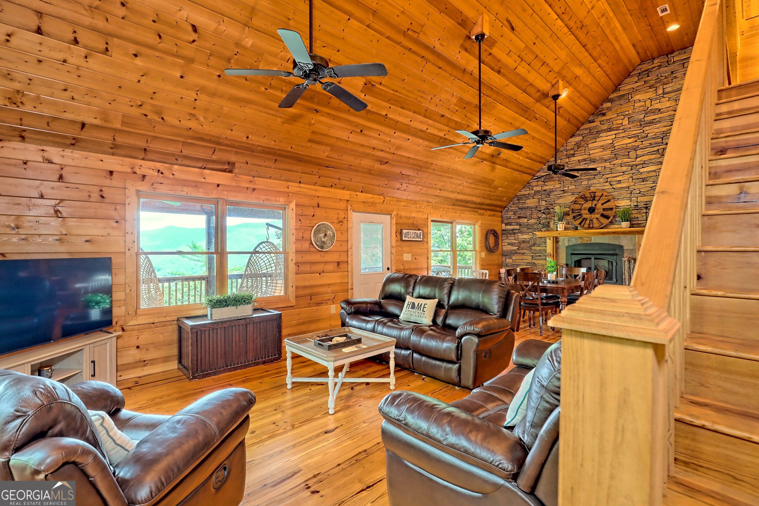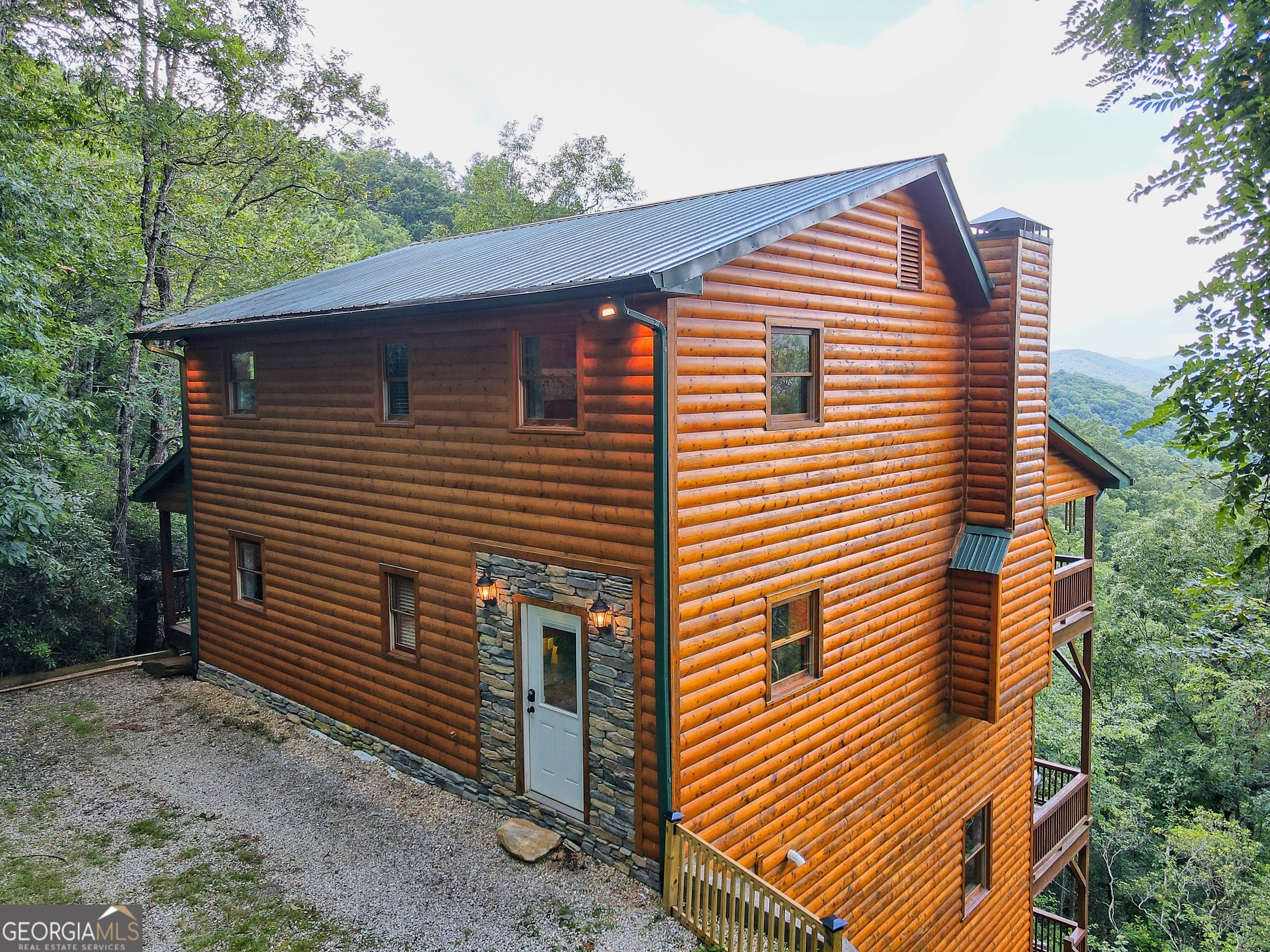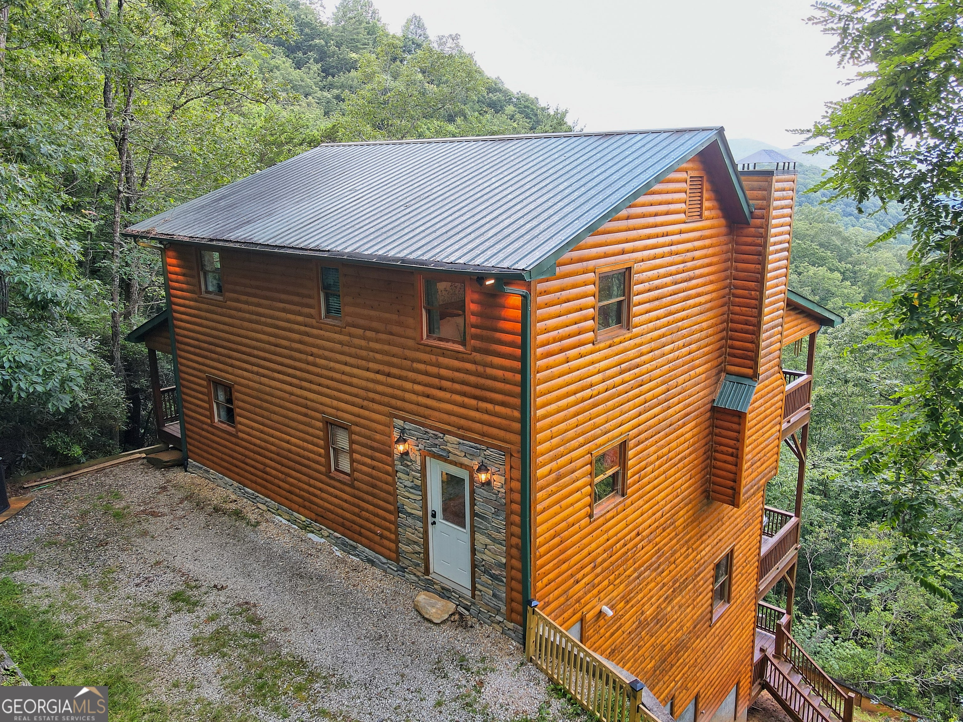 This beautifully maintained 3-bedroom, 3-bathroom [+ flex space for hobby room, office or game space] mountain cabin with a VIEW is ideally located less than 10 minutes from downtown Clayton, offering the perfect balance of convenience and tranquility. While just minutes from the heart of downtown shops, galleries and restaurants, you'll also enjoy easy access to the area's renowned outdoor attractions, including hiking trails, waterfalls, horseback riding, whitewater rafting and more. The cabin is also within close proximity to top-rated Rabun County School District, adding to its appeal for families. Custom built in 2007, this four-story cabin has been meticulously maintained and offers a warm, inviting atmosphere. As you approach the home, you'll be greeted by scenic views of both the surrounding mountains and downtown Clayton, best enjoyed from one of three expansive covered decks or the quiet side porch. The main living area features an impressive custom stone fireplace with a gas insert and a beautifully crafted concrete hearth, creating a warm focal point. The living room boasts a soaring two-story ceiling and a custom staircase with a balcony, providing a sense of openness during gatherings. On the main floor, you'll find a comfortable bedroom and a full bath, complete with a custom-tiled shower, double vanities, hard surface countertops, and custom cabinetry. For added convenience, there is also a stackable washer/dryer. Upstairs, the second floor offers two additional spacious bedrooms and a full bath, also featuring custom tile work, double vanities, and high-end finishes. If you're in need of additional space, the lower level provides a full daylight basement, perfect for a game room and entertaining space, as well as another room for flex space. This level also includes a full bath with a tiled shower and bathtub combination. With its prime location, just a 2-hour drive from Atlanta and proximity to Highlands, NC, this cabin is ideal for those seeking a retreat with easy access to both nature and nearby towns. Rabun County's beautiful lakes-Rabun, Seed, and Burton-are also within a 20-40 minute drive. This one-of-a-kind cabin is a must-see for anyone looking to experience the best of mountain living in the North Georgia area. Please make plans to schedule appts to view, as this is an active ST rental.