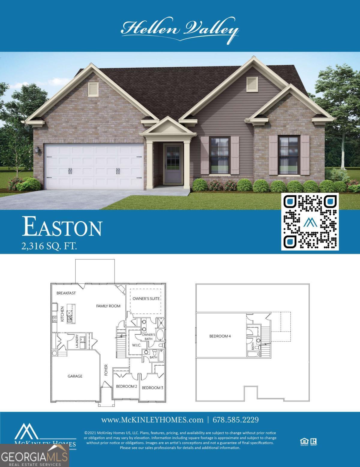 Welcome to Hellen Valley by McKinley Homes! Braselton's most exciting new home construction community. We are located on Hwy 53 next to Stovall Landscaping just 6 minutes East of I-85. We are featuring our EASTON RANCH plan WITH OVERSIZED BEDROOM AND FULL BATH UPSTAIRS. We offer the best standard features of any builder which include hardwoods in main living areas, SS appliances, granite in kitchen and full baths, 42" shaker cabinets, crown molding, 5" trim, blinds on front of home, fireplace, tiled floors in full baths, tile master shower, dual sinks, and much more. We offer some of the largest lots in the area at approximately 80ft wide lots and .33 acres. Come and see our largest RANCH floor plan. ***THIS HOUSE IS TO BE BUILT AND READY TO CLOSE MAY 2025. ***STOCK PHOTOS ARE NOT THE ACTUAL EXTERIOR AND INTERIOR DESIGN COLORS AND SELECTIONS***