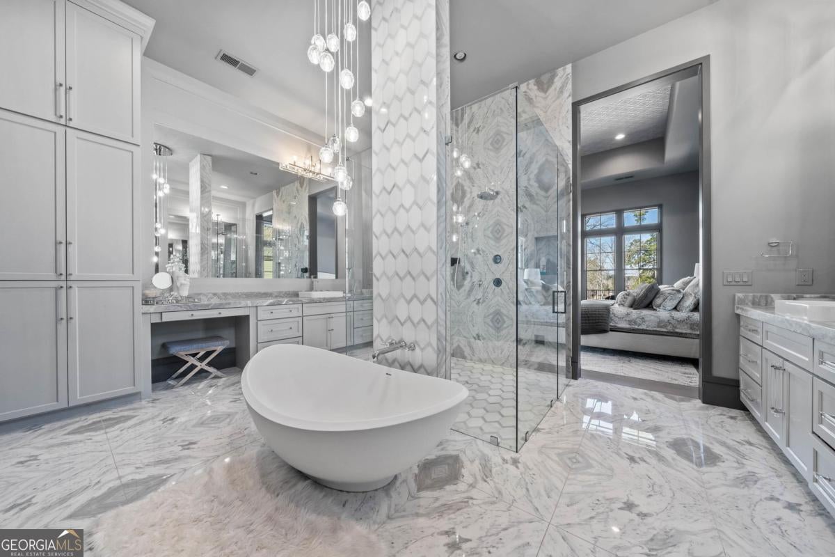 - Interior FeaturesDouble Vanity, High Ceilings, Master On Main Level, Pulldown Attic Stairs, Separate Shower, Soaking Tub, Tray Ceiling(s), Vaulted Ceiling(s), Walk-In Closet(s), Wet Bar, In-Law Floorplan, Tile Bath