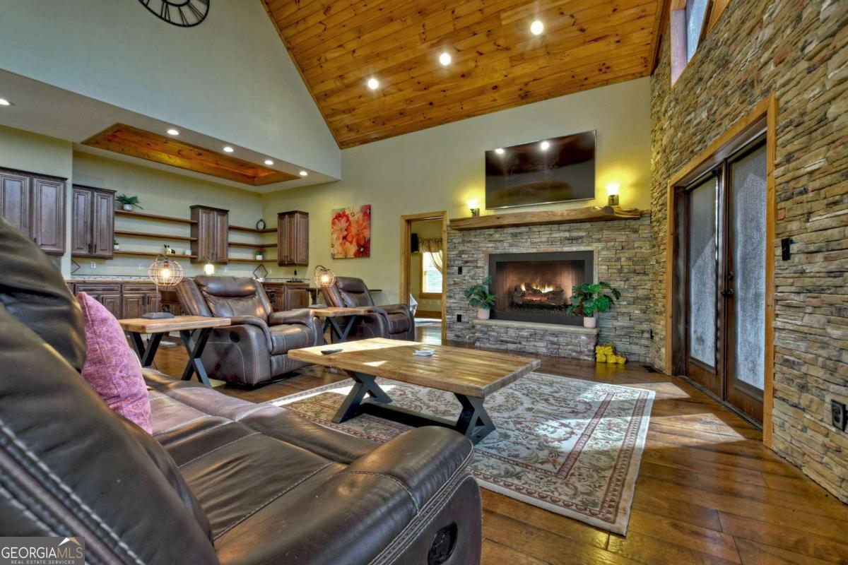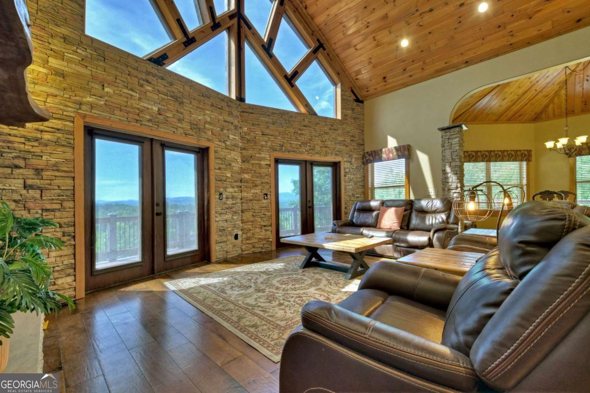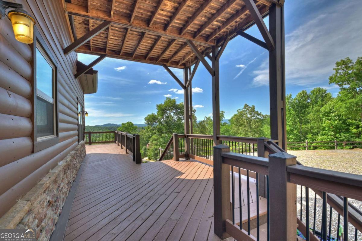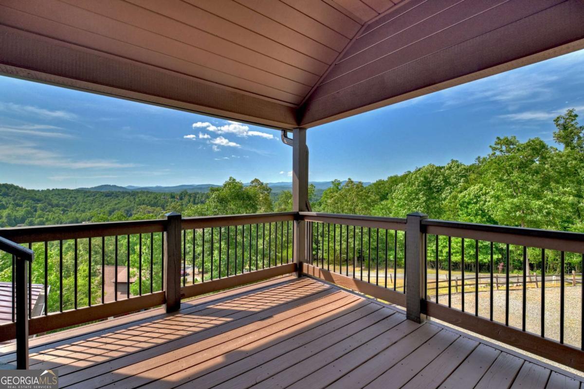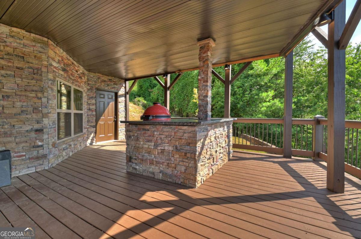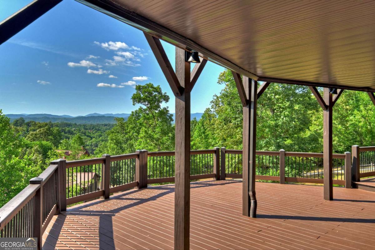 Breathtaking long range mountain views await you. Experience the charm of rustic luxury in this tastefully furnished and well-appointed cabin. Step into the impressive foyer, which offers ample storage. The interior boasts exceptional finishes and attention to detail. A stunning stone wall of windows elegantly captures the gorgeous views from the open-concept living, dining, and kitchen spaces, which also features a wine bar. Equipped with high-end appliances, stylish countertops, modern cabinets and a handy pot filler faucet, the kitchen is a chef's dream. The upper-level primary suite includes a cozy sitting room, a private balcony, and a convenient stackable washer/dryer. On the terrace level, you'll find another full kitchen, a spacious recreation area, and a contemporary media room perfect for movie nights with family and friends. Expansive decks provide an outdoor kitchen and plenty of space-both covered and uncovered-for entertaining guests. This home is practically new; though construction began in 2005, it was completed in 2023, when the certificate of occupancy was issued. Enjoy deeded creek access and a community pavilion that present endless opportunities for outdoor adventures. It is conveniently located near the delights of mountain living in North Carolina and North Georgia, including shopping, dining, trout fishing, boating, vineyards, hiking, tubing, and even Murphy's very own casino.