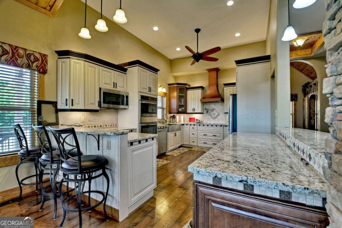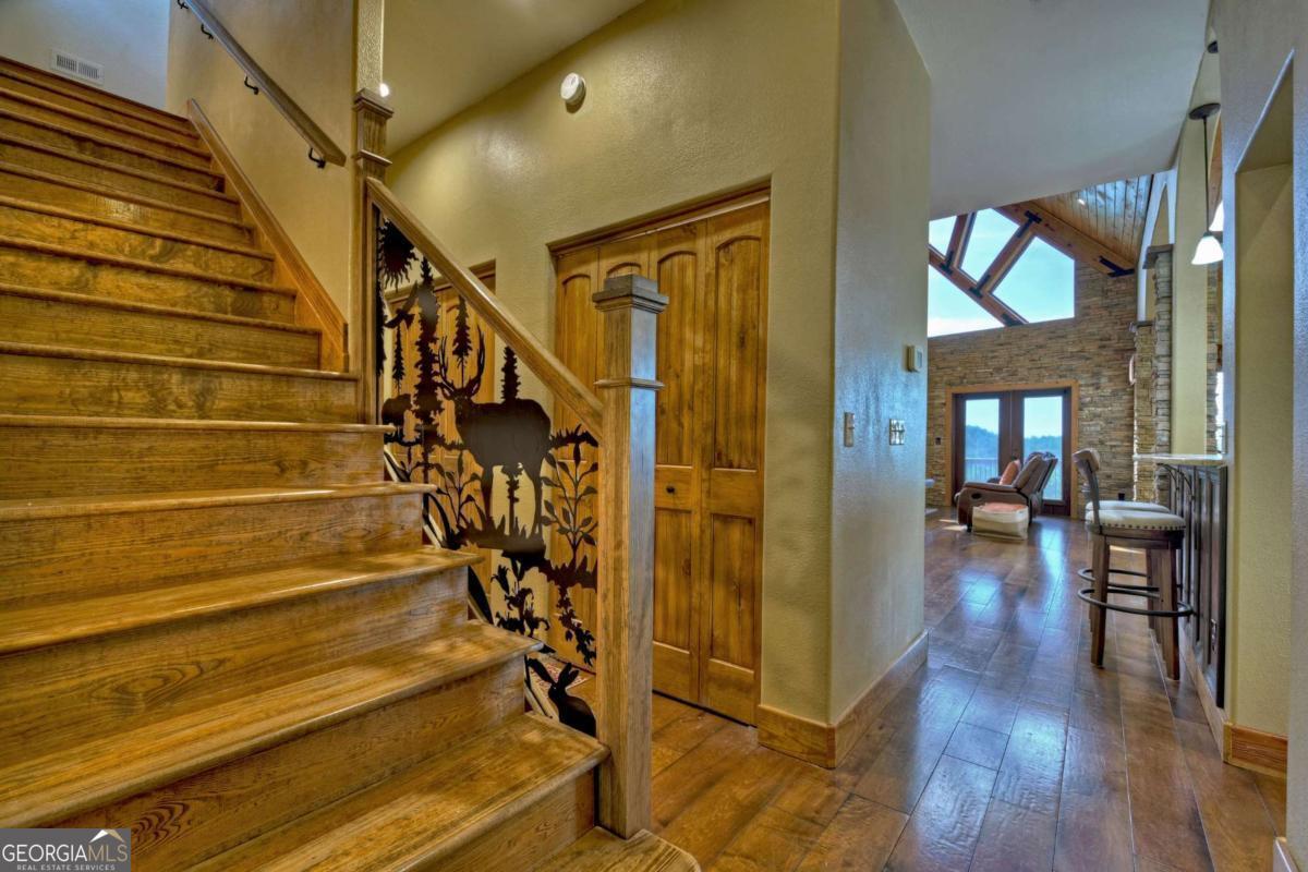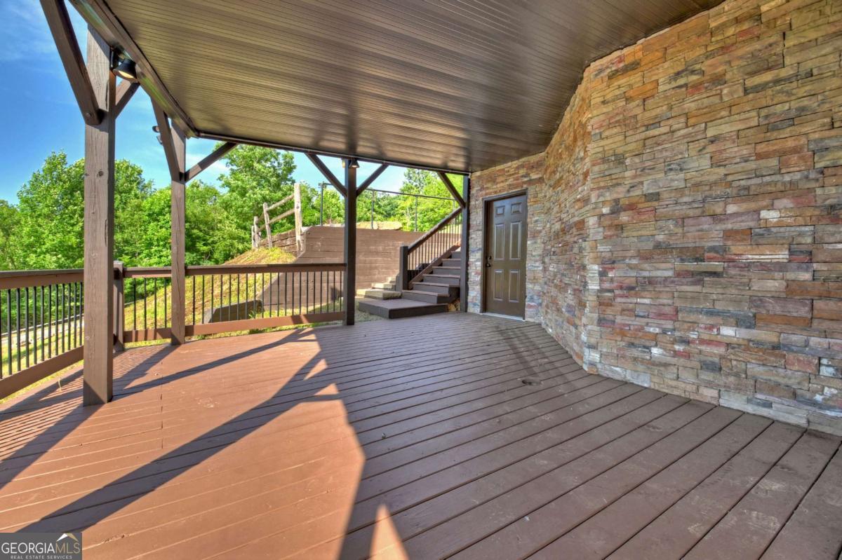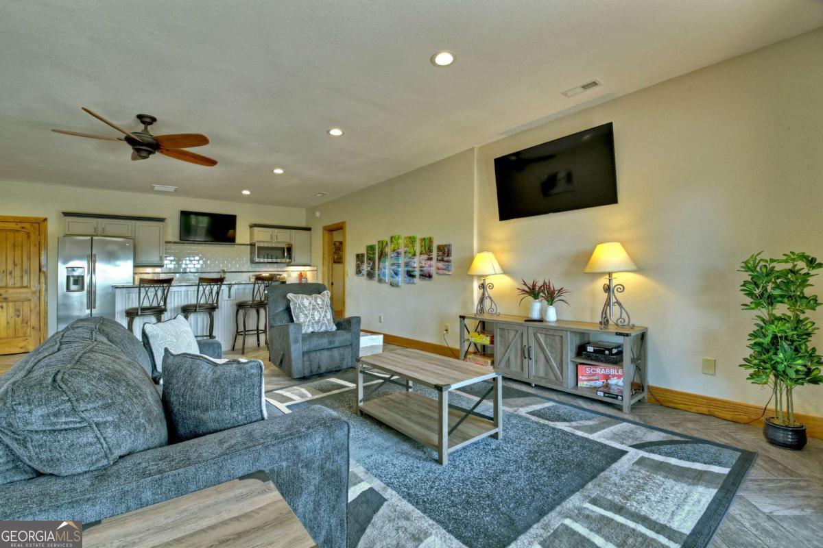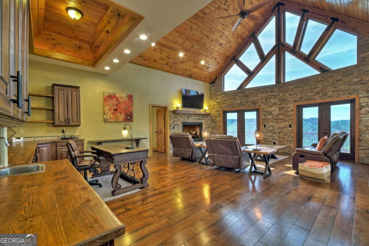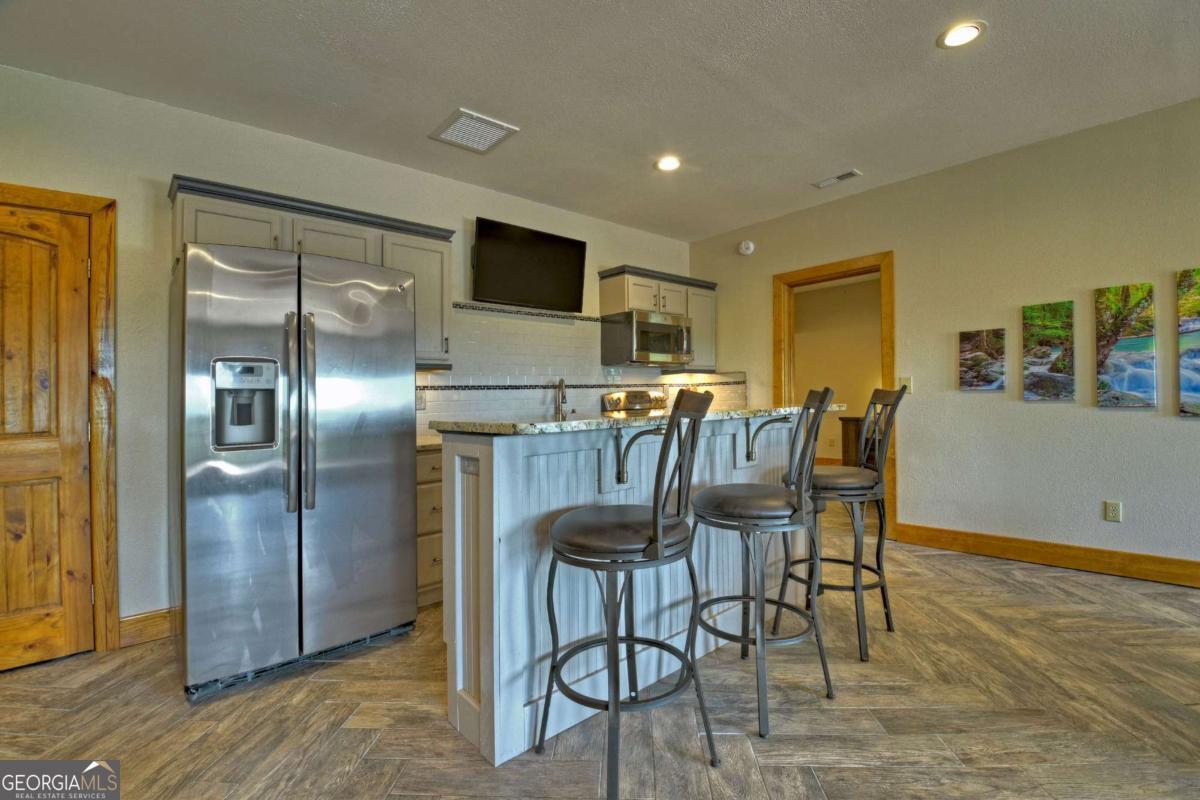 Breathtaking long range mountain views await you. Experience the charm of rustic luxury in this tastefully furnished and well-appointed cabin. Step into the impressive foyer, which offers ample storage. The interior boasts exceptional finishes and attention to detail. A stunning stone wall of windows elegantly captures the gorgeous views from the open-concept living, dining, and kitchen spaces, which also features a wine bar. Equipped with high-end appliances, stylish countertops, modern cabinets and a handy pot filler faucet, the kitchen is a chef's dream. The upper-level primary suite includes a cozy sitting room, a private balcony, and a convenient stackable washer/dryer. On the terrace level, you'll find another full kitchen, a spacious recreation area, and a contemporary media room perfect for movie nights with family and friends. Expansive decks provide an outdoor kitchen and plenty of space-both covered and uncovered-for entertaining guests. This home is practically new; though construction began in 2005, it was completed in 2023, when the certificate of occupancy was issued. Enjoy deeded creek access and a community pavilion that present endless opportunities for outdoor adventures. It is conveniently located near the delights of mountain living in North Carolina and North Georgia, including shopping, dining, trout fishing, boating, vineyards, hiking, tubing, and even Murphy's very own casino.