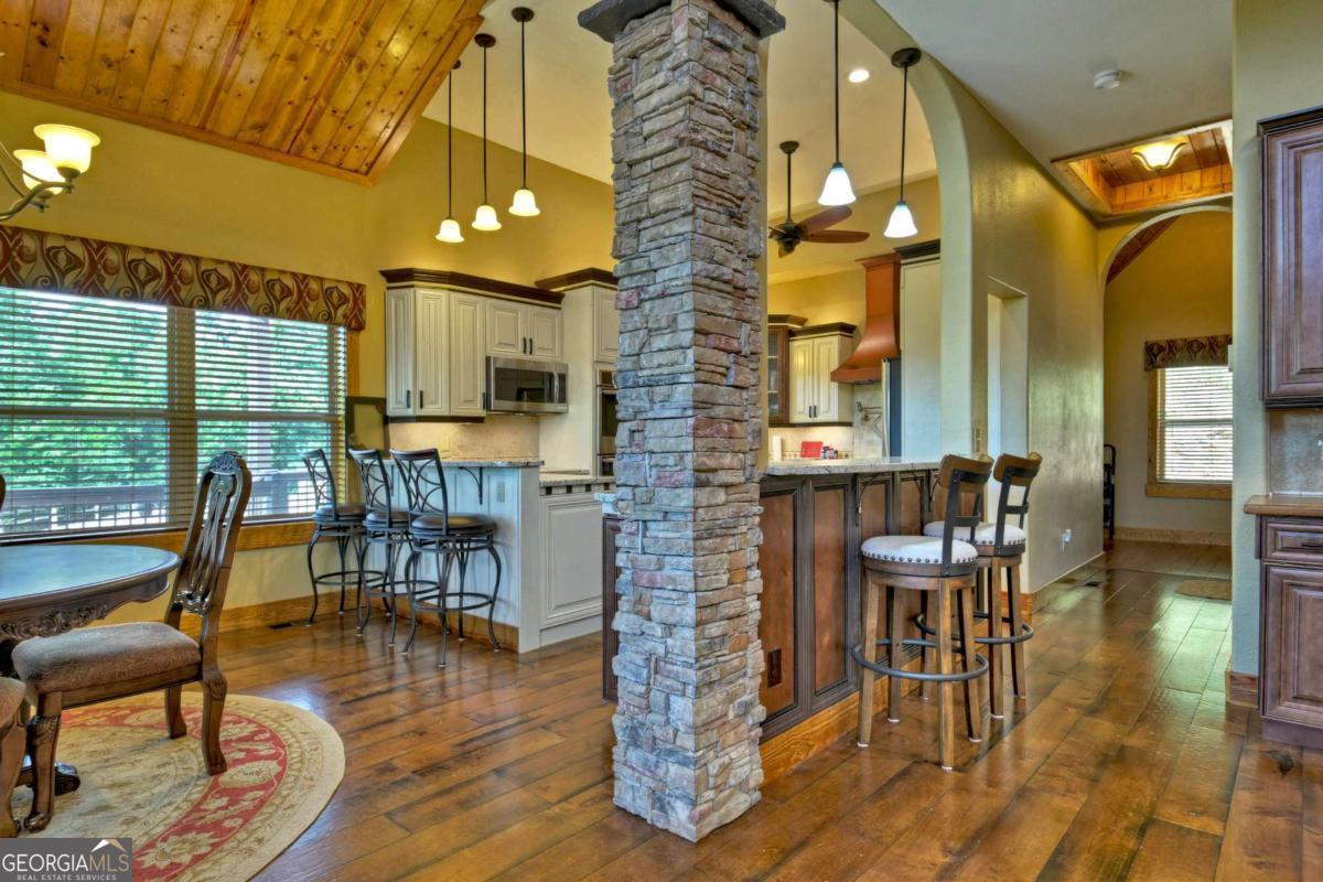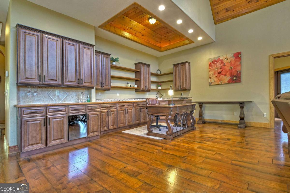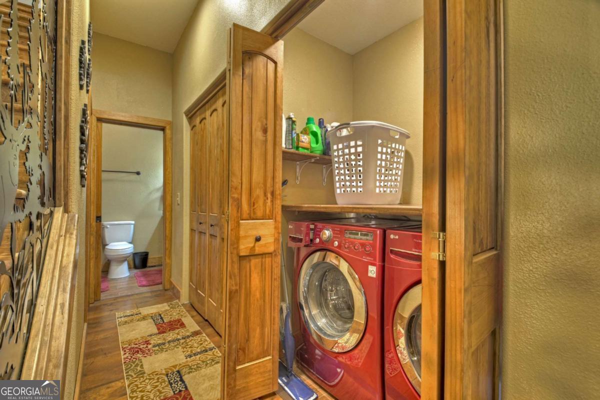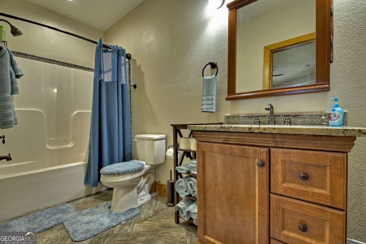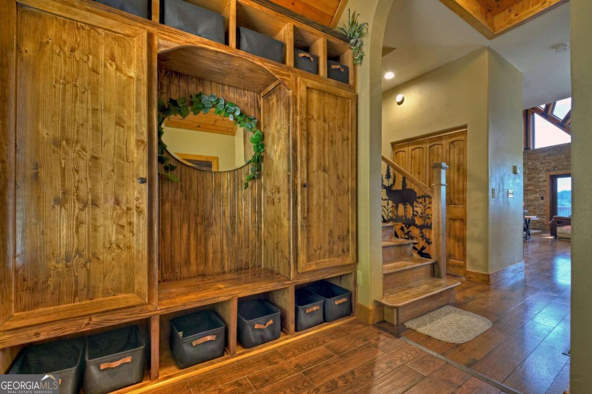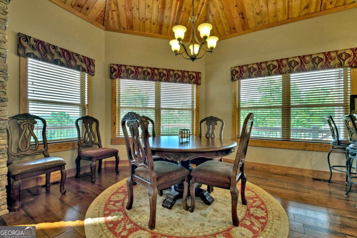 Breathtaking long range mountain views await you. Experience the charm of rustic luxury in this tastefully furnished and well-appointed cabin. Step into the impressive foyer, which offers ample storage. The interior boasts exceptional finishes and attention to detail. A stunning stone wall of windows elegantly captures the gorgeous views from the open-concept living, dining, and kitchen spaces, which also features a wine bar. Equipped with high-end appliances, stylish countertops, modern cabinets and a handy pot filler faucet, the kitchen is a chef's dream. The upper-level primary suite includes a cozy sitting room, a private balcony, and a convenient stackable washer/dryer. On the terrace level, you'll find another full kitchen, a spacious recreation area, and a contemporary media room perfect for movie nights with family and friends. Expansive decks provide an outdoor kitchen and plenty of space-both covered and uncovered-for entertaining guests. This home is practically new; though construction began in 2005, it was completed in 2023, when the certificate of occupancy was issued. Enjoy deeded creek access and a community pavilion that present endless opportunities for outdoor adventures. It is conveniently located near the delights of mountain living in North Carolina and North Georgia, including shopping, dining, trout fishing, boating, vineyards, hiking, tubing, and even Murphy's very own casino.