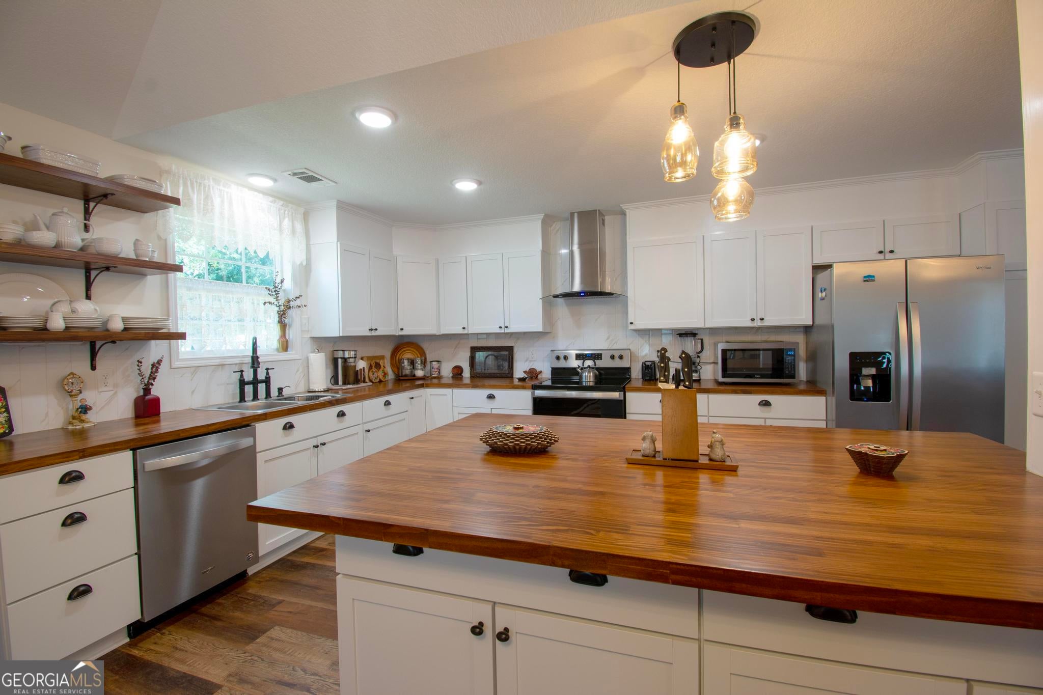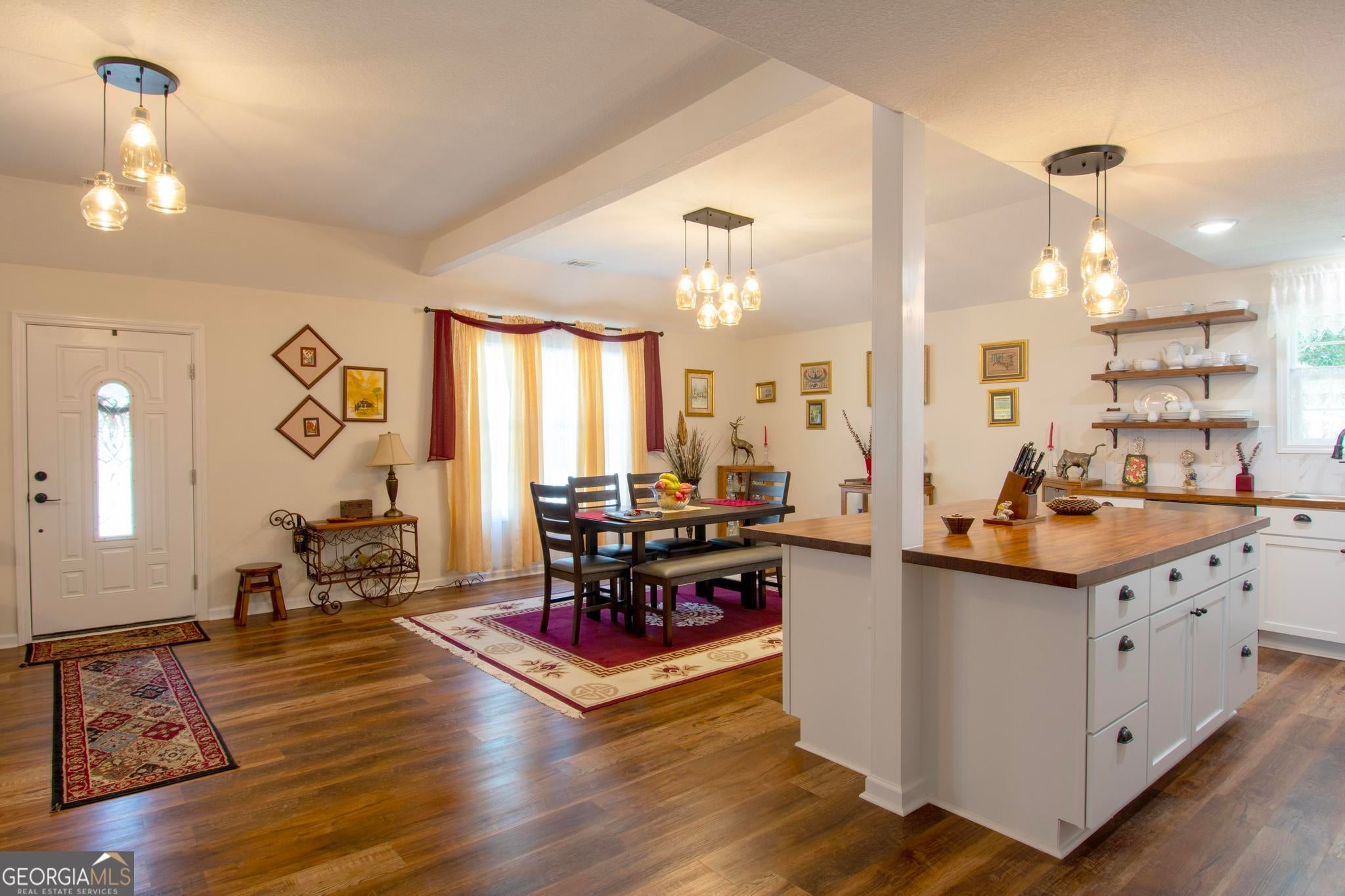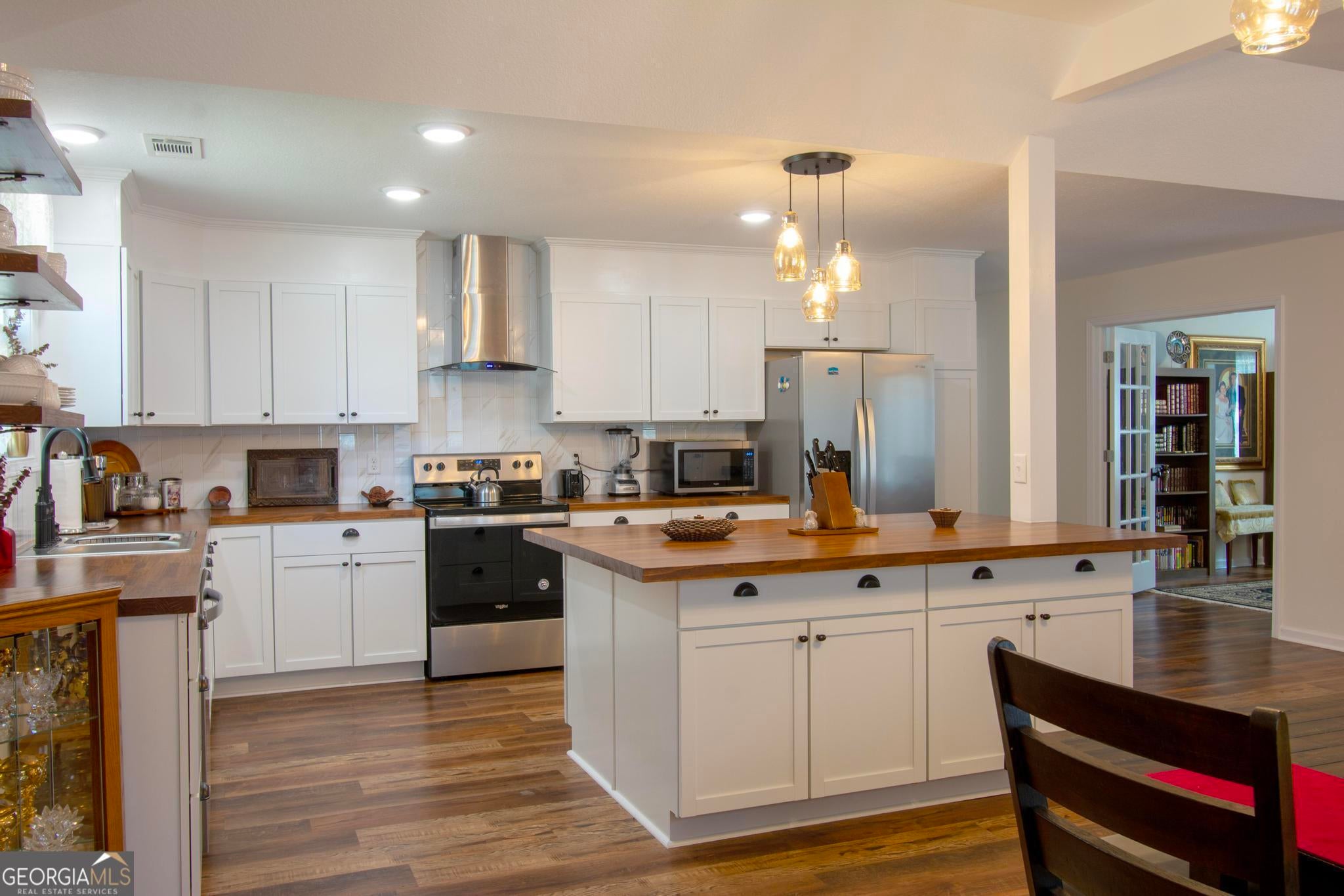 This beautiful 2,560 square foot home features an open floor plan, 3 bedrooms, 2 full baths and a flex bonus room with French glass doors that could easily become a home office, study/library, kids playroom, home gym or converted into a fourth bedroom. The open-concept living room and dining area have 11-foot high trey ceilings. The kitchen features butcher block counters, new cabinetry, floating shelving, plentiful storage and prep areas, tiled back splash, separate pantry, new stainless steel appliances, glass free-standing vented hood and a large butcher block table. The two secondary bed rooms are spacious and each have two generous closets and share a roomy full bathroom that features a floating double vanity, a wall of floating shelving and a separate dressing mirror. The large primary bedroom can easily accommodate a king or Cal-king and has a walk-in closet. The primary ensuite full bath features an over-sized tiled walk-in glass shower with a sitting area, a large elegant stand-alone soaking tub, and a dual vanity with antiqued fixtures. The rear combination laundry and mud room features new Samsung front-loading washer and dryer on pedestals. The halls are wide to accommodate wheel chair accessibility as well as the outside entrances. All plumbing, electrical, appliances, and HVAC are new.