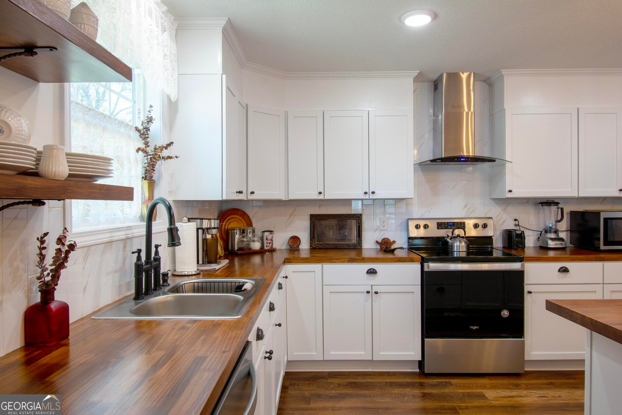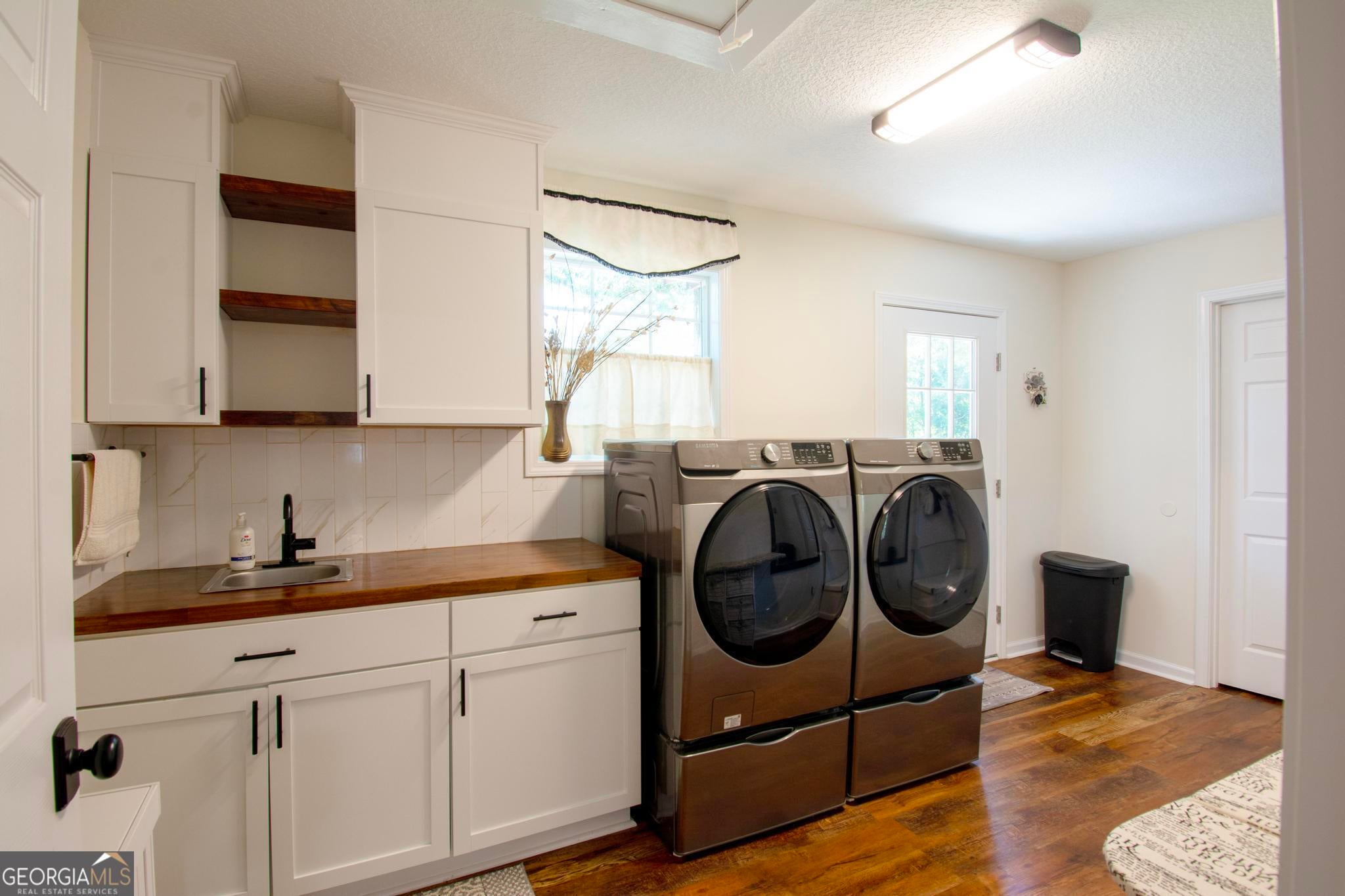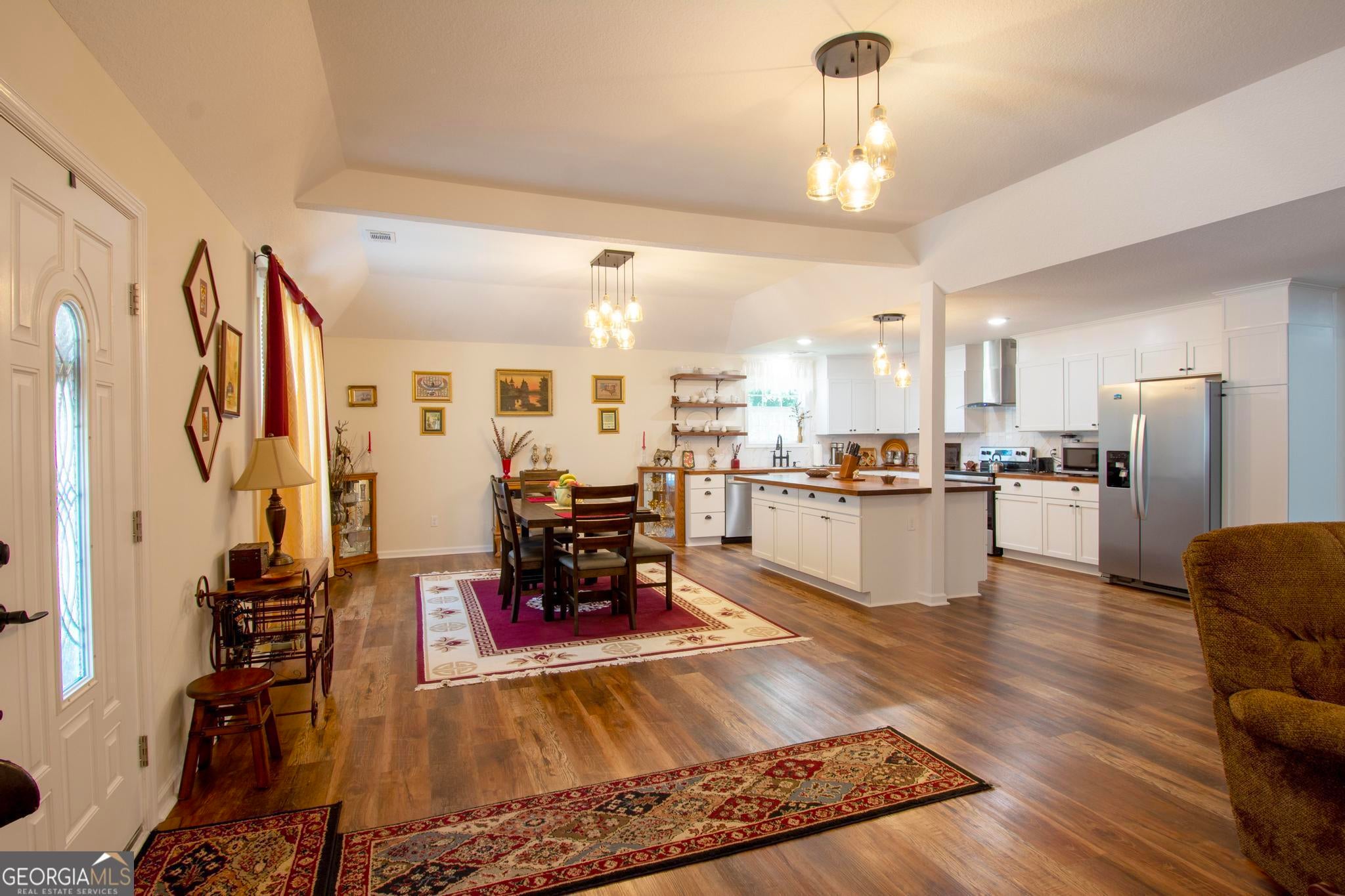 This beautiful 2,560 square foot home features an open floor plan, 3 bedrooms, 2 full baths and a flex bonus room with French glass doors that could easily become a home office, study/library, kids playroom, home gym or converted into a fourth bedroom. The open-concept living room and dining area have 11-foot high trey ceilings. The kitchen features butcher block counters, new cabinetry, floating shelving, plentiful storage and prep areas, tiled back splash, separate pantry, new stainless steel appliances, glass free-standing vented hood and a large butcher block table. The two secondary bed rooms are spacious and each have two generous closets and share a roomy full bathroom that features a floating double vanity, a wall of floating shelving and a separate dressing mirror. The large primary bedroom can easily accommodate a king or Cal-king and has a walk-in closet. The primary ensuite full bath features an over-sized tiled walk-in glass shower with a sitting area, a large elegant stand-alone soaking tub, and a dual vanity with antiqued fixtures. The rear combination laundry and mud room features new Samsung front-loading washer and dryer on pedestals. The halls are wide to accommodate wheel chair accessibility as well as the outside entrances. All plumbing, electrical, appliances, and HVAC are new.