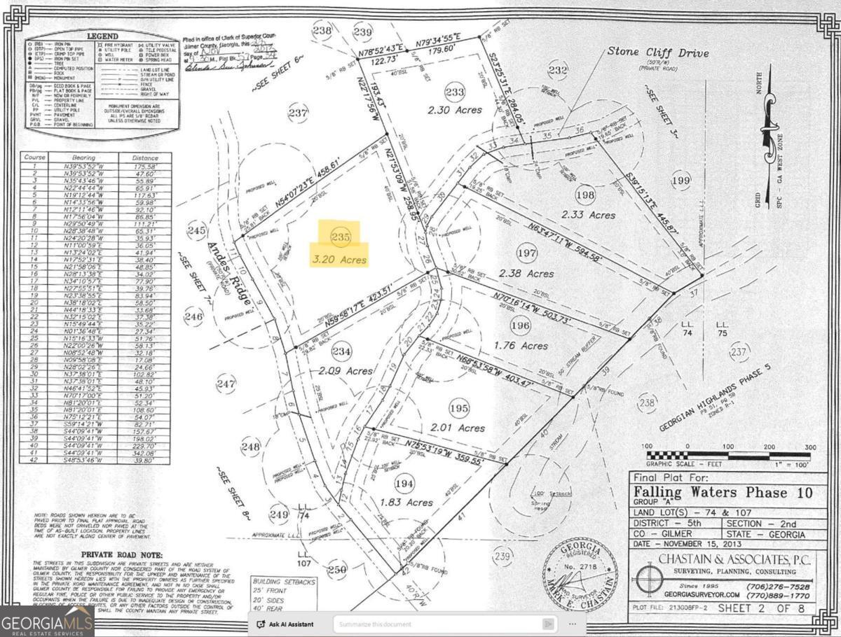 Unobstructed Long Range Mountain Views! This 3.2 acre lot slopes downward touching from the top of the lot at Andes Ridge to the bottom ending on Stone Cliff Drive. The grade of this lot allows for amazing unobstructed long range mountain views once your lot is cleared. You'll find the terrain on the right and left side boundaries have less of a slope where you might start a diagonal driveway. Or build towards the bottom on Stone Cliff for a wooded view. You'll love the beautiful gated mountain subdivision of Falling Waters with wide paved roads in a deciduous forest, quaint fishing lake, primitive campgrounds and picturesque hiking path along the splashing waters of Clear Creek. Underground electric, phone, cable, and fiber internet. Level 3 perk test on file in Gilmer County. Okay to buy now and build later! HOA, all buyers must be accompanied by an agent. Short term rentals may not be possible. Terrain parcel line photos are an approximation only.