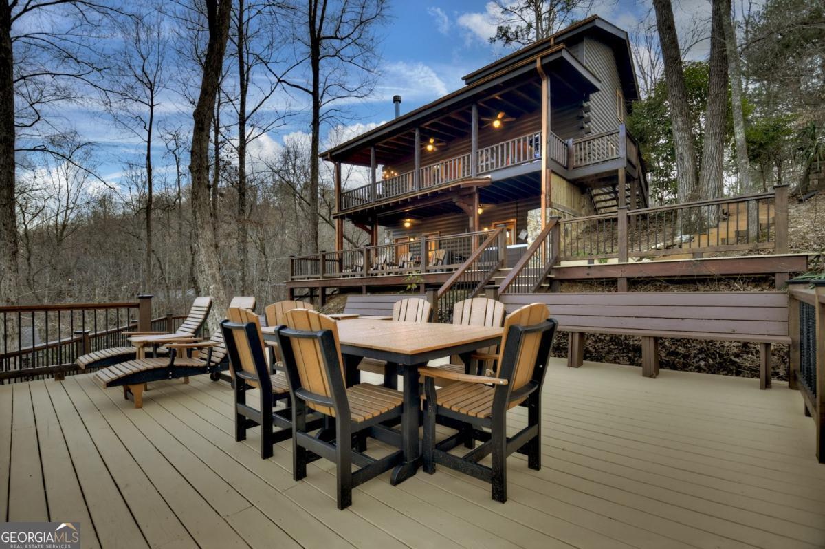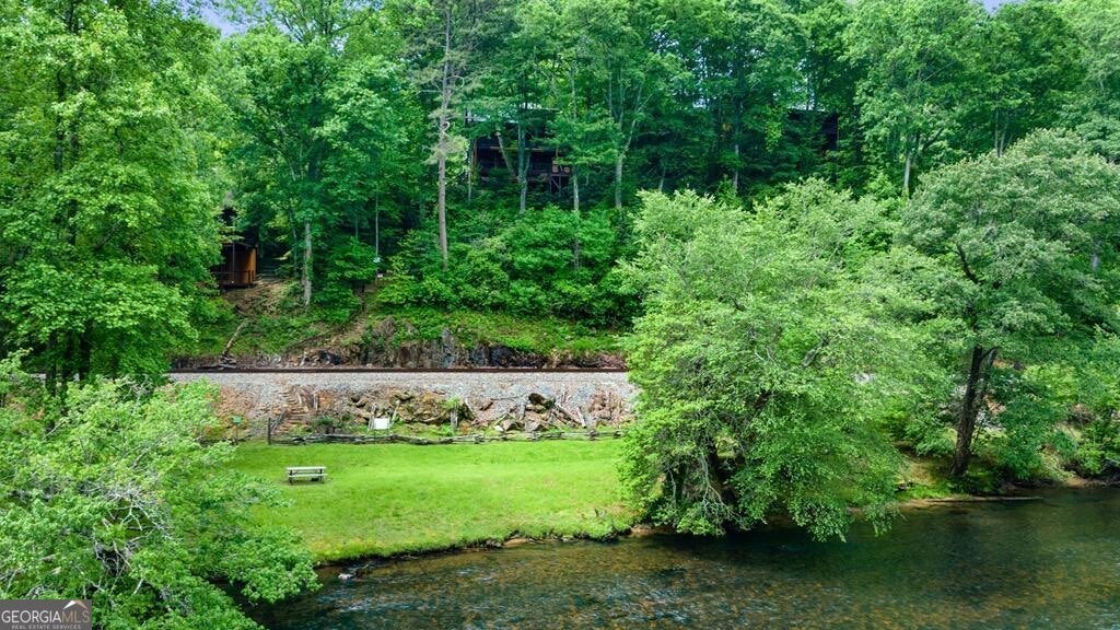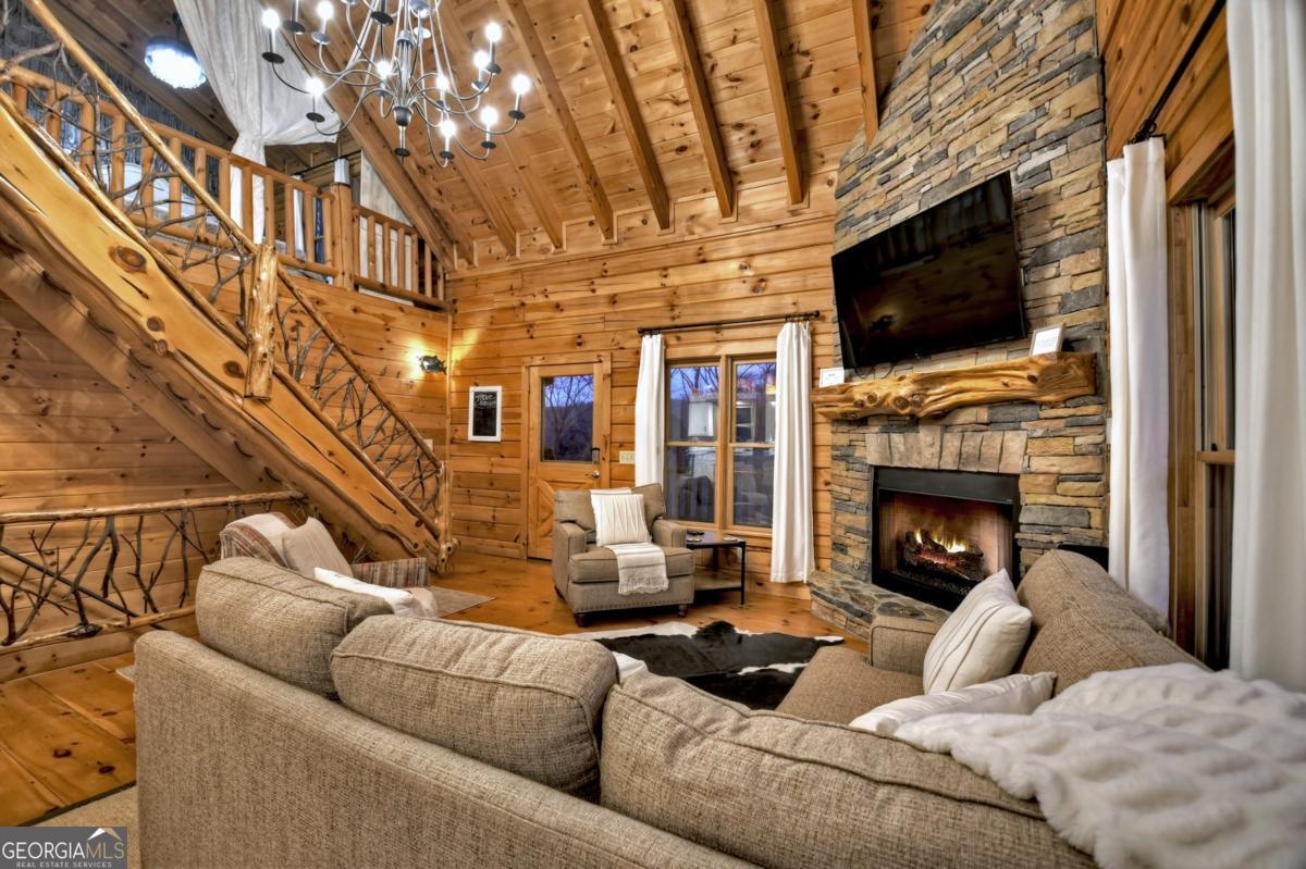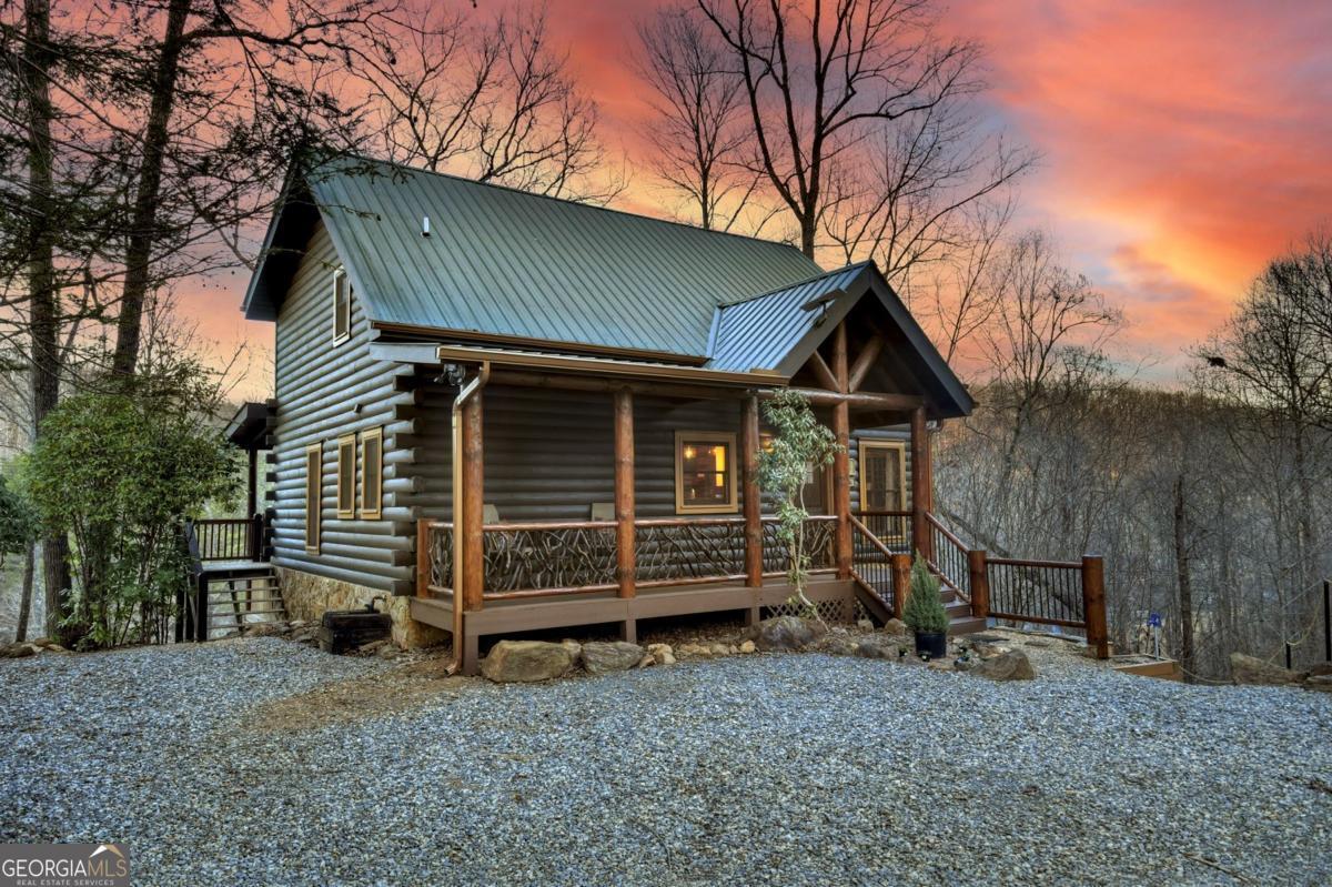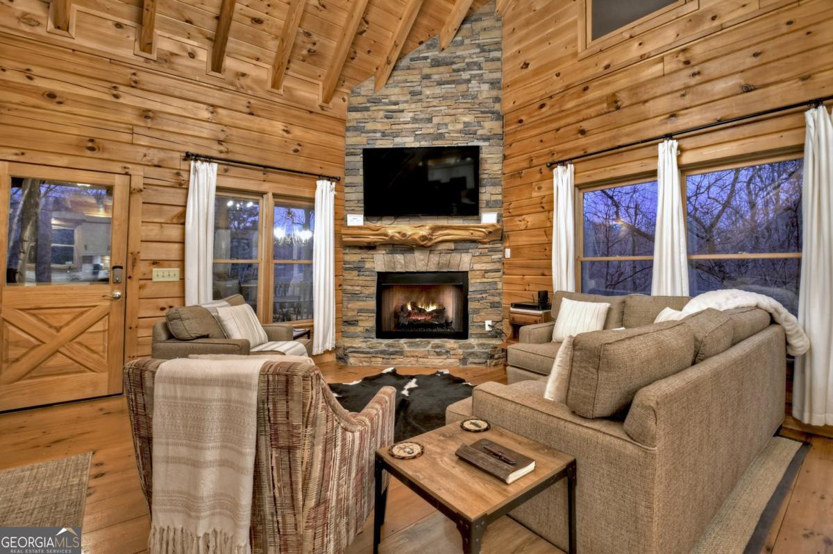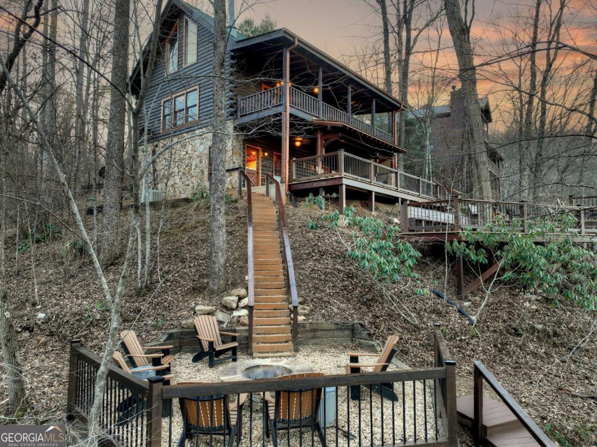 Prepare to be captivated by the CASCADING DECKS, BREATHTAKING VIEWS, and FULL RIVER ACCESS of Fishtrap Overlook! Listen to the SOOTHING SOUNDS of the river, watch bald eagles fish over the historic NATIVE AMERICAN "FISH TRAP" in the river below, and enjoy the charm of the Blue Ridge Scenic Railway passing by seasonally. This Turn-key, fully furnished cabin is a BEAUTIFULLY UPDATED and meticulously maintained REAL LOG CABIN that features custom designer details, a cabin-chic lighting package, vaulted ceilings, wide plank pine floors, and a cozy gas log fireplace. The RENOVATED KITCHEN offers GRANITE COUNTERTOPS and FARMHOUSE CABINETRY, perfect for entertaining. The main-level also includes a bedroom, full bath and linen closet, while the loft bedroom upstairs features custom wood & metal accent walls, ensuite bath, storage & office area backdropped w/ peaceful forest and mountain views. The finished terrace level features a game room with access to the party decks and hot tub area, a third bedroom, full bath, and a laundry room. This cabin has 10 closets for ample storage! Enjoy TWO LEVELS OF COVERED OUTDOOR LIVING SPACES, a NEWLY EXTENDED DECK, and a FIRE PIT AREA with STAIRS LEADING TO a park-like picnic area on the RIVERFRONT. Whether it's TROPHY TROUT FISHING, TUBING, or KAYAKING, this stretch of the TOCCOA RIVER (BELOW LAKE BLUE RIDGE) HAS IT ALL! Best of all, the home is ABOVE THE FLOODPLAIN-NO FLOOD INSURANCE NEEDED-and located JUST MINUTES FROM DOWNTOWN BLUE RIDGE. A ONE-OF-A-KIND RIVERFRONT RETREAT that BLENDS NATURE, HISTORY, AND MOUNTAIN LUXURY!