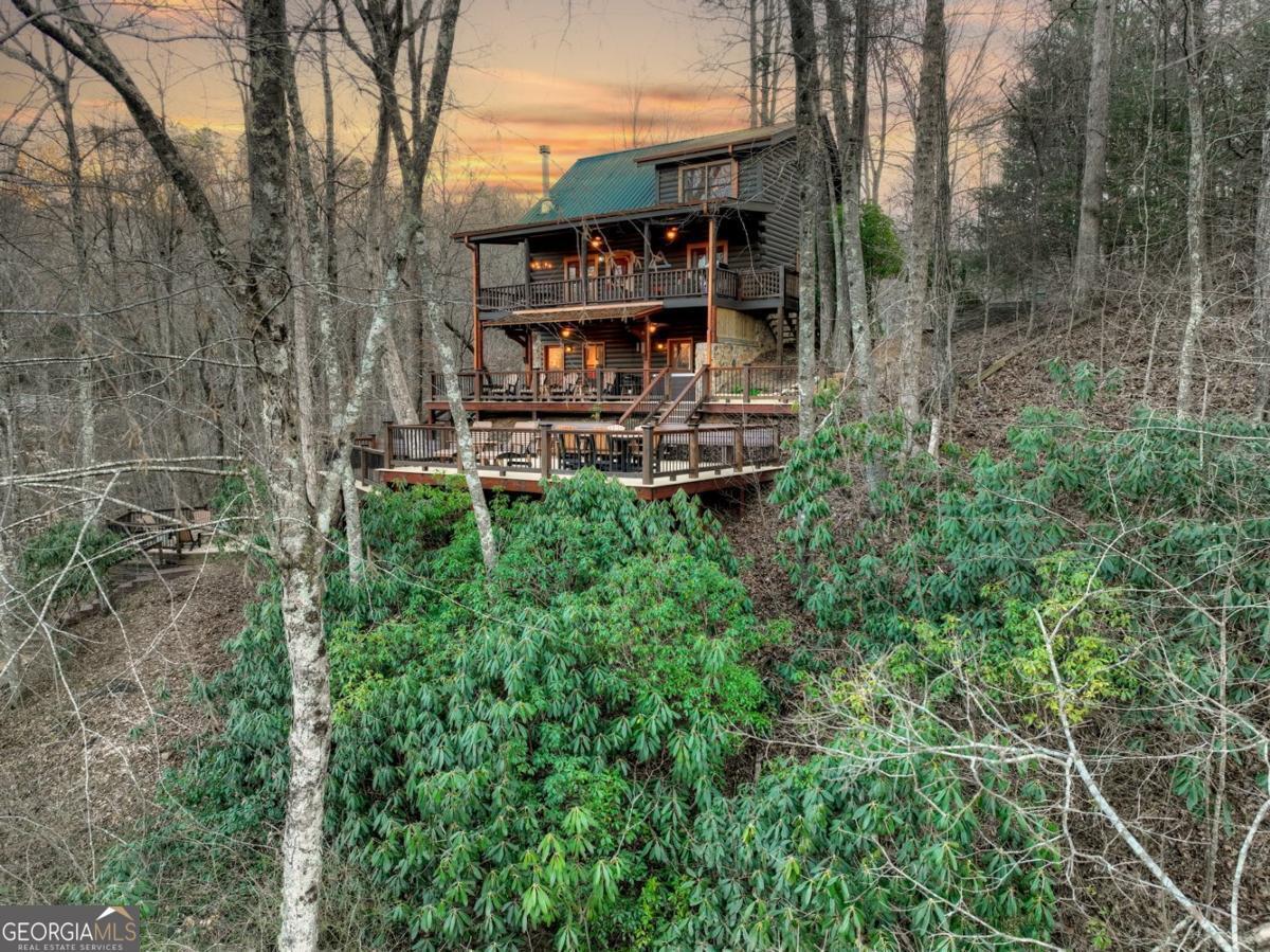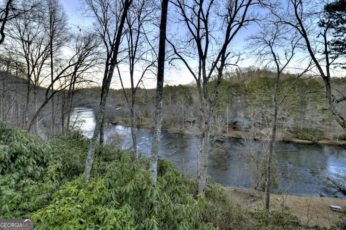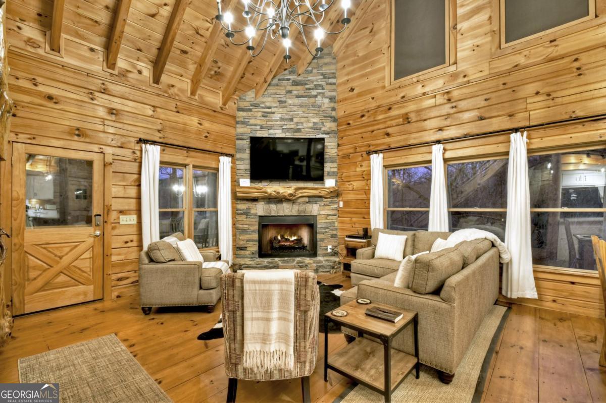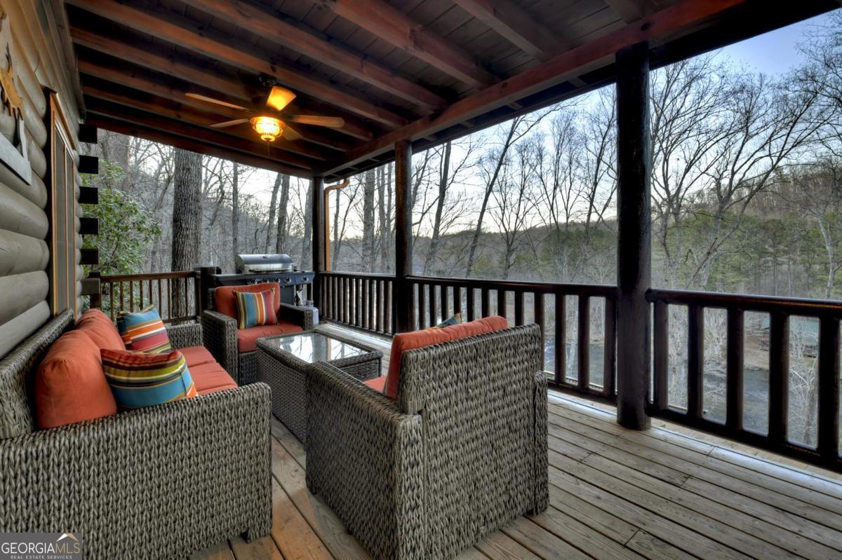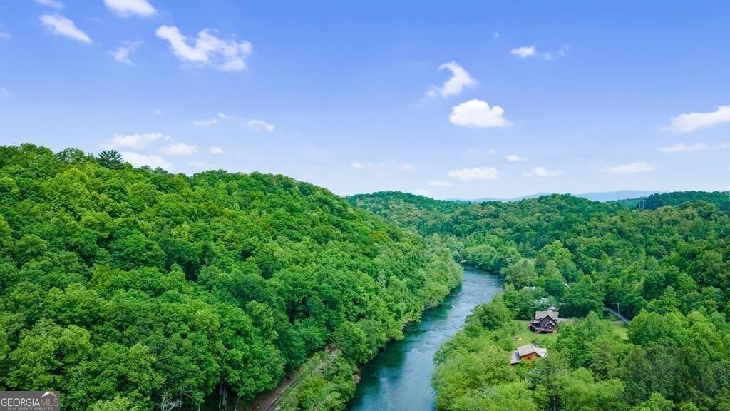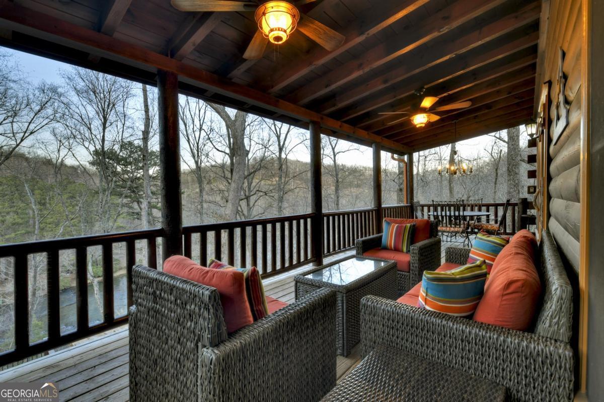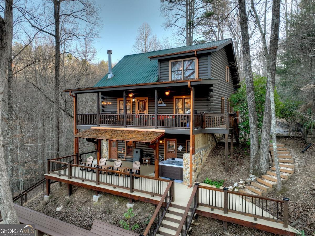 Prepare to be captivated by the CASCADING DECKS, BREATHTAKING VIEWS, and FULL RIVER ACCESS of Fishtrap Overlook! Listen to the SOOTHING SOUNDS of the river, watch bald eagles fish over the historic NATIVE AMERICAN "FISH TRAP" in the river below, and enjoy the charm of the Blue Ridge Scenic Railway passing by seasonally. This Turn-key, fully furnished cabin is a BEAUTIFULLY UPDATED and meticulously maintained REAL LOG CABIN that features custom designer details, a cabin-chic lighting package, vaulted ceilings, wide plank pine floors, and a cozy gas log fireplace. The RENOVATED KITCHEN offers GRANITE COUNTERTOPS and FARMHOUSE CABINETRY, perfect for entertaining. The main-level also includes a bedroom, full bath and linen closet, while the loft bedroom upstairs features custom wood & metal accent walls, ensuite bath, storage & office area backdropped w/ peaceful forest and mountain views. The finished terrace level features a game room with access to the party decks and hot tub area, a third bedroom, full bath, and a laundry room. This cabin has 10 closets for ample storage! Enjoy TWO LEVELS OF COVERED OUTDOOR LIVING SPACES, a NEWLY EXTENDED DECK, and a FIRE PIT AREA with STAIRS LEADING TO a park-like picnic area on the RIVERFRONT. Whether it's TROPHY TROUT FISHING, TUBING, or KAYAKING, this stretch of the TOCCOA RIVER (BELOW LAKE BLUE RIDGE) HAS IT ALL! Best of all, the home is ABOVE THE FLOODPLAIN-NO FLOOD INSURANCE NEEDED-and located JUST MINUTES FROM DOWNTOWN BLUE RIDGE. A ONE-OF-A-KIND RIVERFRONT RETREAT that BLENDS NATURE, HISTORY, AND MOUNTAIN LUXURY!
