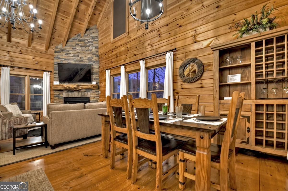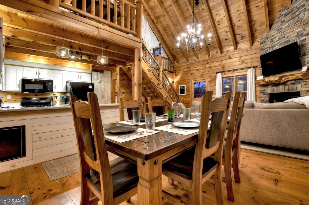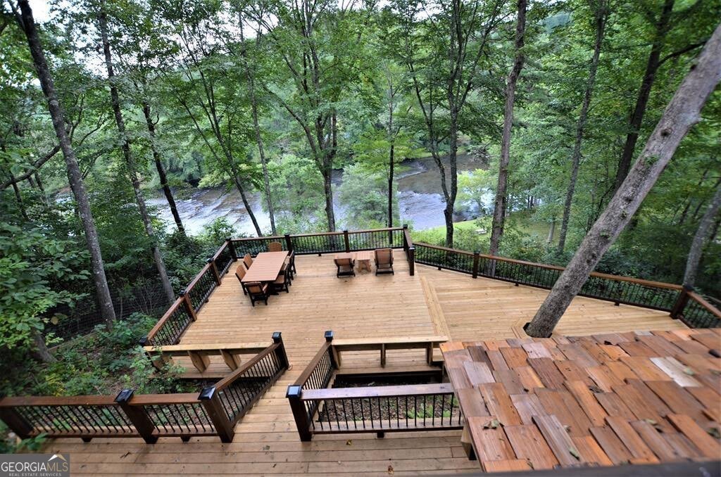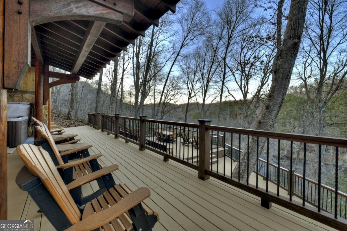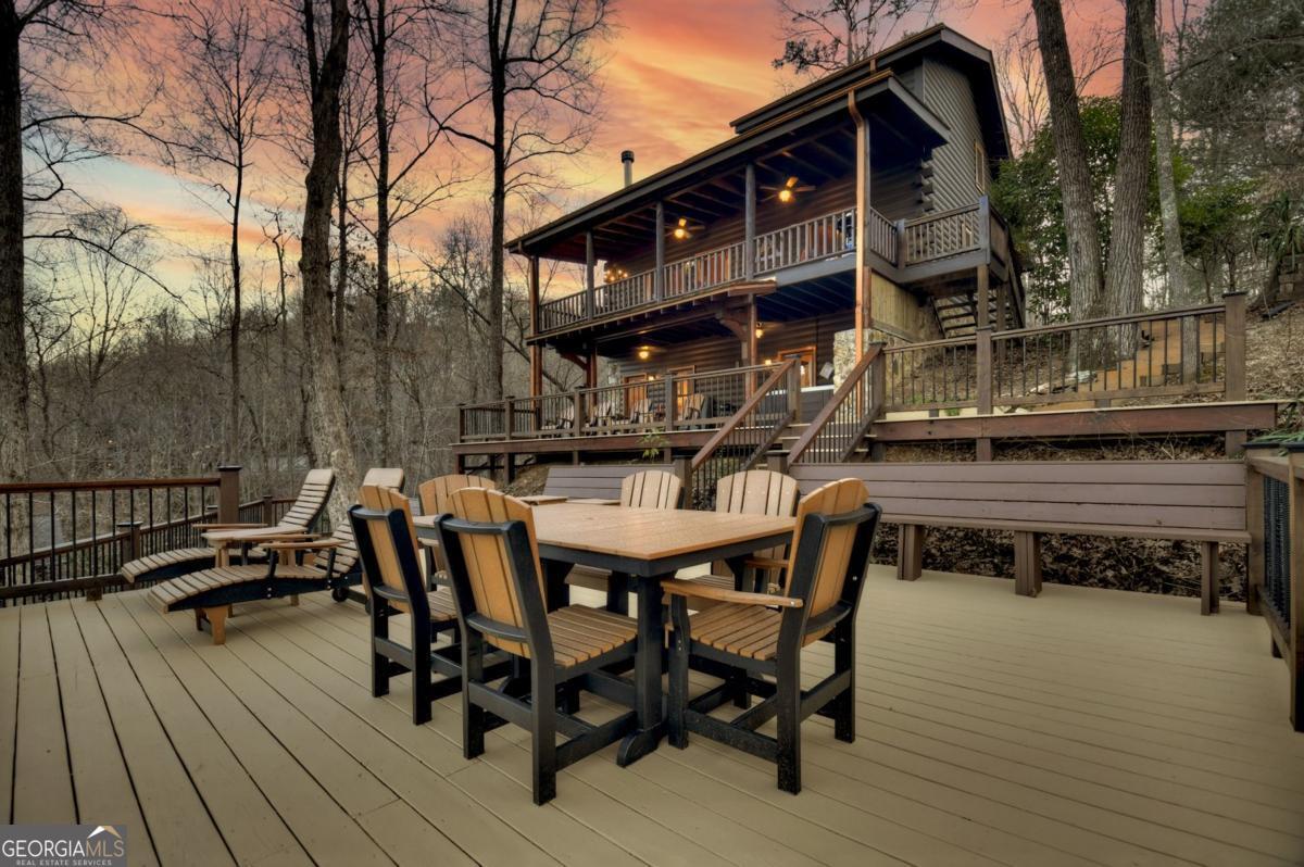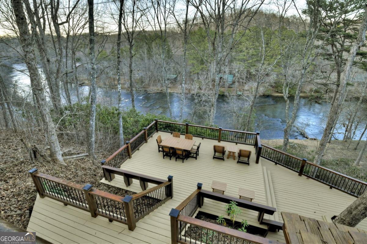 Prepare to be captivated by the CASCADING DECKS, BREATHTAKING VIEWS, and FULL RIVER ACCESS of Fishtrap Overlook! Listen to the SOOTHING SOUNDS of the river, watch bald eagles fish over the historic NATIVE AMERICAN "FISH TRAP" in the river below, and enjoy the charm of the Blue Ridge Scenic Railway passing by seasonally. This Turn-key, fully furnished cabin is a BEAUTIFULLY UPDATED and meticulously maintained REAL LOG CABIN that features custom designer details, a cabin-chic lighting package, vaulted ceilings, wide plank pine floors, and a cozy gas log fireplace. The RENOVATED KITCHEN offers GRANITE COUNTERTOPS and FARMHOUSE CABINETRY, perfect for entertaining. The main-level also includes a bedroom, full bath and linen closet, while the loft bedroom upstairs features custom wood & metal accent walls, ensuite bath, storage & office area backdropped w/ peaceful forest and mountain views. The finished terrace level features a game room with access to the party decks and hot tub area, a third bedroom, full bath, and a laundry room. This cabin has 10 closets for ample storage! Enjoy TWO LEVELS OF COVERED OUTDOOR LIVING SPACES, a NEWLY EXTENDED DECK, and a FIRE PIT AREA with STAIRS LEADING TO a park-like picnic area on the RIVERFRONT. Whether it's TROPHY TROUT FISHING, TUBING, or KAYAKING, this stretch of the TOCCOA RIVER (BELOW LAKE BLUE RIDGE) HAS IT ALL! Best of all, the home is ABOVE THE FLOODPLAIN-NO FLOOD INSURANCE NEEDED-and located JUST MINUTES FROM DOWNTOWN BLUE RIDGE. A ONE-OF-A-KIND RIVERFRONT RETREAT that BLENDS NATURE, HISTORY, AND MOUNTAIN LUXURY!