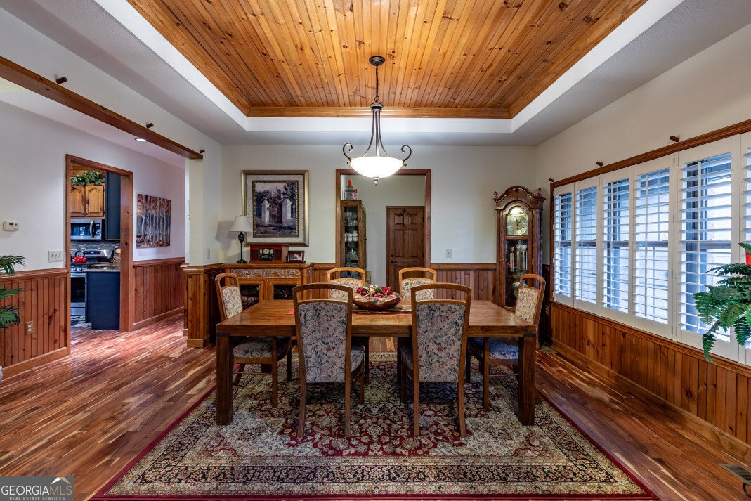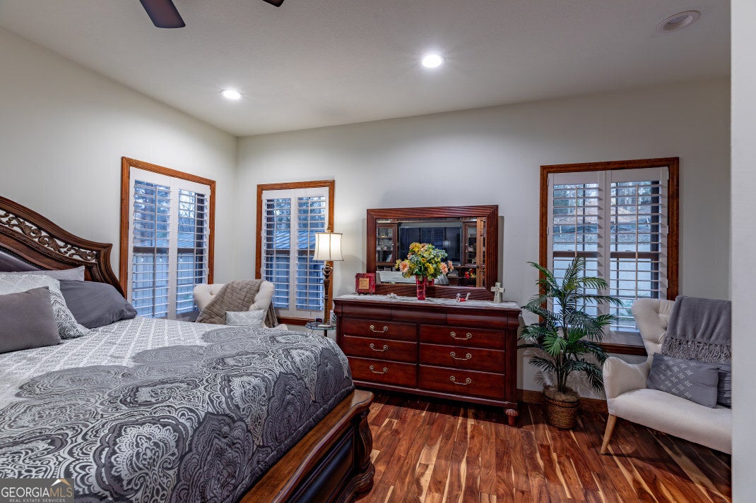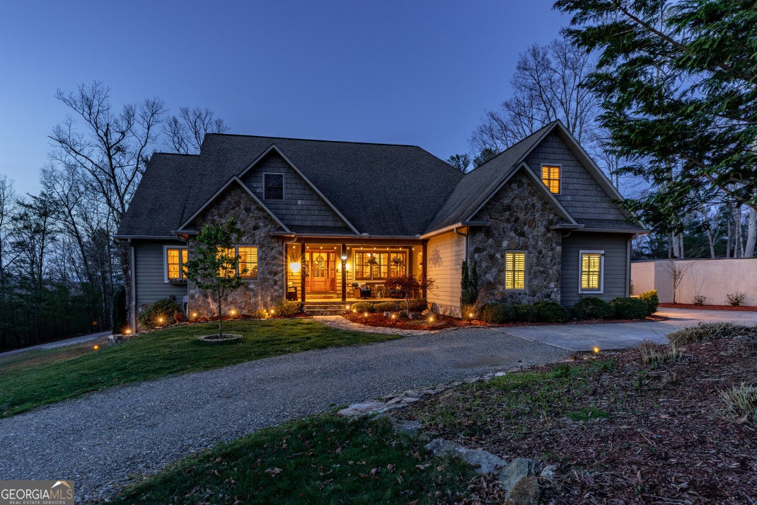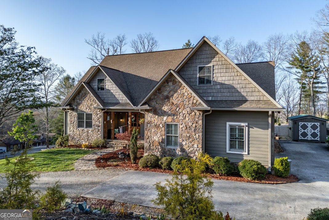 PRICED UNDER COUNTY APPRAISED VALUE! This exceptional offering provides the rare freedom of no HOA fees and easy access to Blue Ridge, Canton, Atlanta, and Murphy, NC-perfect for full-time living or weekend getaways. The 5,398 sq. ft. custom-built residence sits on 1.15 beautifully landscaped acres in the scenic Apple Valley Overlook community of Blairsville, GA, blending luxury with everyday comfort. The main level features imported Asian walnut flooring, custom plantation shutters, and two spacious owner's suites-each with luxurious full baths and dual vanities. One suite includes a tray ceiling and his-and-her closets; the other offers a large walk-in. Additional bedrooms on both levels provide flexible space for guests or family. Throughout, tongue-and-groove knotty pine ceilings add warmth and character, continuing into the gourmet kitchen with leathered granite countertops, a copper farmhouse sink, and vaulted ceilings. Comfort and convenience abound with two-zone HVAC, two remote-start gas fireplaces, and seamless flow to a screened lanai and open-air deck-perfect for entertaining or enjoying the view. The terrace level includes "The Pub," a game and lounge space with a granite-topped bar, double-sided fireplace, full bath, and heated/cooled storage. Outside, you'll find crepe myrtles, azaleas, irises, and Japanese maples, along with a two-car garage with bonus room above, powered storage shed, and a new septic system (2024). Additional upgrades include a digital hot water heater, buried propane tank, stainless appliances, rock exterior accents, and hand-hewn columns. With stunning mountain views, generous storage, and a layout designed for comfort and entertainment, this is a rare opportunity in one of North Georgia's most desirable areas.