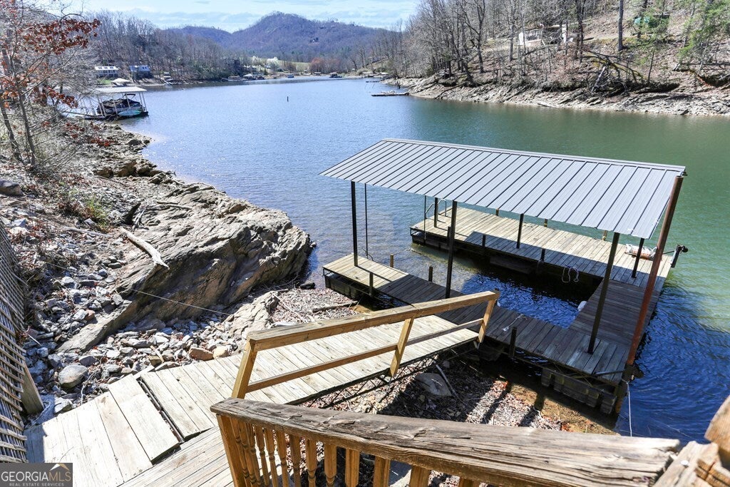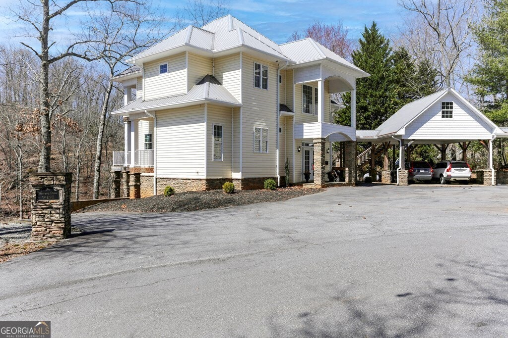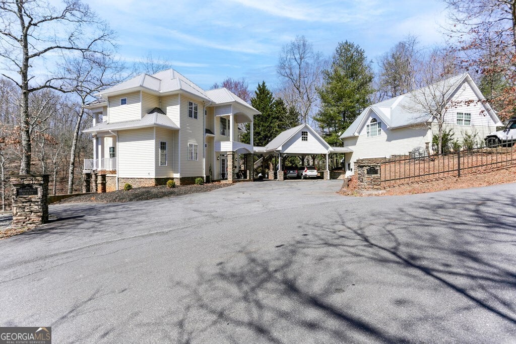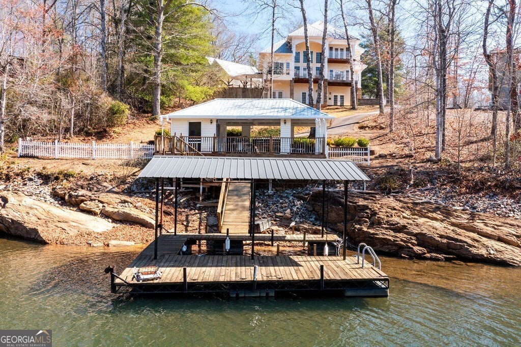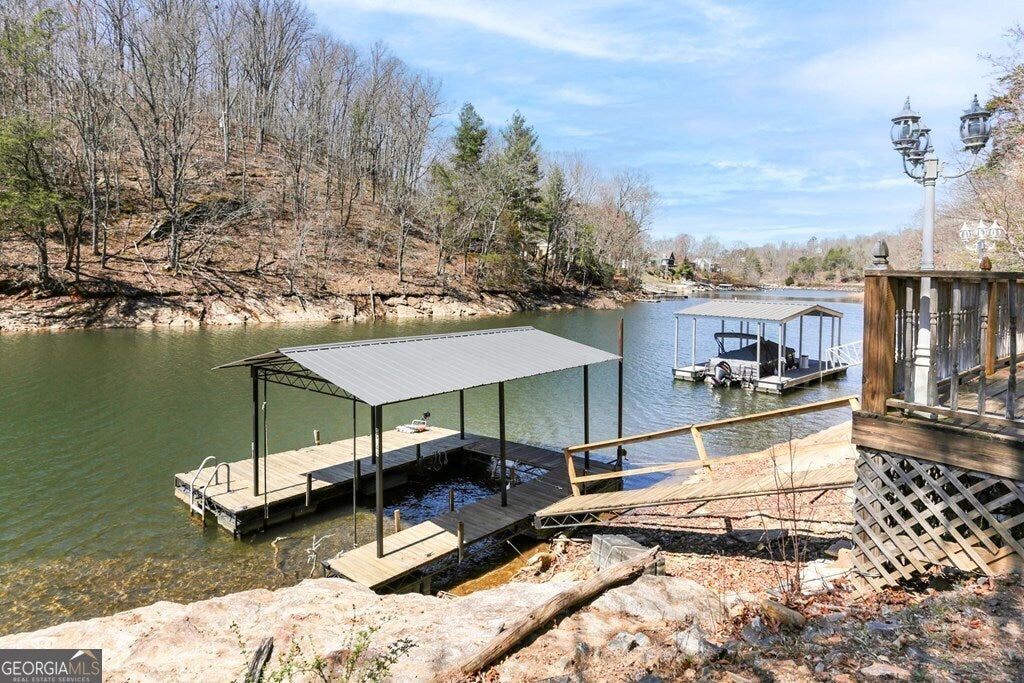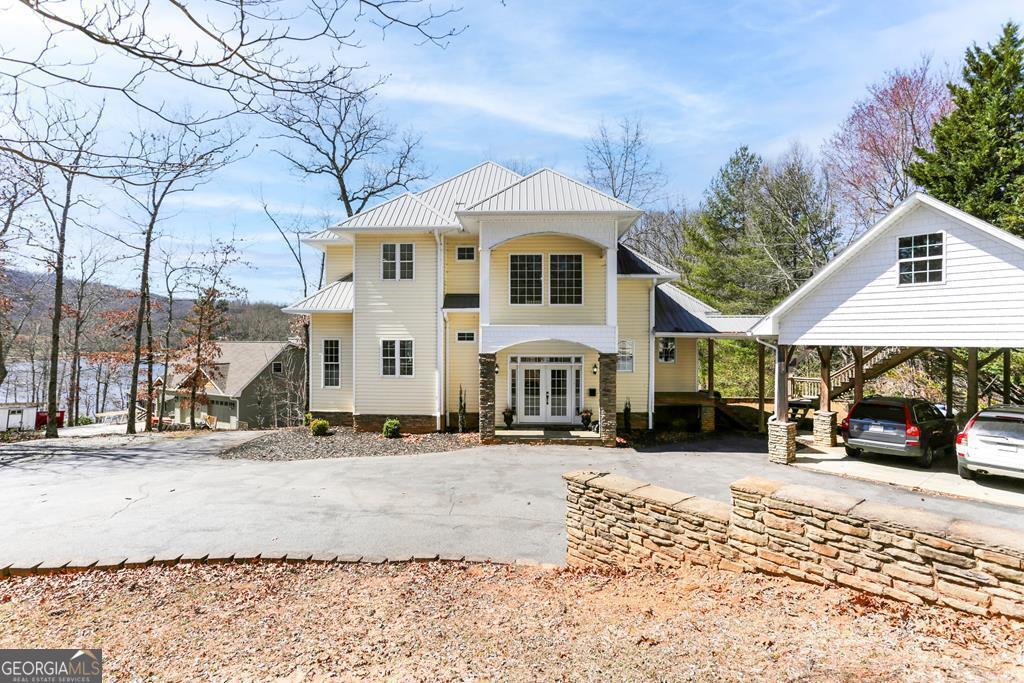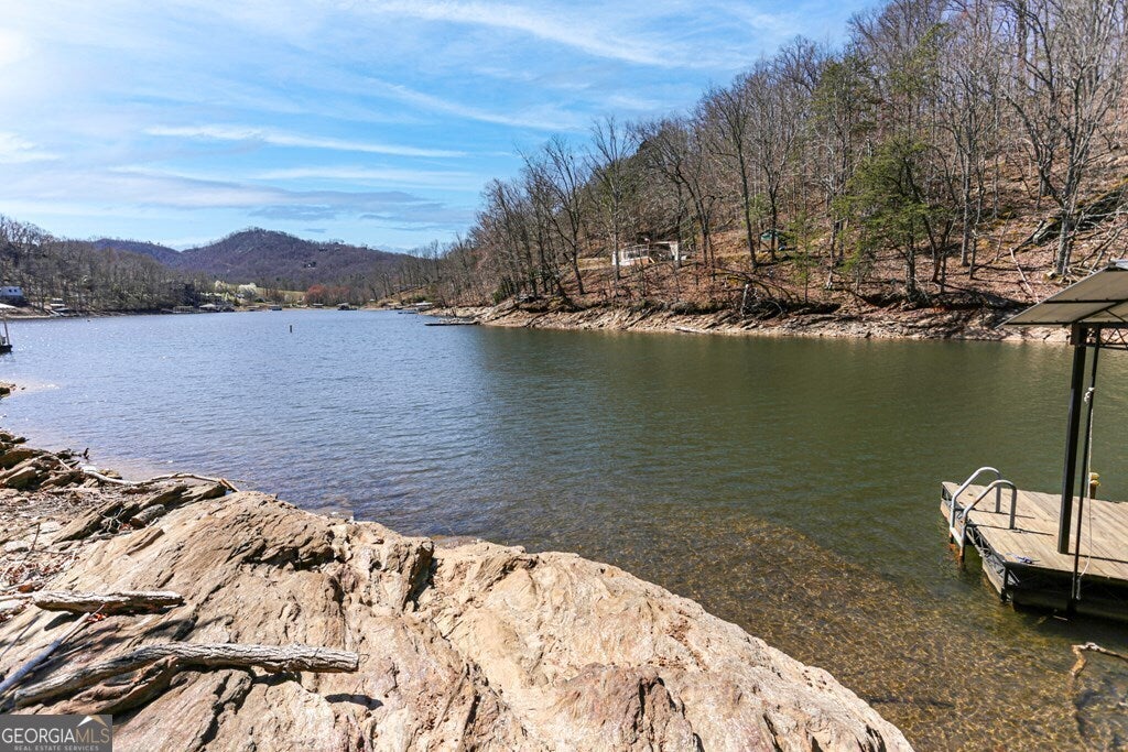 MOTIVATED SELLER ON LAKE CHATUGE!! Embrace the essence of lakeside living with this exceptional North Carolina mountain retreat, perfectly positioned along the serene shores of Lake Chatuge. This captivating 3-bedroom home is designed to maximize your enjoyment of the natural beauty that surrounds it. The open floor plan & great room with its cathedral ceiling and inviting gas log fireplace set the stage for comfortable living & entertaining. Stainless steel appliances in the kitchen pair with functionality & style, while the spacious back deck offers a tranquil vantage point to admire the lake. Accommodations include an indulgent master bedroom complete with a sitting area, and a secondary master suite on the upper level, each offering private havens within the home. The lower level extends your living space with an additional bedroom and bathroom, along with its own living room and second kitchen, perfect for guests or as an in-law suite. Outside, the property excels with a lakeside pavilion including a kitchen for outdoor gatherings, and a covered single slip boat dock for leisurely days on the water. Parking and storage are ample with a 2-car carport and a HUGE 3-bay garage featuring a 1 bedroom/1 bathroom apartment above, offering extra space for visitors. Located within minutes from the charming downtown areas of Hayesville, NC, and Hiawassee, GA, this home delivers both seclusion and convenience for the ultimate retreat. This enchanting property is more than just a home-it's an experience that promises a lifestyle of peaceful luxury and lakeside adventure.