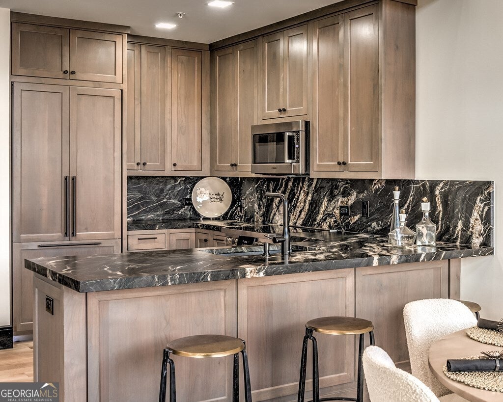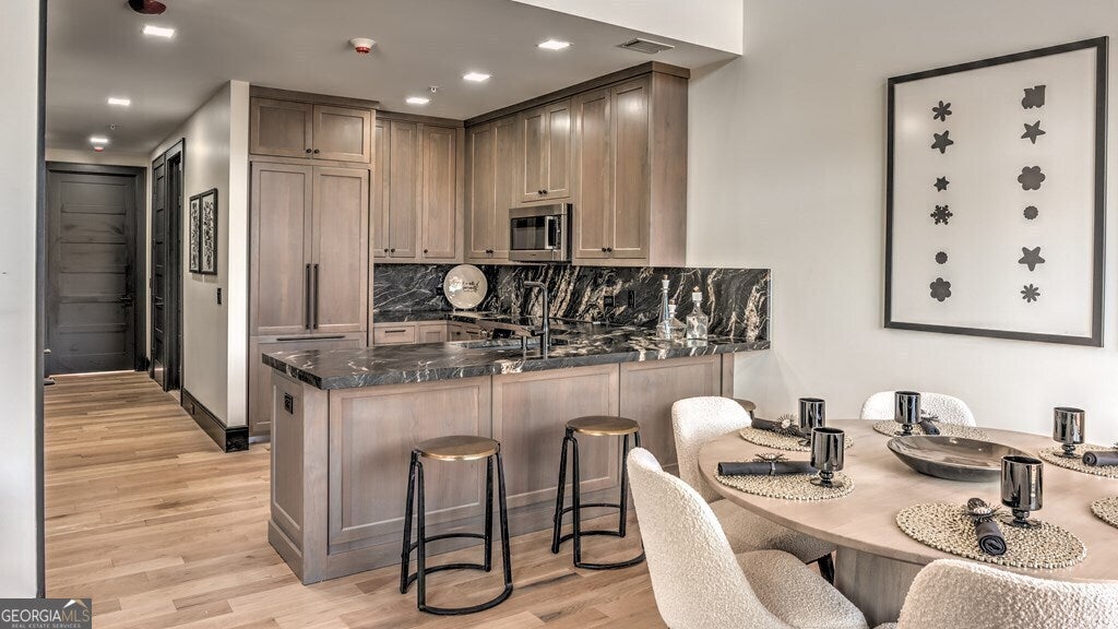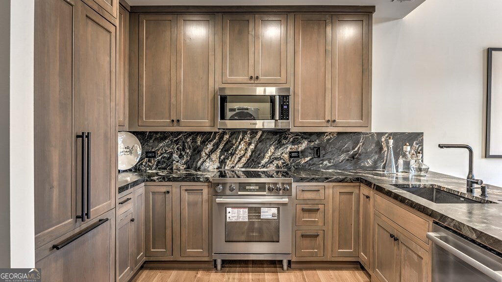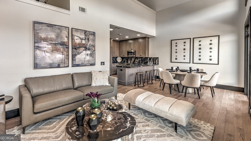 Step into "The Black Unit #1" and indulge in the epitome of luxury living. As you enter, the glossy black trim and doors create a dramatic entrance, leading to wide plank light oak flooring and a state-of-the-art gourmet kitchen adorned with top-of-the-line Bosch appliances, leather marble countertops, and washed gray oak raised panel cabinets. Notable features include Black Italian marble in the primary bathroom with exquisite gold inlays for added opulence, marble countertops with dual sinks, and titanium fixtures. Adding to the grandeur are the European touches, such as 2 electric fireplaces, all electrical outlets discreetly integrated into the baseboards, and impressive 8-foot doorway entries, which further elevate the luxurious living environment. The main level boasts awe-inspiring 20-foot ceilings, exuding grandeur and elegance, while an elevator provides effortless access to all three levels. LA Cresta on Main sets a new standard for luxury living, where every detail has been meticulously crafted to offer a lifestyle of unparalleled refinement and comfort. Property is being sold unfurnished. Furniture can be purchased outside of sale of property.