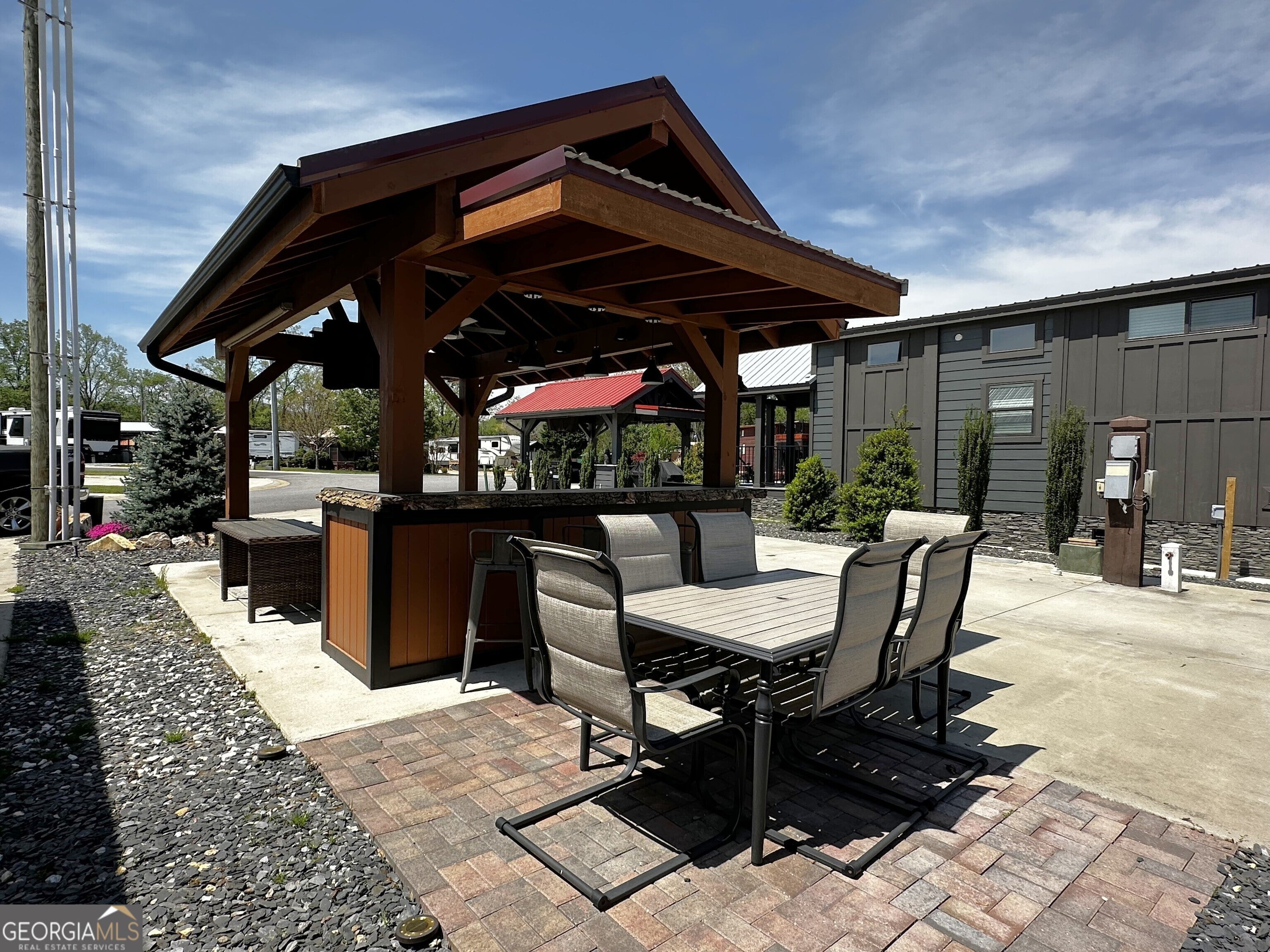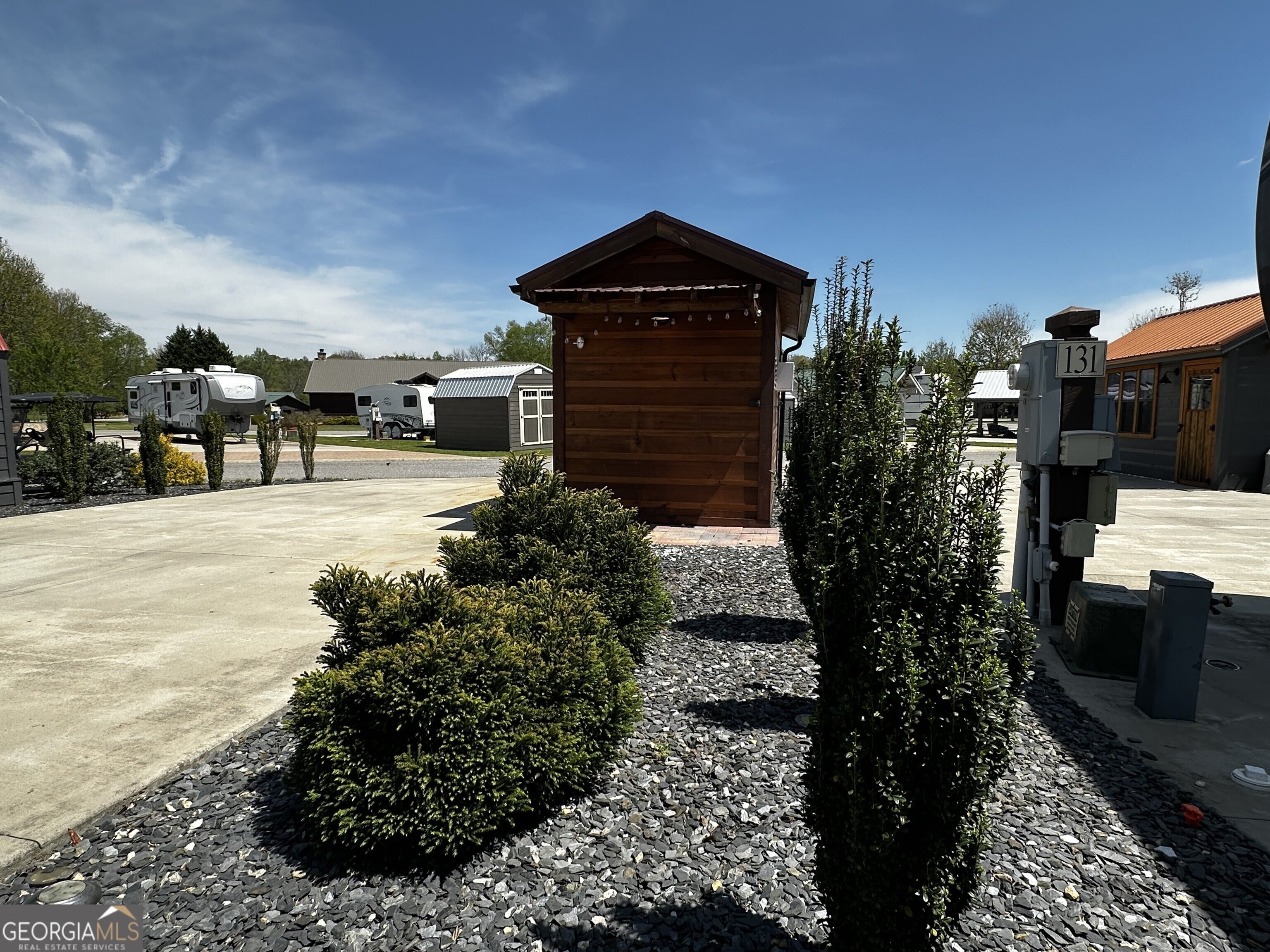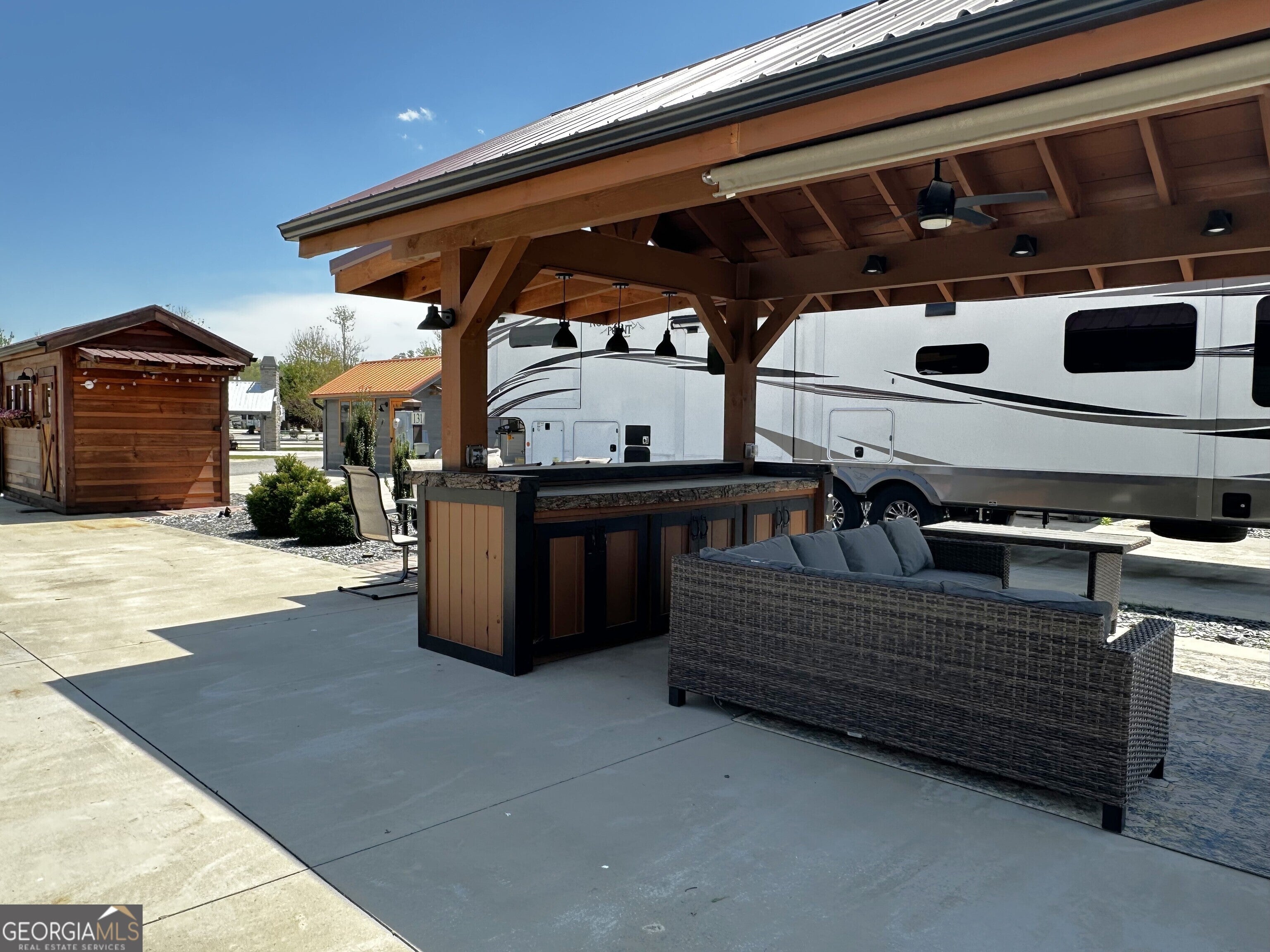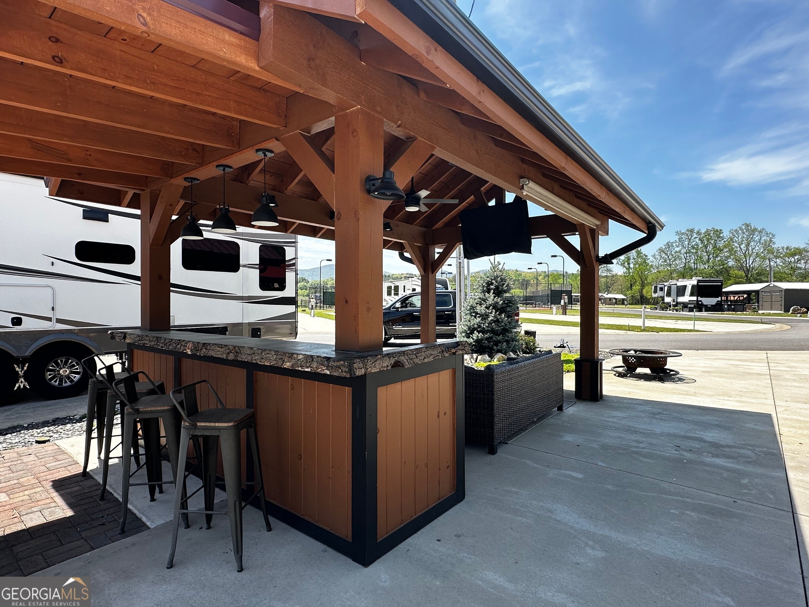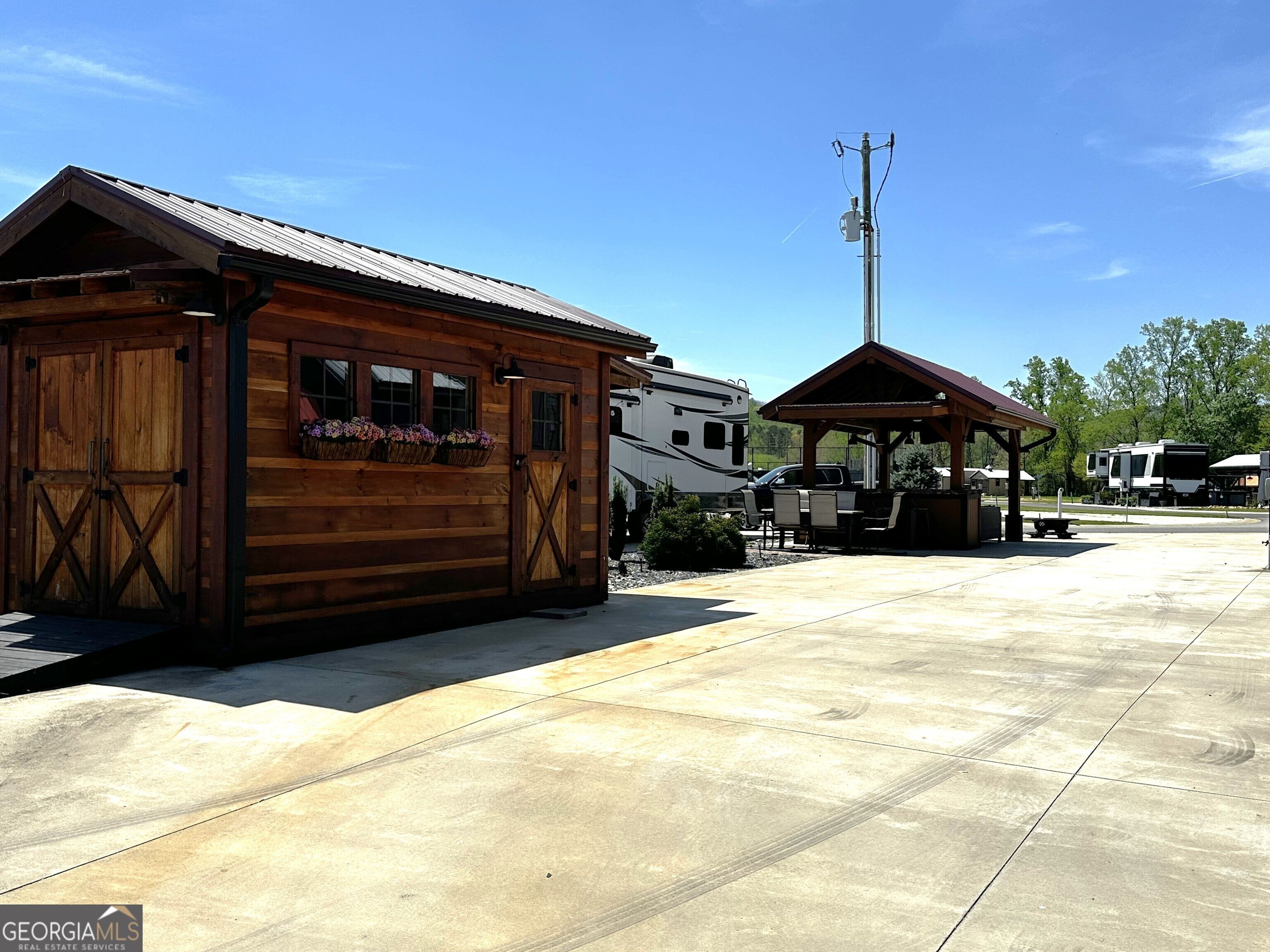 Well appointed pull thru lot that is conveniently located near the clubhouse, pools, dog parks, tennis and pickle ball! 10x16 Pavilion with electric and TV, and extended roof including a beautiful live edge counter and entertainment bar! Plenty of cabinet storage and small refrigerator. Most furnishings included. Pretty storage shed ready for your golf cart or toys! Has insulation! Extra paver space allows for outdoor dining with table and chairs. Ready also for a future tiny home addition! Mountain views included! Make this your mountain paradise getaway or place it in the rental program. Crossing Creeks RV Resort & Spa is Class A, B, C and travel trailer and 5th wheel friendly! Low HOA fees and great amenities. Enjoy the saunas, hot tub, steam room and gym and more! Close to shopping, restaurant's wineries, hiking boating and more. This is a gated community!