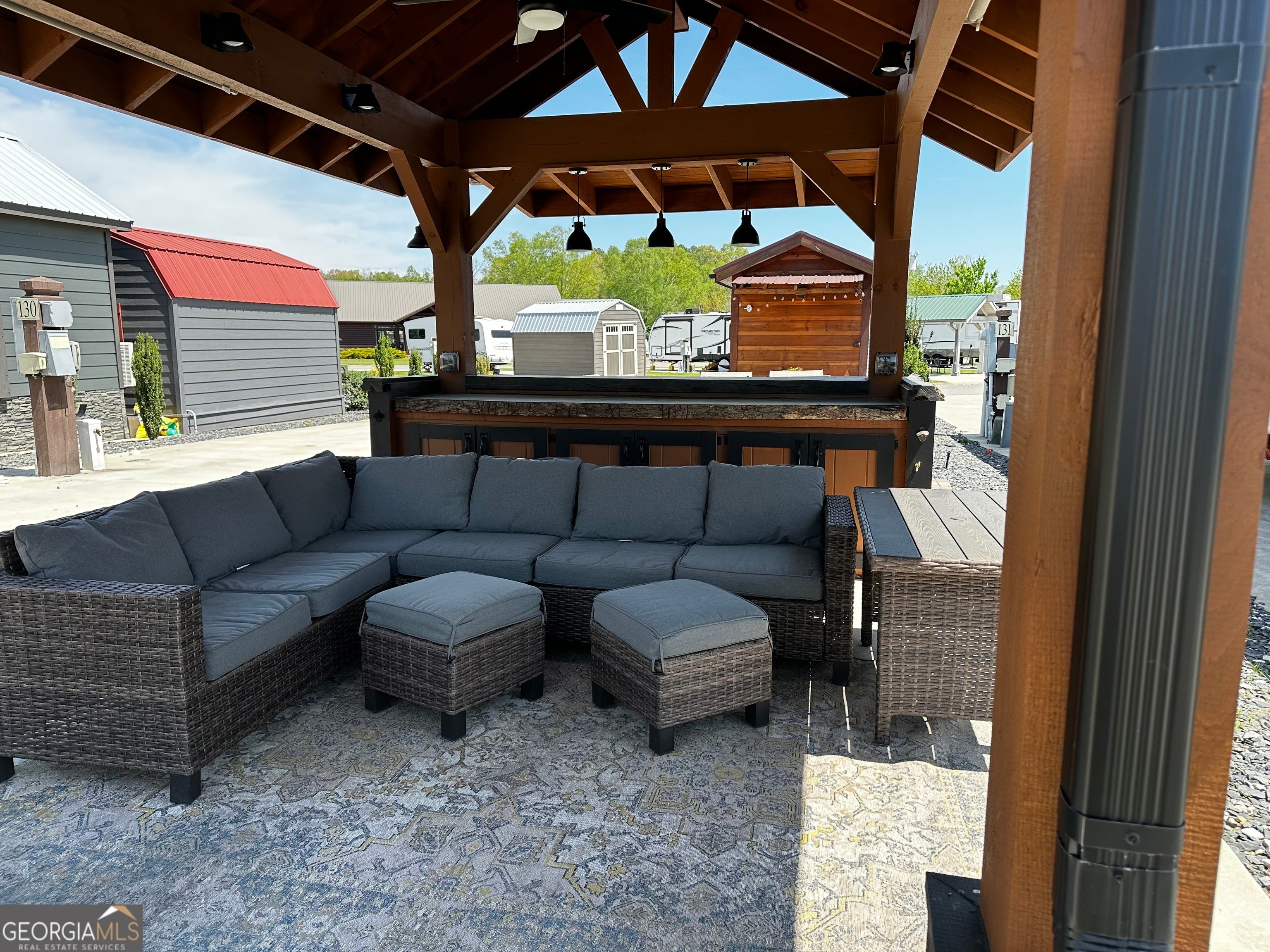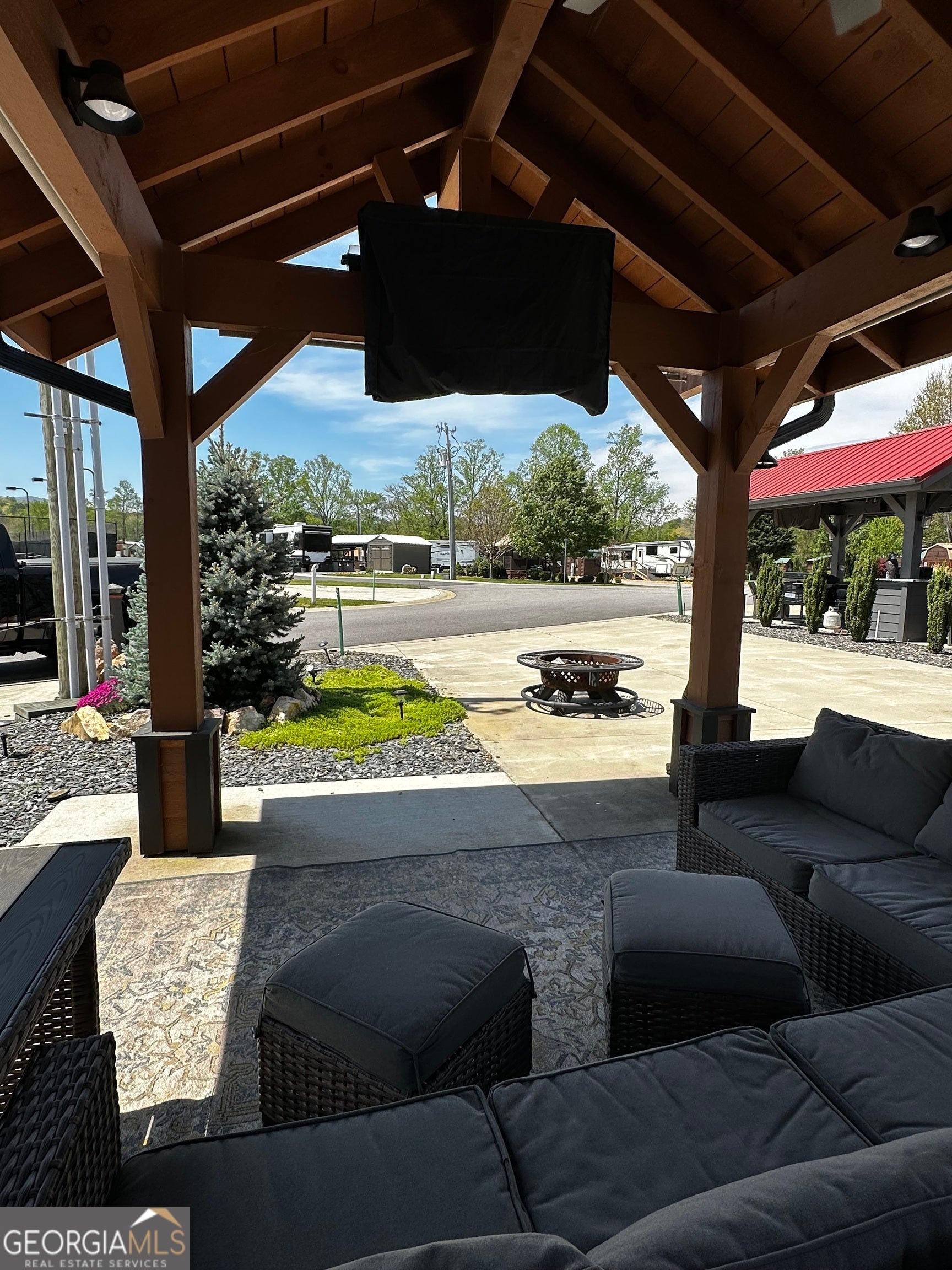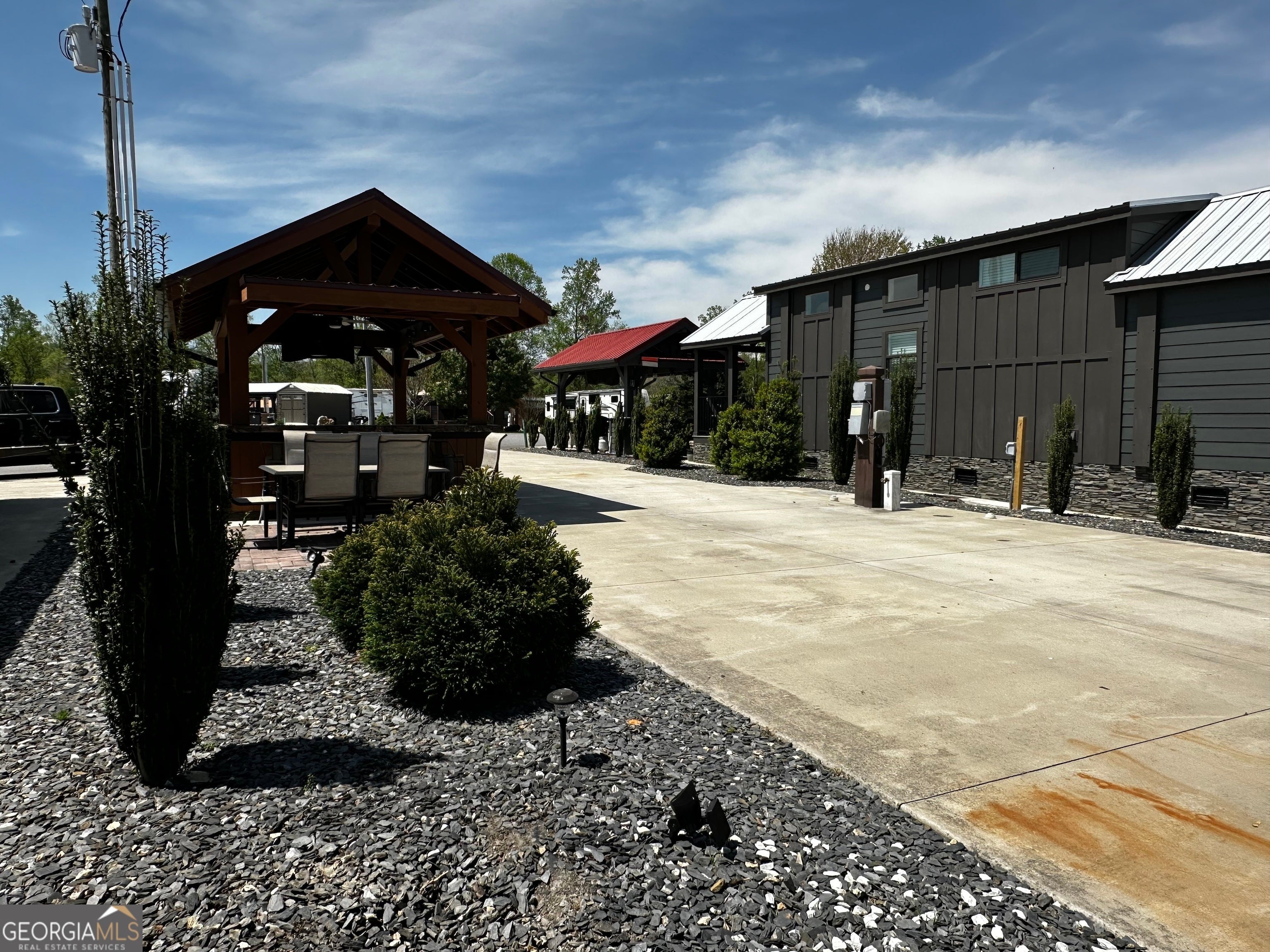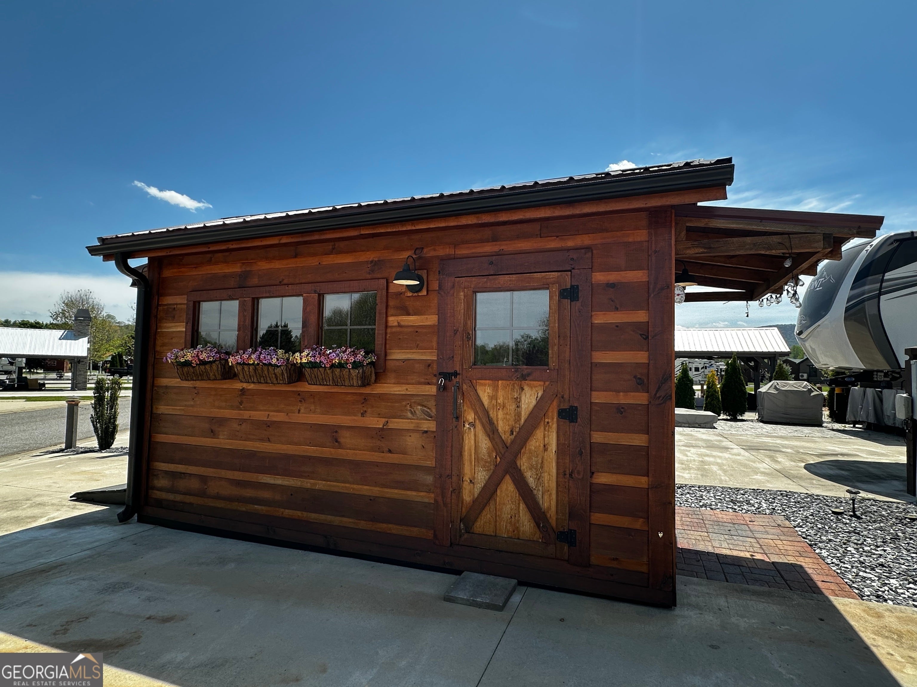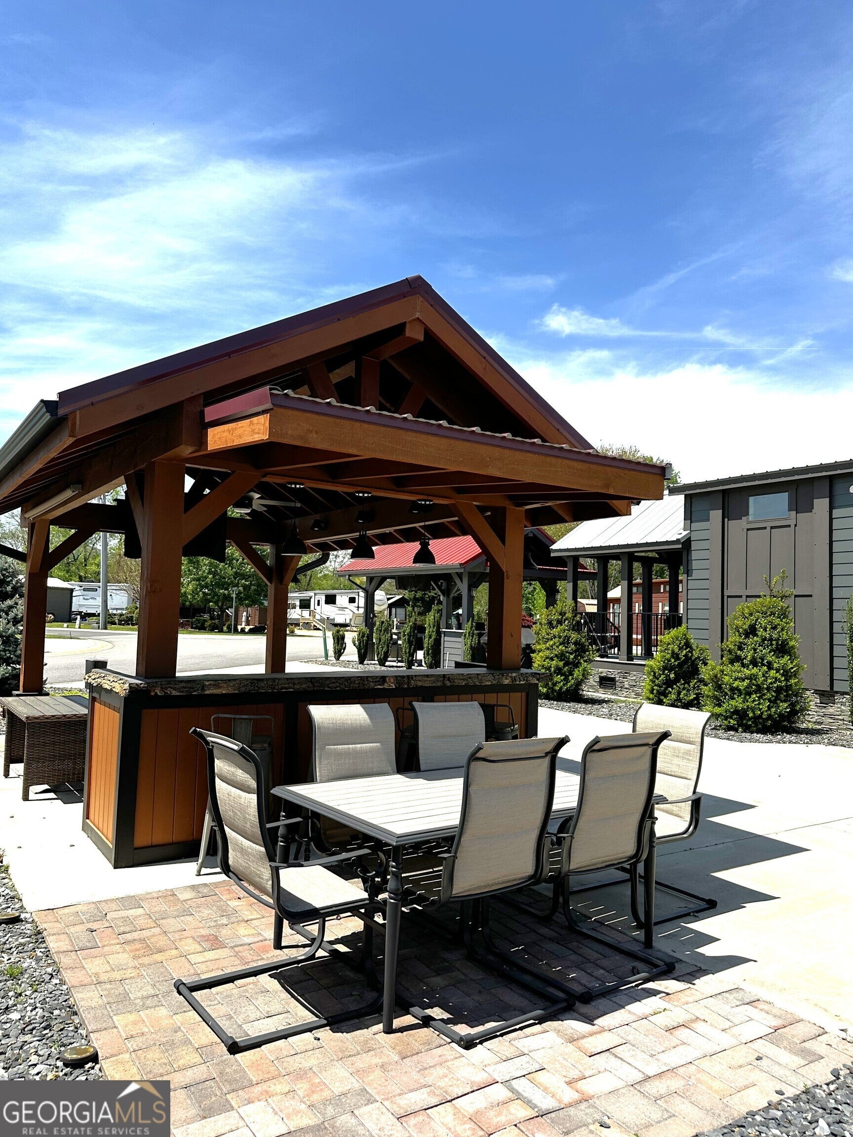 Well appointed pull thru lot that is conveniently located near the clubhouse, pools, dog parks, tennis and pickle ball! 10x16 Pavilion with electric and TV, and extended roof including a beautiful live edge counter and entertainment bar! Plenty of cabinet storage and small refrigerator. Most furnishings included. Pretty storage shed ready for your golf cart or toys! Has insulation! Extra paver space allows for outdoor dining with table and chairs. Ready also for a future tiny home addition! Mountain views included! Make this your mountain paradise getaway or place it in the rental program. Crossing Creeks RV Resort & Spa is Class A, B, C and travel trailer and 5th wheel friendly! Low HOA fees and great amenities. Enjoy the saunas, hot tub, steam room and gym and more! Close to shopping, restaurant's wineries, hiking boating and more. This is a gated community!