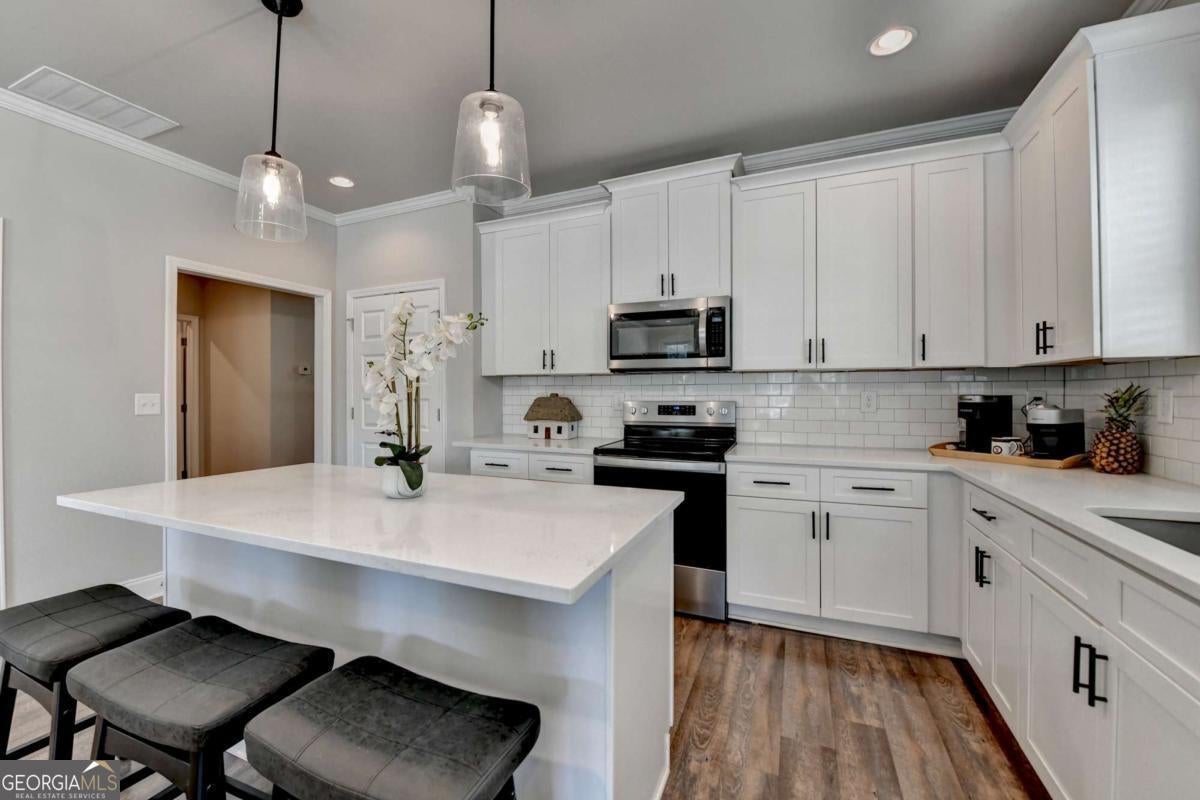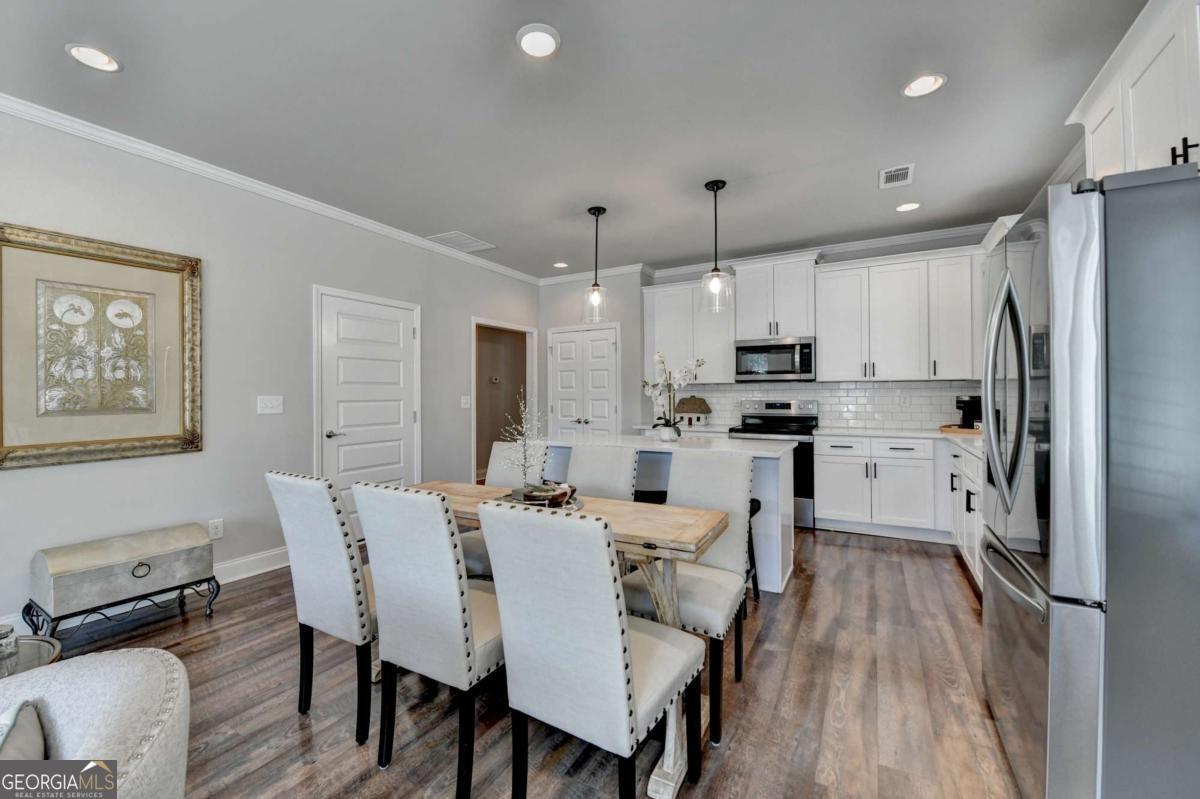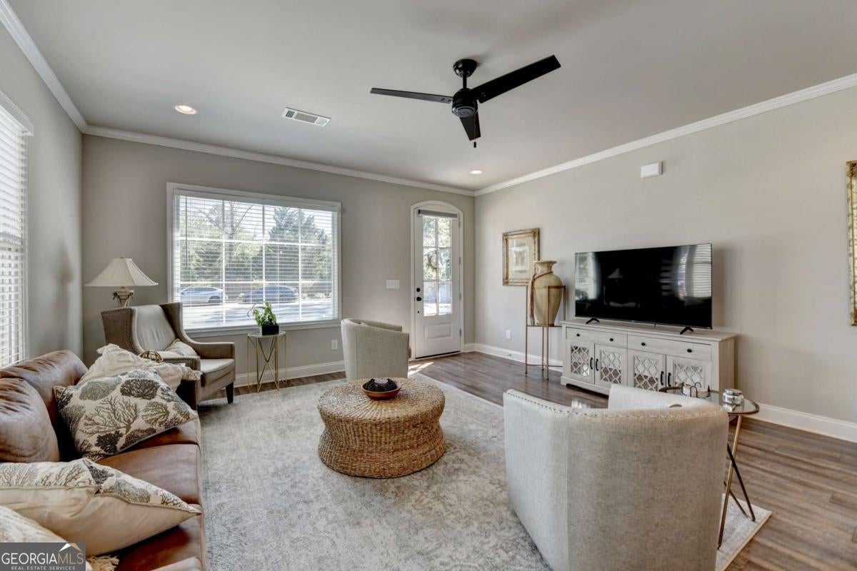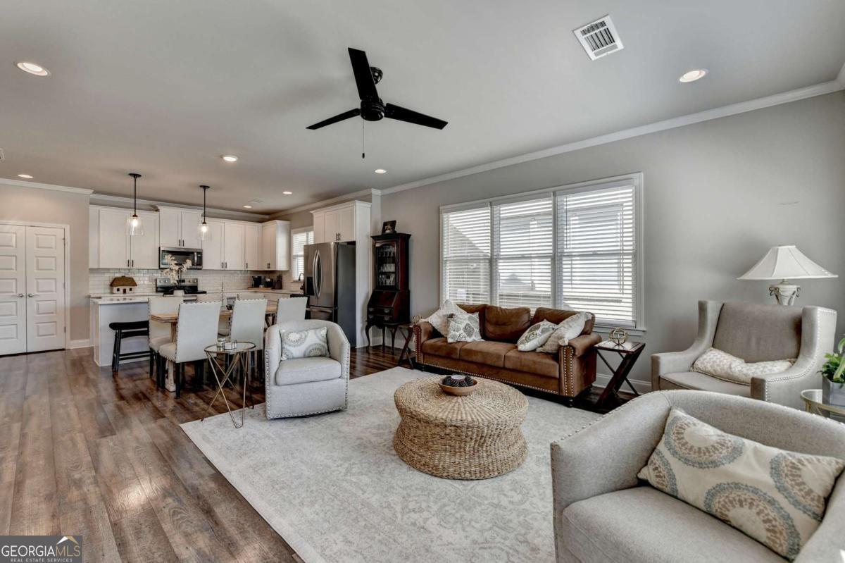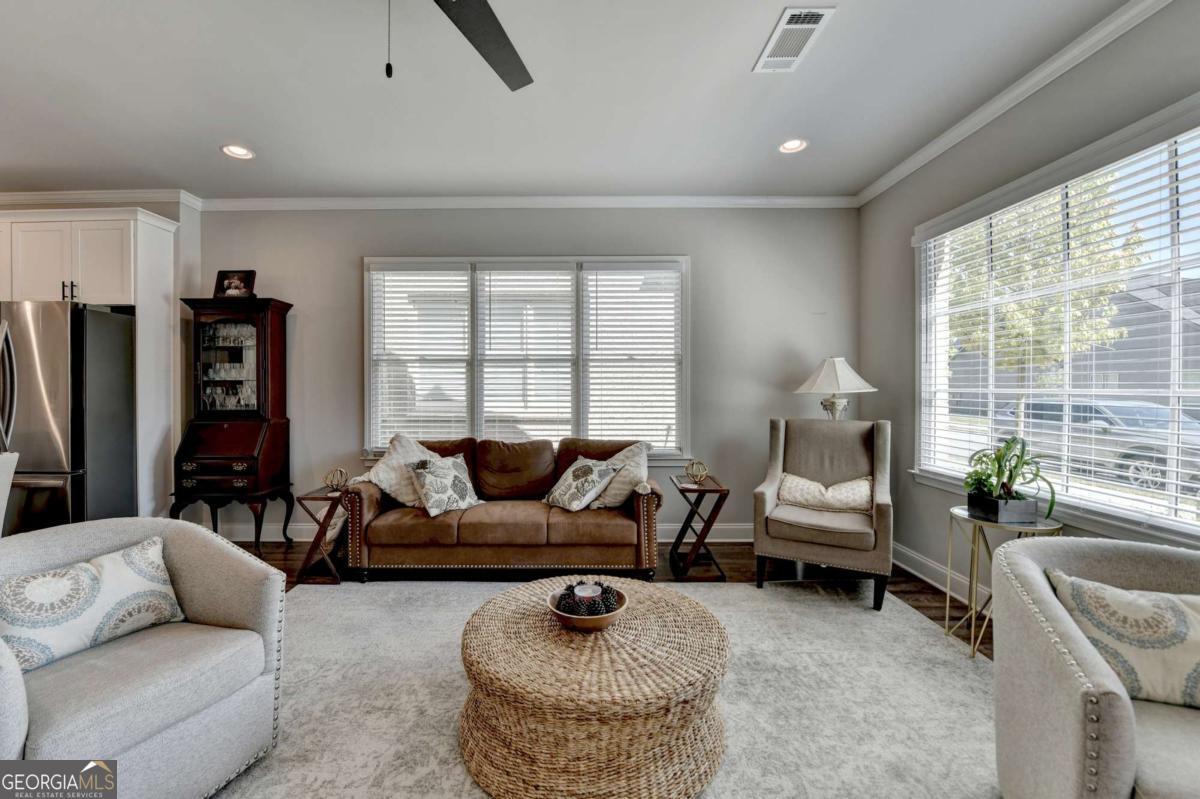 Discover comfortable, low-maintenance living in this beautiful 2-bedroom, 2-bath home located in the sought-after Cottages at Noble Village, an active adult gated community in the heart of downtown Lilburn. Designed with ease and elegance in mind, this home features an open layout perfect for entertaining, a modern kitchen with granite countertops, a spacious island, and stainless steel appliances. Throughout the home, luxury vinyl plank flooring complements the wide hallways and doorways, providing both style and accessibility. The oversized ownerCOs suite offers a spa-like experience with a double vanity, a zero-entry tiled shower with a built-in bench, and ceramic tile flooring. A large walk-in laundry room with a linen closet adds everyday convenience. Residents enjoy a secure, sidewalk-friendly neighborhood with level homesites and beautifully maintained grounds. The community clubhouse includes a fitness center, lounge with barn doors, a full kitchen, and welcoming spaces to gather with friends and neighbors, including an outdoor fire pit. Located just steps from local shops, restaurants, Lilburn City Hall, and the public library, this home offers both comfort and connection in a vibrant setting.
