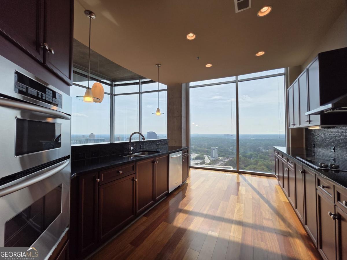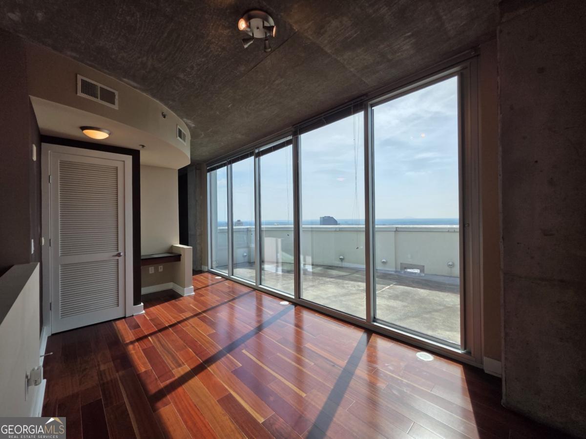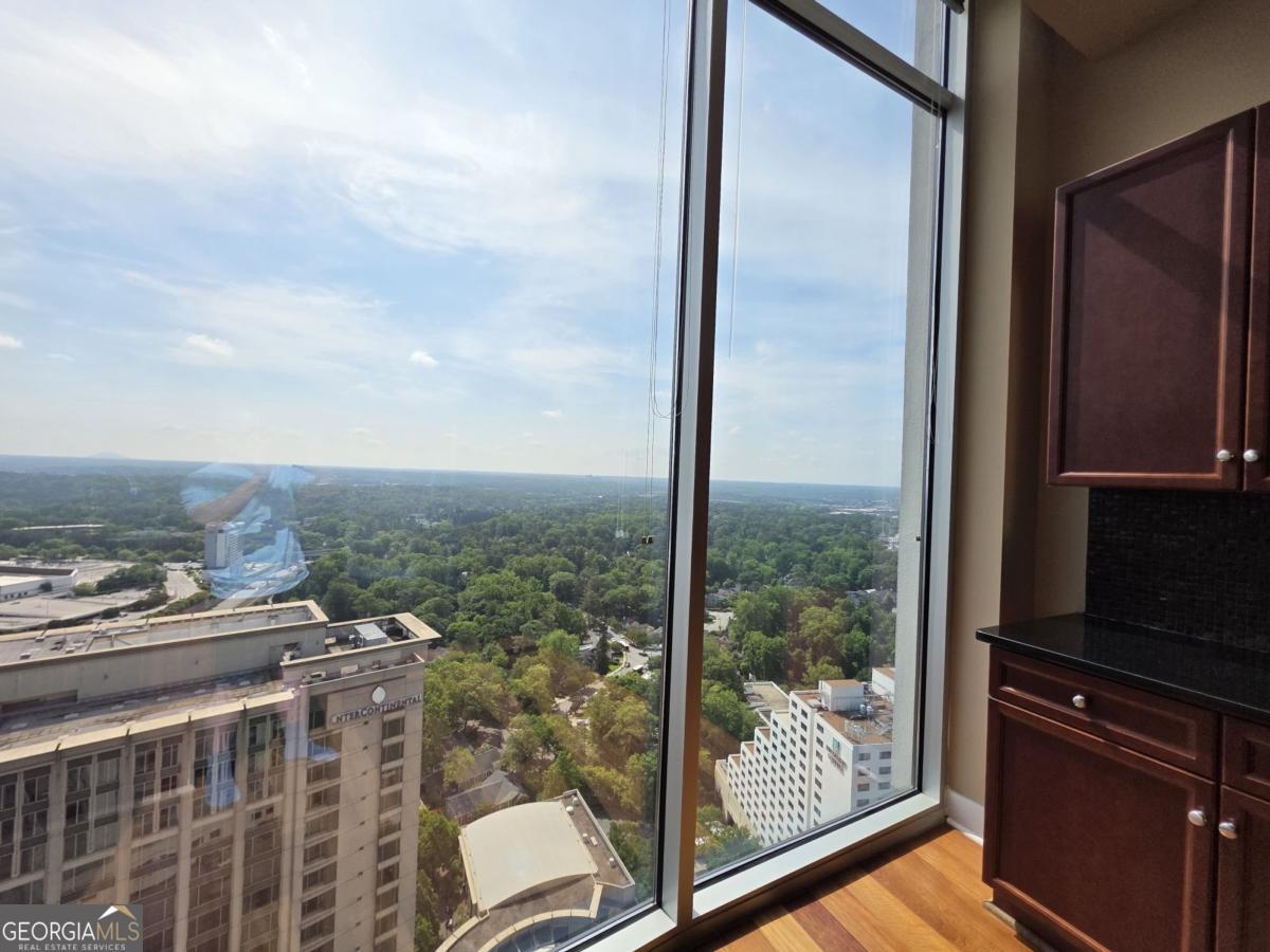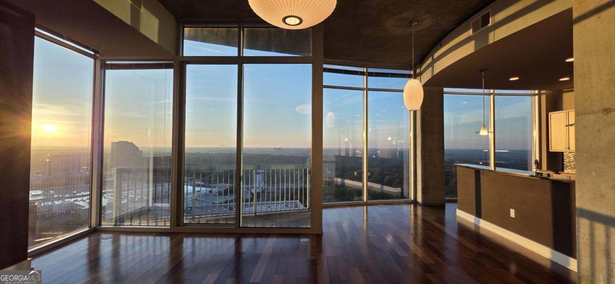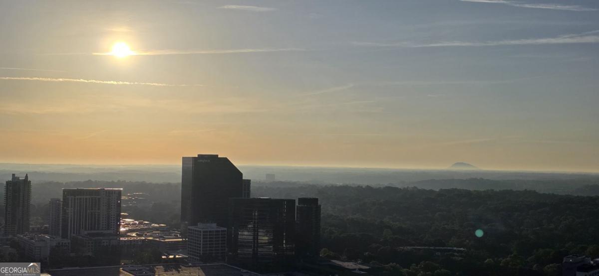 Welcome to this one-of-a-kind two-story penthouse in the heart of Buckhead! It features two bedrooms and two bathrooms with a bonus office/sitting area. The unit comes with a transferable leasing permit, which makes it a great investment opportunity, too. Walking into the main floor, the 12-foot ceiling height makes a big difference immediately with its spaciousness and openness. Floor-to-ceiling windows boast the breathtaking and unobstructed 270 degree view from the 30th floor, showcasing both the city skyline of contemporary Buckhead architecture and the natural beauty of Atlanta's renowned treetop canopy. The cherry on top is the view of Stone Mountain over the horizon where you can see the sunrise every morning. Imagine enjoying breakfast with the golden sunlight filling the property. It warms the soul and melts your heart. The unit faces east and north, which helps to escape the hot afternoon sun during the summer days. The floating staircases lead the way to the master bedroom and its walk-in closet on the second floor with 9 foot ceilings. The entire second floor is a stand-alone structure with no surrounding construction, ensuring peace of mind from neighbor noises guaranteeing the quietest rest. The 300 square foot rooftop balcony offers private sunbathing and the rare sense of owning a piece of the sky with the convenience of city luxury condo living. The space connecting the master bedroom and the rooftop balcony is perfect for a bonus office or sitting area if desired. Beautiful 5" Brazilian cherry hardwood floor throughout the property. Not a singe inch of carpet. The open concept kitchen features granite countertops and upscale cabinetry. The unit has significant storage space in itself, yet still comes with one extra storage unit at the lobby level. The unit includes two best deeded parking spaces, which are close to both the garage gate and the elevators. The parking spaces are separated from the others, so you will never be bothered from neighbors parking too closely. REALM condo services and amenities abound from 24-hour controlled access, security, concierge front desk, and package and mail services. The recently renovated community areas include two well-appointed club houses, a two-story state-of-the-art fitness center, and a rooftop swimming pool, rooftop garden and fire put, and various professional meeting areas. The beautifully landscaped garden in the front of the building centers around waterfall fountains with well maintained flowers and plants. The building also has a dog park for pet lovers. Live a glorious life on the storied Peachtree Road, within walking distance to Buckhead's finest restaurants, coffee shops, shopping centers, grocery stores, hotels, and MARTA allowing easy access to Hartsfield International Airport. The true beauty of this unique property can only be apreciated in person. Schedule a visit to your new home.