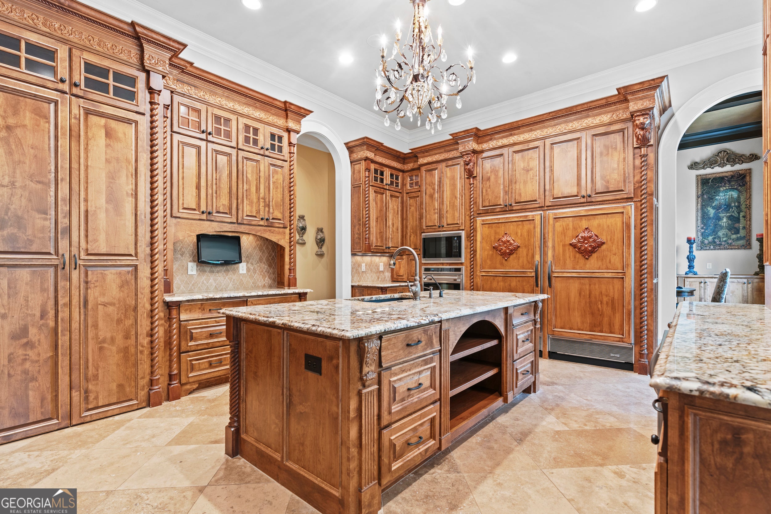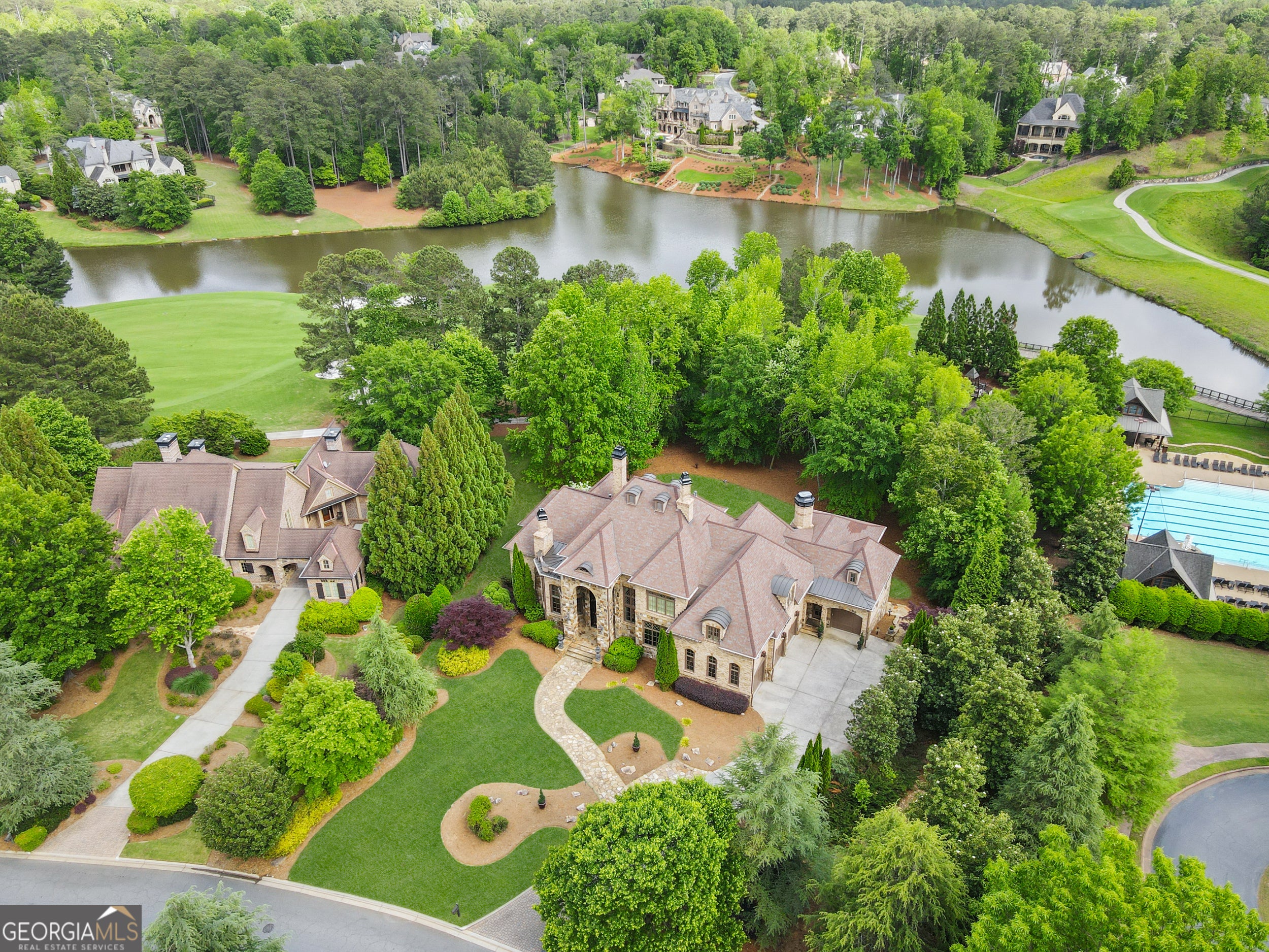 Welcome to 878 Middle Fork Trail. An Estate that epitomizes refined living, perfectly positioned on the 7th fairway of the Greg Norman Signature Golf Course with postcard perfect panoramic views and direct lake frontage. This premier lot is ideally situated adjacent to the community's state of the art Sports Center, offering effortless access to resort style pools, a fully equipped fitness center, playground, and Har-Tru tennis courts -all just steps from your door. A dramatic 20 foot custom iron door welcomes you into a soaring two story foyer with a sweeping curved staircase. The main level features a richly paneled executive office with fireplace and an additional flexible space ideal as a formal dining room or secondary office also with a fireplace. Soaring 12 foot ceilings on the main floor and 9 to 11 foot ceilings on the terrace level create an atmosphere of openness and grandeur. Designed for both lavish entertaining and intimate gatherings, this home boasts three distinct kitchens. The primary chef's kitchen is outfitted with Viking, Wolf, and Sub Zero appliances, dual islands, three ovens, dual dishwasher, ice machine, warming drawer and wine refrigerator. Every culinary detail considered. The terrace level features a second full service gourmet kitchen and bar, while the upstairs includes a third kitchen for ultimate convenience. Three laundry rooms - one on each level ensure effortless living. The main level primary suite is a sanctuary, complete with a morning kitchen, private terrace access, spa inspired bath with whirlpool tub, dual vanities, urinal and two expansive custom walk in closets. Upstairs, three generous bedroom suites each feature private bathe, while the terrace level offers an additional bedroom, a six bed bunk room, and three full bathrooms. Perfect for guests of multigenerational living. Enjoy a home theater, game room, steam room, and a spectacular bar / kitchen area that flows into a TV lounge with fireplace. With a total of 11 fireplaces (10 interior, 1 exterior), four decks/patios (three covered, one with an outdoor fireplace), and an underground fenced yard with gas grill and sprinkler system, this home is designed for year round enjoyment. Travertine and hardwood floors run throughout. All garages and terrace utility rooms feature industrial grade epoxy flooring. An elevator shaft is in place for future needs. The home is equipped with a comprehensive security system, fire alarm, and smoke detectors, all within a gated, guarded community. This one of a kind custom residence blends timeless craftsmanship, modern amenities, and unrivaled location - offering an exquisite living experience for the most discerning buyer. Too many features and upgrades to list. Schedule your private tour to experience this extraordinary home firsthand.