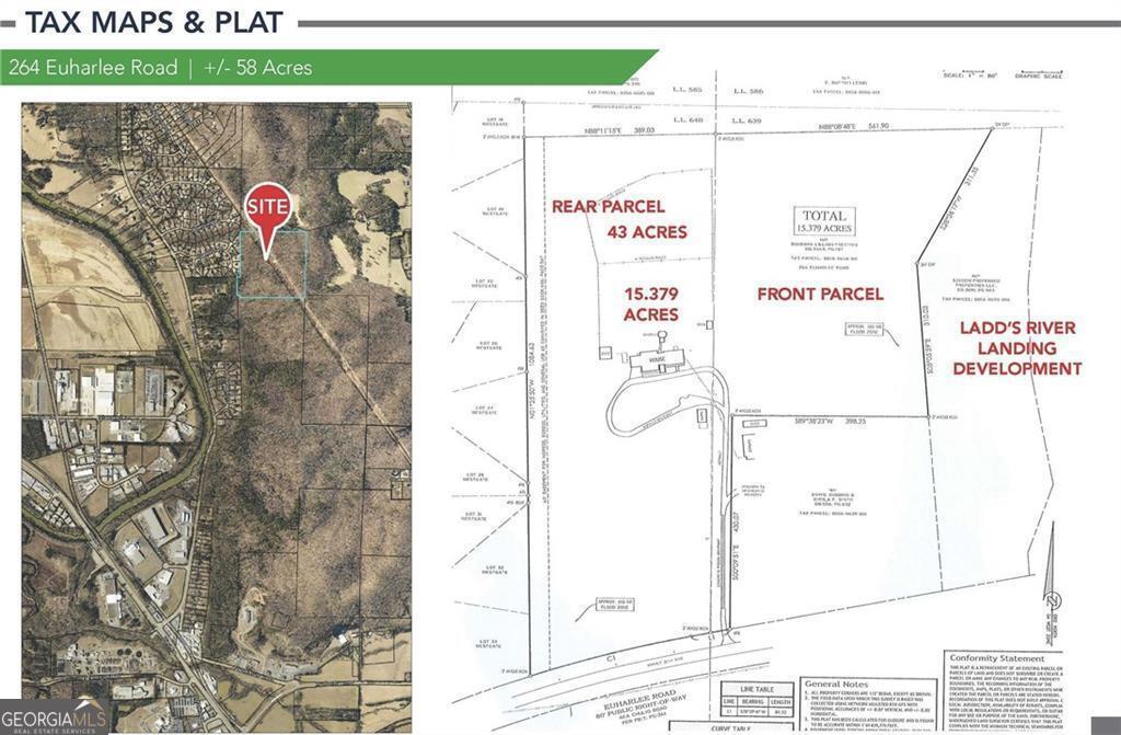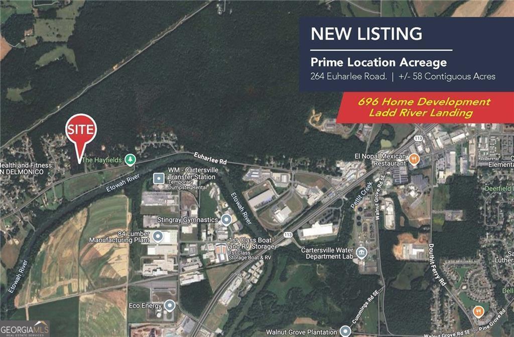 Two Property Assemblage including this 43 acre parcel and the contiguous 15.379 acres in front of this parcel. The GAMLS ID for the 15.379 acre parcel is 10519006. These parcels are adjacent to the Ladds River Landing development with 696 home sites. The potential for home sites on these 58.379 acres is estimated at 150-240, depending on the mix of single family homes and townhomes, both types of homes have been approved for the adjacent Ladds River Landing development by Lennar Homes. All public utilities are available including Bartow County Sewer. The combined list price for the assemblage is $2,750,000. This property is located 6 miles the I-75 Main Street Exit #288, 3.2 miles from downtown Cartersville and is across the street from the Etowah River. Georgia Power Transmission Lines Traverse this parcel.