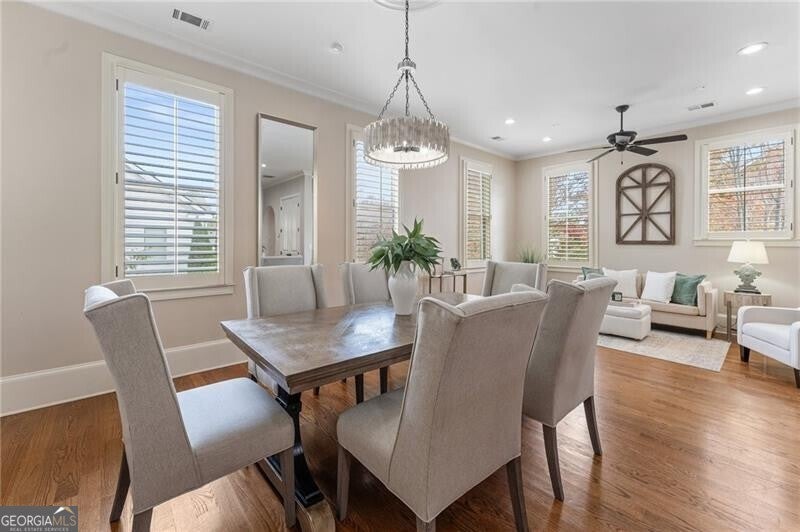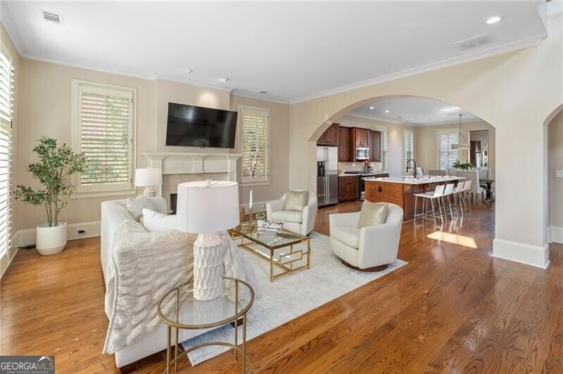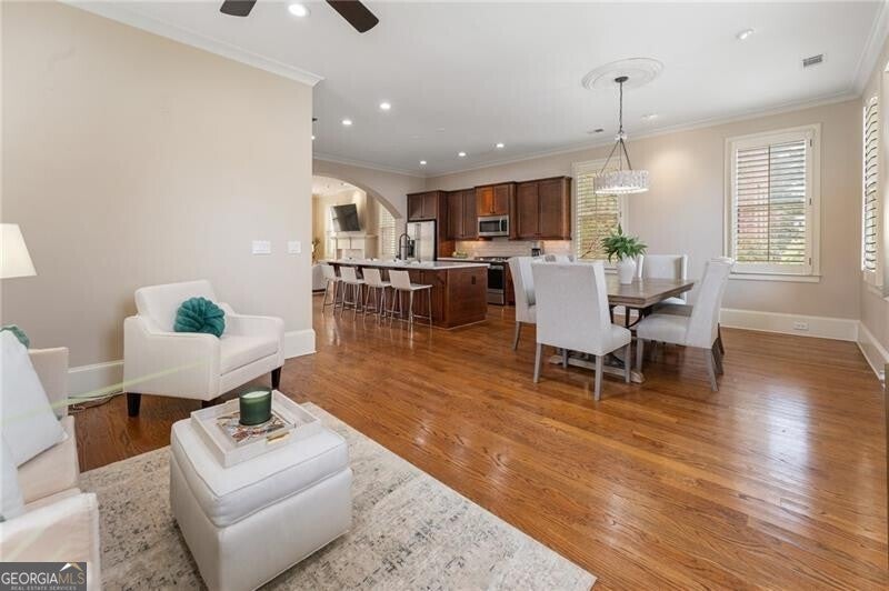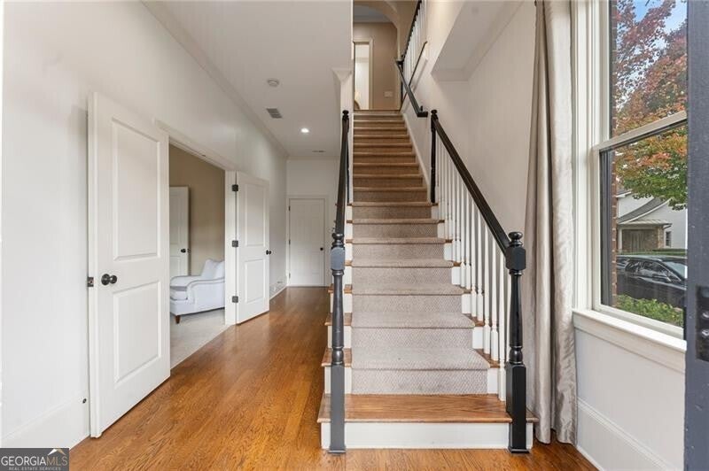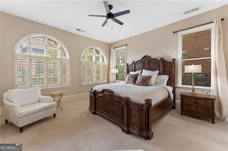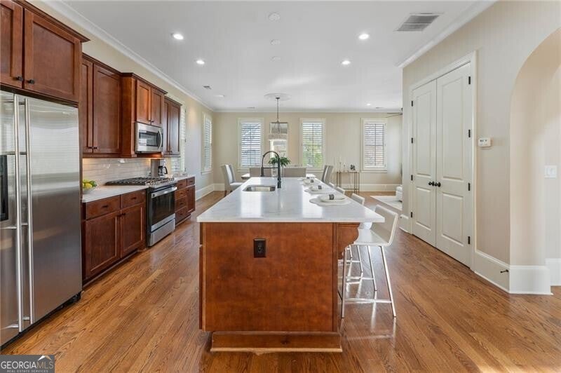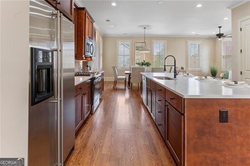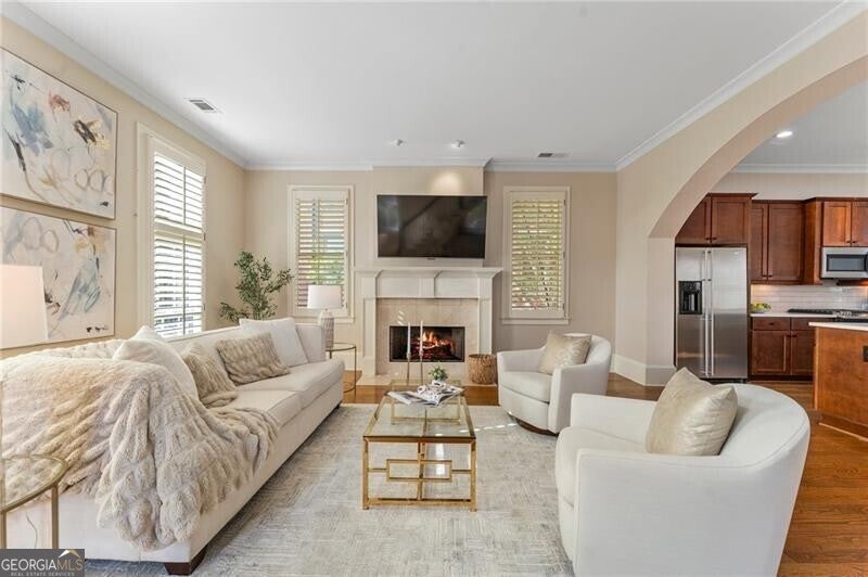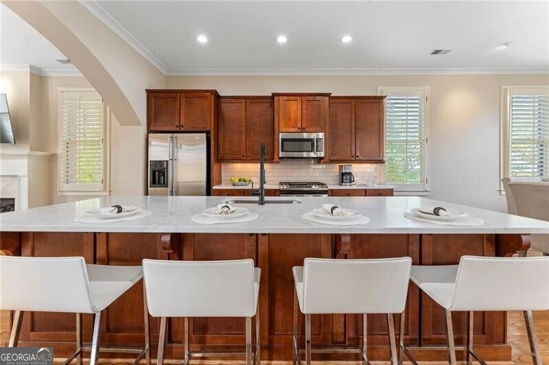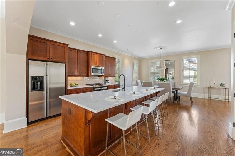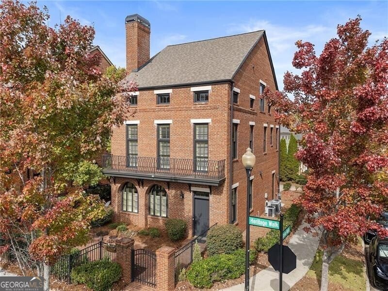 Back on Market at no fault of Seller! Live the Coveted Crabapple Lifestyle. Welcome to one of the original-and rarely available-brownstones in the heart of the Crabapple Market District. This exceptional, all-brick detached home offers timeless charm, thoughtful updates, and unbeatable value compared to nearby new construction townhomes priced around $1.5 million. With 2 spacious bedrooms, 2.5 baths, and generous living areas, this home also features a versatile loft/office with built-in workspace. Enter through a charming gated front courtyard or via the rear-facing 2-car garage into a welcoming two-story foyer. The ground level includes a large guest suite with a full bath-ideal for visitors or multi-generational living. Upstairs, the main living area is bathed in natural light and features 10+ foot ceilings, hardwood floors, and floor-to-ceiling windows with elegant plantation shutters. The gourmet kitchen has been tastefully upgraded with honed Michelangelo quartz countertops, a stylish new backsplash, and a brand-new gas range. Adjacent spaces include a warm fireside great room, a large dining area, and a cozy keeping room-perfect for entertaining. The top floor is dedicated to the oversized primary suite, complete with an expansive custom walk-in closet, a spa-inspired bathroom with a double vanity, soaking tub, walk-in shower, and updated countertops. A separate laundry room and a sunny loft/office complete the upper level. Other highlights include: Four-sides brick construction with no shared walls; Newer systems (roof 3 years old, newer HVAC, water heater 2019); Finished garage floor with $7,500 in custom built-ins for optimal storage; Fully fenced yard; and HOA covers all yard maintenance for $650/quarter. All of this, just steps away from dozens of shops, restaurants, fitness studios, and healthcare providers. Crabapple is more than a neighborhood-it's a vibrant community. This is an investment in your quality of life - come see for yourself what makes this home and lifestyle so special.