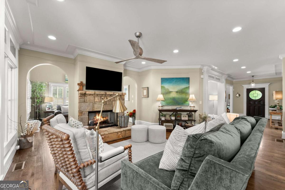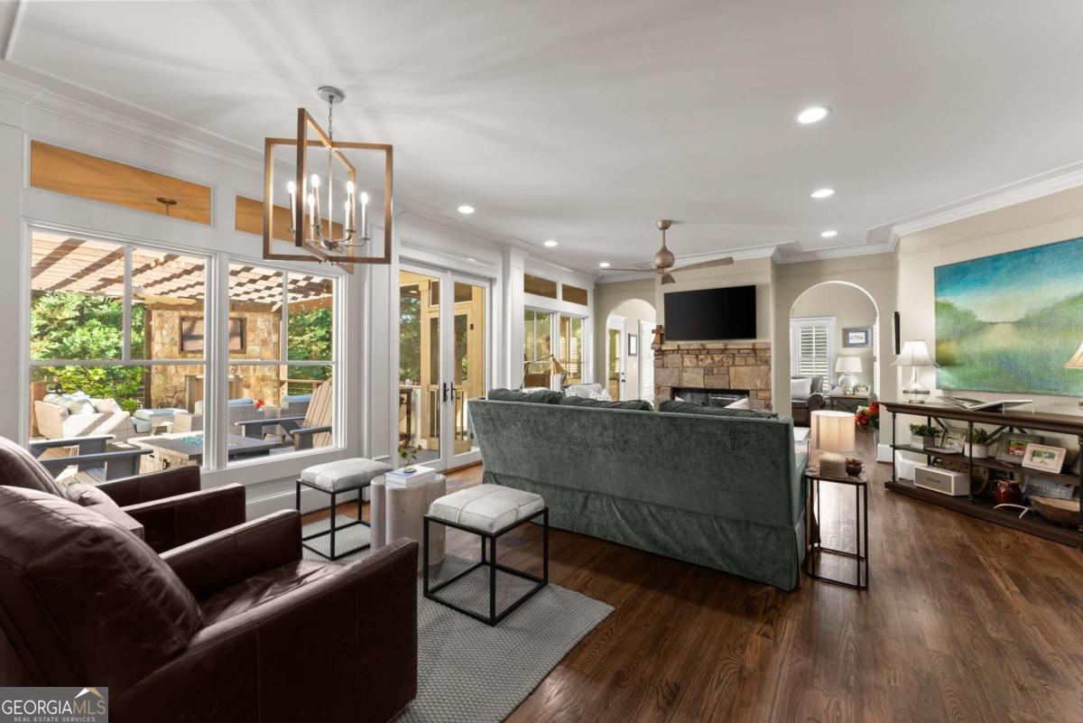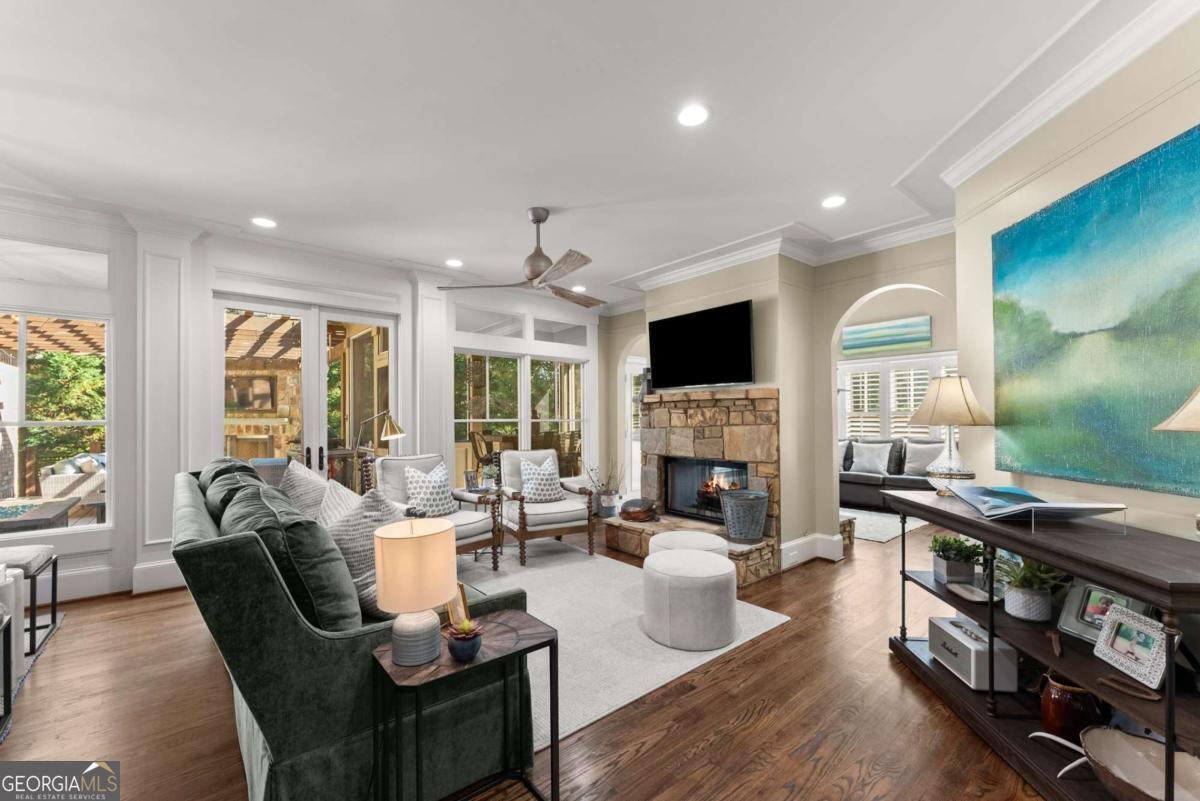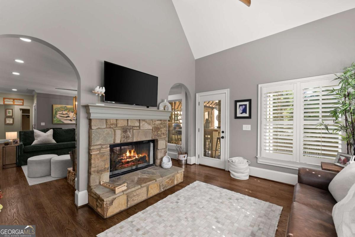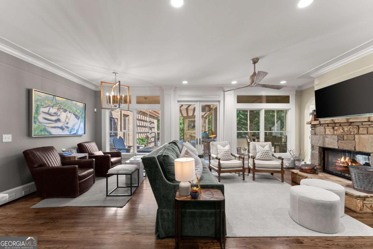 Effortless elegance and designer details. Perfectly placed just off Riverside Drive-one of Gainesville's most beloved and walkable streets-this 6,000+ square foot showpiece delivers luxury without pretense. Brought to life with refined sophistication by distinguished designer Matthew Quinn of Design Galleria, every inch of this home is crafted for beauty, function, and comfort. The kitchen stuns with custom cabinetry, hidden storage, a Sub-Zero fridge and freezer, Wolf range, and sleek, sculptural finishes-all designed to anchor the home with style and performance. Entertain with ease in the formal dining room, or gather in the open-concept living and keeping rooms, joined by a striking double-sided stone fireplace. A vaulted, light-filled office with exposed beams makes working from home a dream, while the main-level primary suite is a serene retreat with a cozy sitting area, custom walk-in closet with laundry access, and a spa-like bath wrapped in Carrera marble. Upstairs, find three spacious bedrooms, two bathrooms, and a flexible loft ideal for reading, relaxing, or teen hangouts. The fully finished terrace level adds two more bedrooms, a full bath, second kitchen, large living area, and home gym-perfect for multigenerational living or long-term guests. Outdoor living is just as inviting, with a vaulted screened-in porch, an open-air deck with fireplace and TV, and a completely fenced backyard-private, peaceful, and professionally landscaped. Additional highlights include three stone fireplaces (two indoors, one out), whole-house generator, three-car garage, newer mechanical systems and roof, and impeccable finishes throughout. This is the kind of home you simply can't recreate at today's prices-especially not in Riverside.