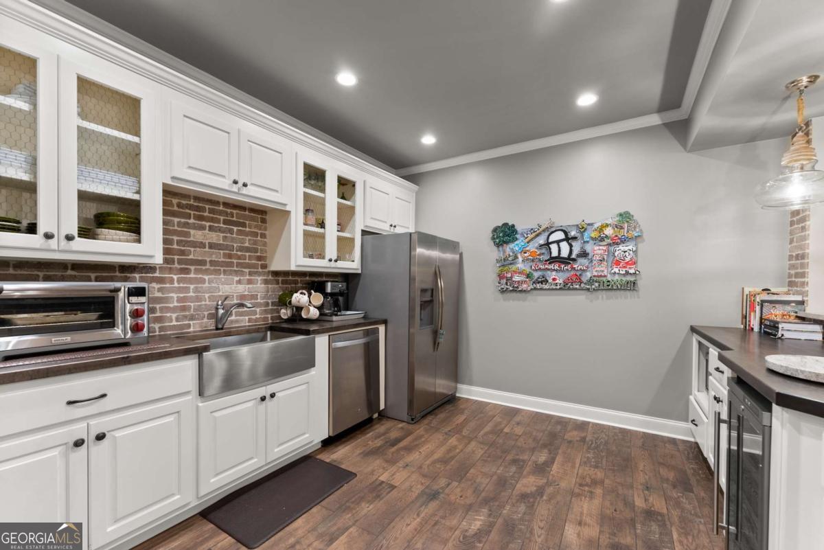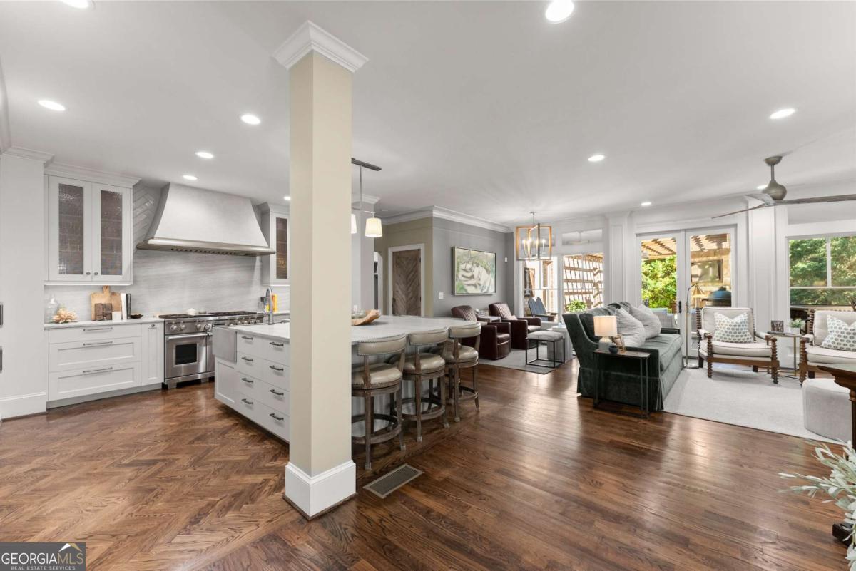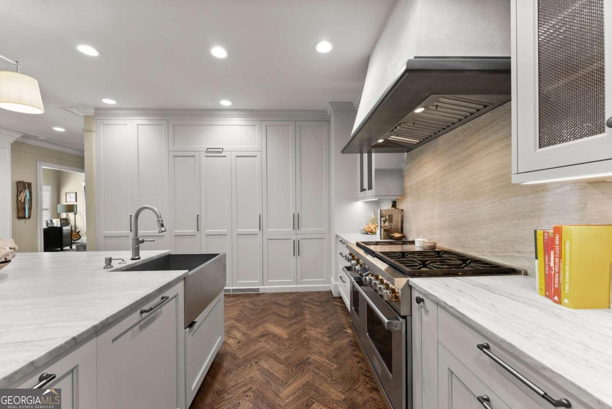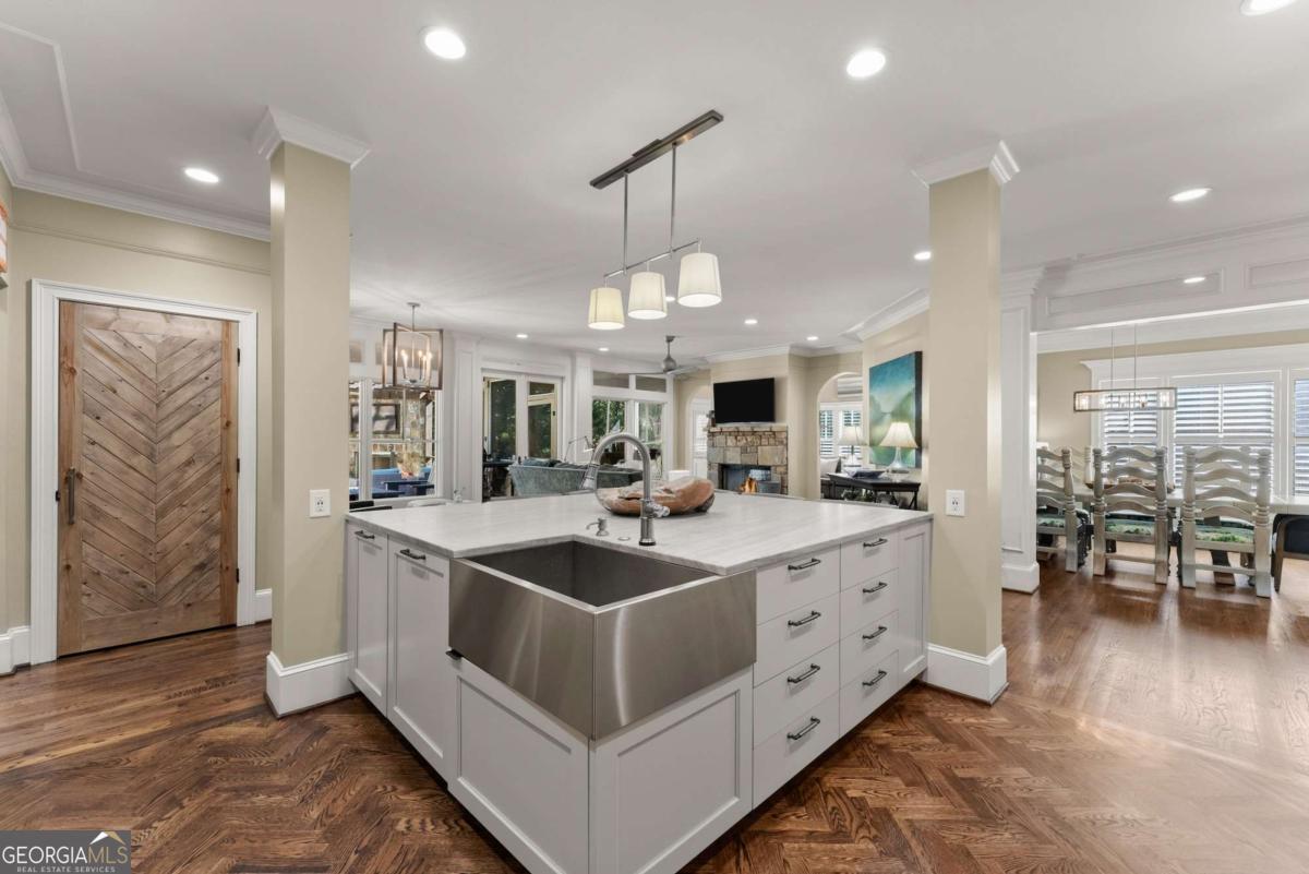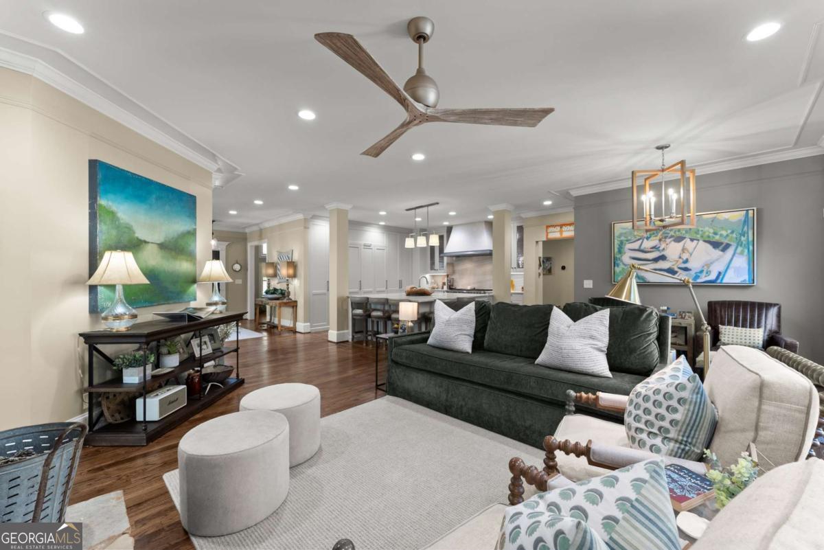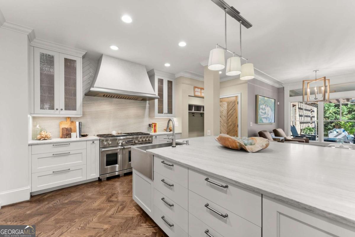 Effortless elegance and designer details. Perfectly placed just off Riverside Drive-one of Gainesville's most beloved and walkable streets-this 6,000+ square foot showpiece delivers luxury without pretense. Brought to life with refined sophistication by distinguished designer Matthew Quinn of Design Galleria, every inch of this home is crafted for beauty, function, and comfort. The kitchen stuns with custom cabinetry, hidden storage, a Sub-Zero fridge and freezer, Wolf range, and sleek, sculptural finishes-all designed to anchor the home with style and performance. Entertain with ease in the formal dining room, or gather in the open-concept living and keeping rooms, joined by a striking double-sided stone fireplace. A vaulted, light-filled office with exposed beams makes working from home a dream, while the main-level primary suite is a serene retreat with a cozy sitting area, custom walk-in closet with laundry access, and a spa-like bath wrapped in Carrera marble. Upstairs, find three spacious bedrooms, two bathrooms, and a flexible loft ideal for reading, relaxing, or teen hangouts. The fully finished terrace level adds two more bedrooms, a full bath, second kitchen, large living area, and home gym-perfect for multigenerational living or long-term guests. Outdoor living is just as inviting, with a vaulted screened-in porch, an open-air deck with fireplace and TV, and a completely fenced backyard-private, peaceful, and professionally landscaped. Additional highlights include three stone fireplaces (two indoors, one out), whole-house generator, three-car garage, newer mechanical systems and roof, and impeccable finishes throughout. This is the kind of home you simply can't recreate at today's prices-especially not in Riverside.