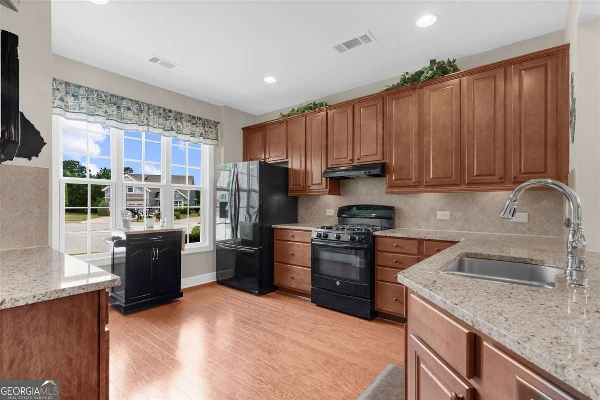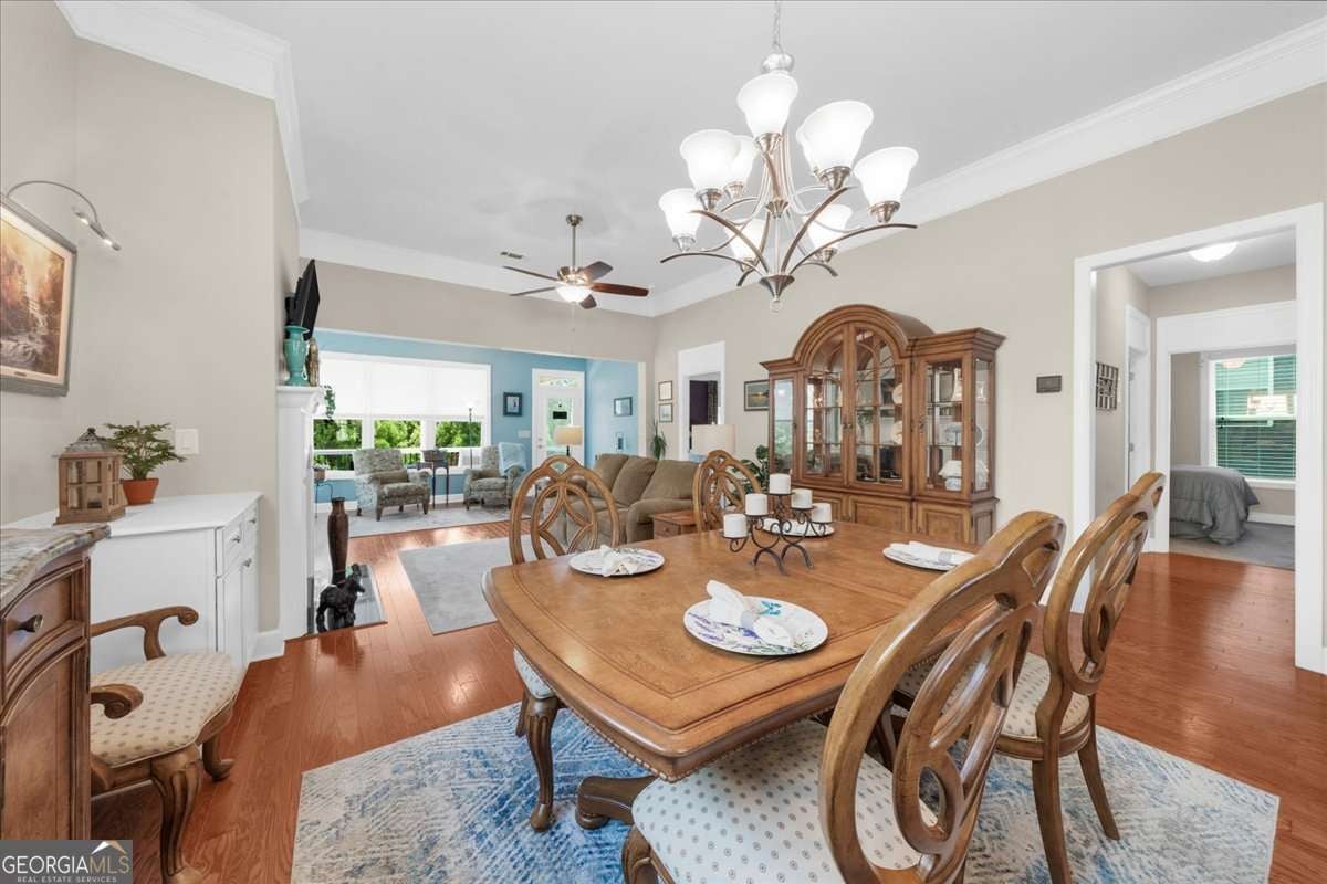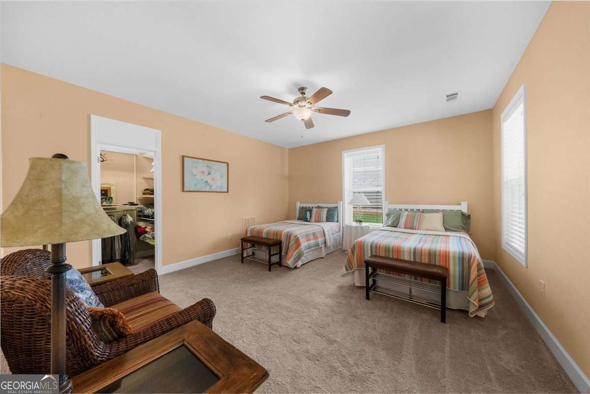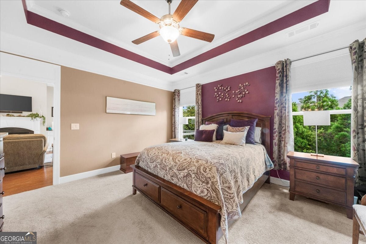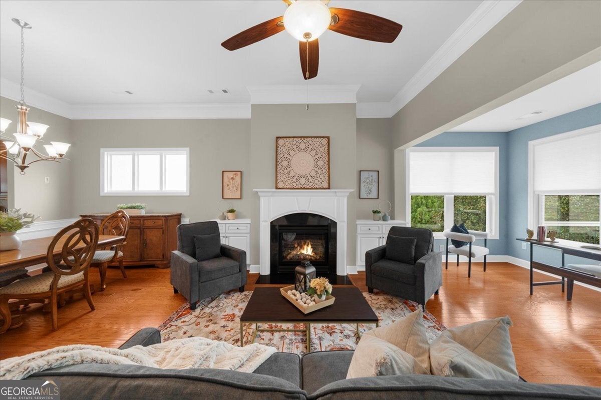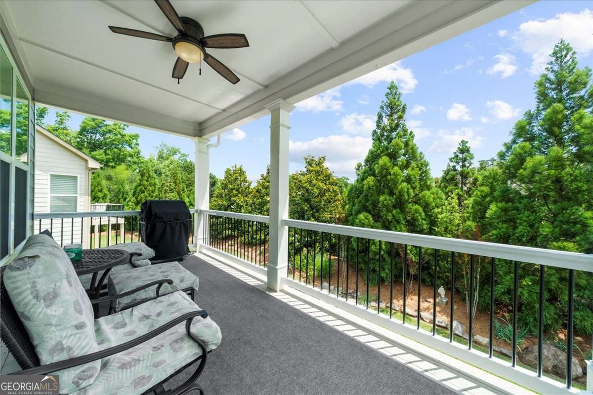 Located in the esteemed Cresswind at Lake Lanier, an award-winning, resort-style community catering to individuals aged 55 and above, this well-maintained residence exemplifies quality living. Positioned on a tranquil cul-de-sac, the property offers two primary suites-one situated on the main level and another on the terrace level-providing optimal flexibility and privacy. The home features custom interior painting with an open-concept design that seamlessly connects the sunroom, chef's kitchen, guest room with an adjacent full bathroom, laundry area, and a covered deck. The terrace level comprises a spacious family room equipped with a full bar, a second primary suite, a versatile flex room, unfinished storage, and a covered patio leading to a private yard A series of thoughtfully selected upgrades are evident, including wainscoting, crown molding, and hardwood flooring. Custom cabinetry flanks both sides of the fireplace, while the open sunroom extends the area further. The chef's kitchen is appointed with a breakfast bar, upgraded cabinetry, granite countertops, a coordinated backsplash, a gas range with vented hood, a refrigerator, and a generous pantry. Under- and over-cabinet lighting provides superior illumination, and a kitchen TV connection adds convenience. The main-level primary suite features a tray ceiling, dual closets with Elfa shelving systems, dual vanities, a walk-in shower, and recessed medicine cabinets. Additional amenities on the main floor include a secondary bedroom with a full bath and a spacious laundry room outfitted with storage cabinetry and a washer/dryer. The terrace level features a large living area with a granite-topped bar that seats 5-6, complete with a sink, dishwasher, refrigerator, and storage cabinets. The family room supports surround sound integration, and above the bar is a TV and an electrical outlet. The second primary suite boasts a walk-in closet and an en-suite bathroom featuring a frameless, oversized shower and linen closet. The multi-purpose flex room may serve as an office, workshop, hobby space, or additional bedroom. Unfinished areas provide valuable storage. The covered patio is designed for outdoor entertainment, offering integrated speakers, dimmable lighting, a TV connection, and natural gas hookups on both the upper deck and lower patio. Yard work is covered in the HOA dues. The property includes an extended garage and an extra-long driveway, and recent updates include a new HVAC system (2022), exterior painting (2023), and a hard-wired alarm system. Award-winning Cresswind at Lake Lanier offers kayaking, fishing, courtesy boat docks, over 120 clubs, an arts and crafts room, pickleball, tennis, indoor & outdoor pools, a state-of-the-art gym, dance & fitness classes, card and games, billiards, plays, a chorus, and an on-site activities director and property manager. I live at Cresswind and welcome you to join us to live your best life!
