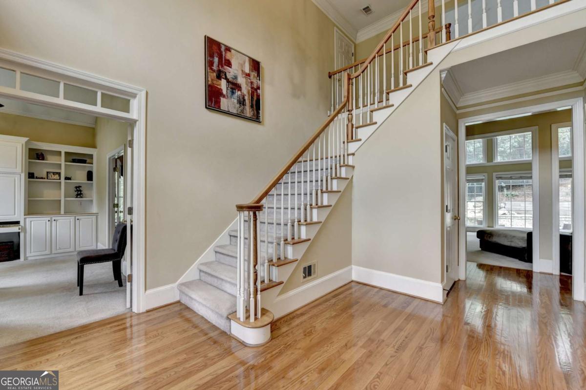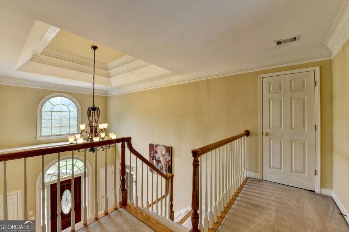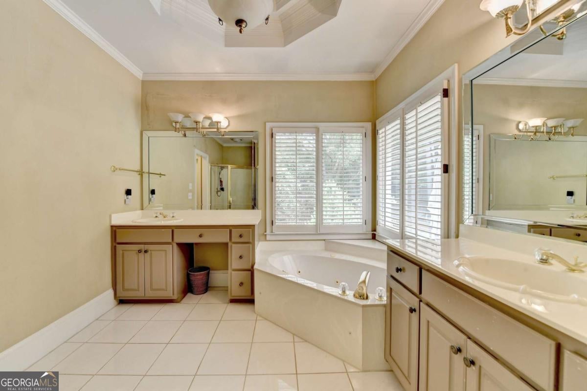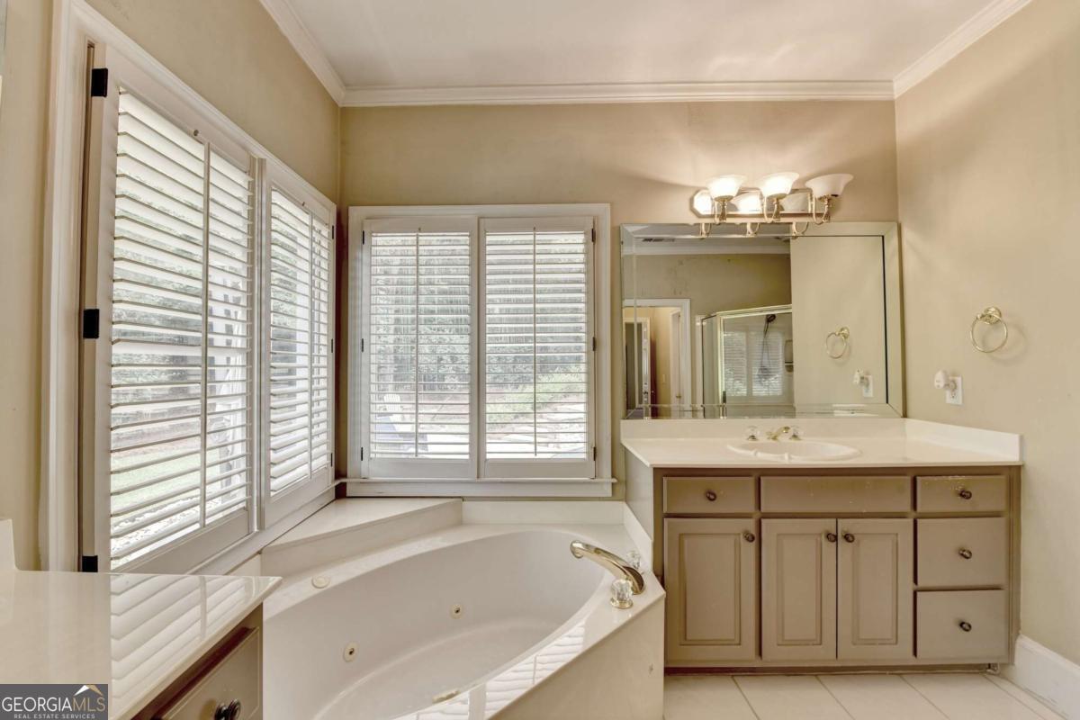 Gorgeous 5 bed/4.5 bath MASTER-ON-MAIN home with HEATED SALTWATER POOL and finished TERRACE LEVEL on a private, CUL-DE-SAC. Step through the arched stone entryway into the 2 story hardwood foyer with double tray ceiling. To your right is the family-sized DINING ROOM with crown and picture frame molding, bayed window and hardwood floor. French doors open to the elegant OFFICE with custom cabinetry, vaulted ceiling and convenient door to the master-on-main bedroom! The grand FAMILY ROOM features a 2 story vaulted ceiling, marble fireplace, custom built-ins and wall of windows overlooking the stunning POOL and private backyard. The gourmet kitchen is perfect for the family chef and features custom cabinetry, a large eat-in island, quartz countertops, stainless steel appliances, a gas cooktop, DOUBLE WALL OVEN, tile backsplash, hardwood floor, WALK-IN PANTRY and work station. This large open plan space also features a bayed BREAKFAST ROOM with door to the expansive patio and luxurious POOL! The romantic MAIN FLOOR MASTER suite features a double tray ceiling and a spa bath with tile floor and shower, double vanity, custom cabinetry, WHIRLPOOL TUB and HIS-AND-HERS closets with built-in cabinetry. A convenient mud/laundry room with SINK and a pretty powder room complete the main level. Upstairs are FOUR large bedrooms, each with crown molding. These large bedrooms share 2 tiled Jack-and-Jill tiled bathrooms; 1 with a double vanity and custom cabinetry. The finished terrace level features wood floors, a family room, a large GAME room, bar with tray ceiling, stain-grade cabinetry, wine fridge, bar fridge and beer KEGORATOR. A MEDIA ROOM, EXERCISE area and huge built-in SAUNA, full bathroom with TILE FLOOR and shower complete this expansive space! This exquisite home's outdoor spaces are sublime! Beautifully designed to create numerous entertaining and relaxing areas! HEATED SALTWATER POOL with a large hot tub and stone pavers, stack stone FIREPLACE, cozy FIREPIT and spacious patio areas. The backyard is completely PRIVATE and beautifully landscaped! This is an incredible opportunity to own a home in the prestigious GOLF/SWIM/TENNIS/GATED Laurel Springs community! Along with being in the SOUGHT-AFTER LAMBERT HIGH SCHOOL district, it features 24-HOUR SECURITY, a private JACK NICKLAUS GOLF COURSE, clubhouse with fitness center, TENNIS courts and tennis team, pickleball courts, swimming POOL with kid's pool and waterslide, swim team, playground area and so much more! The perfect place to call home! ***This home is being sold AS-IS and no epairs will be made by Seller***