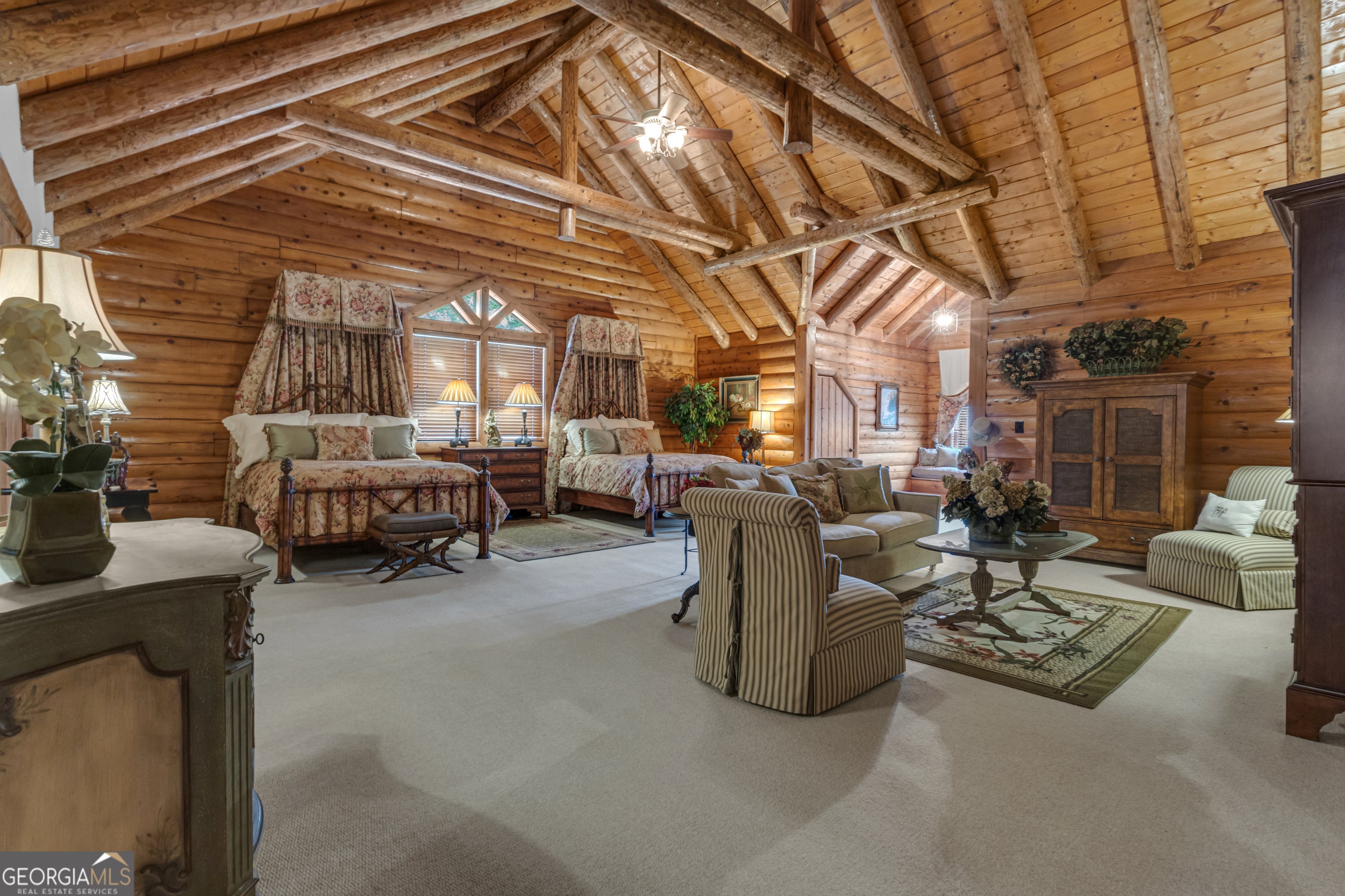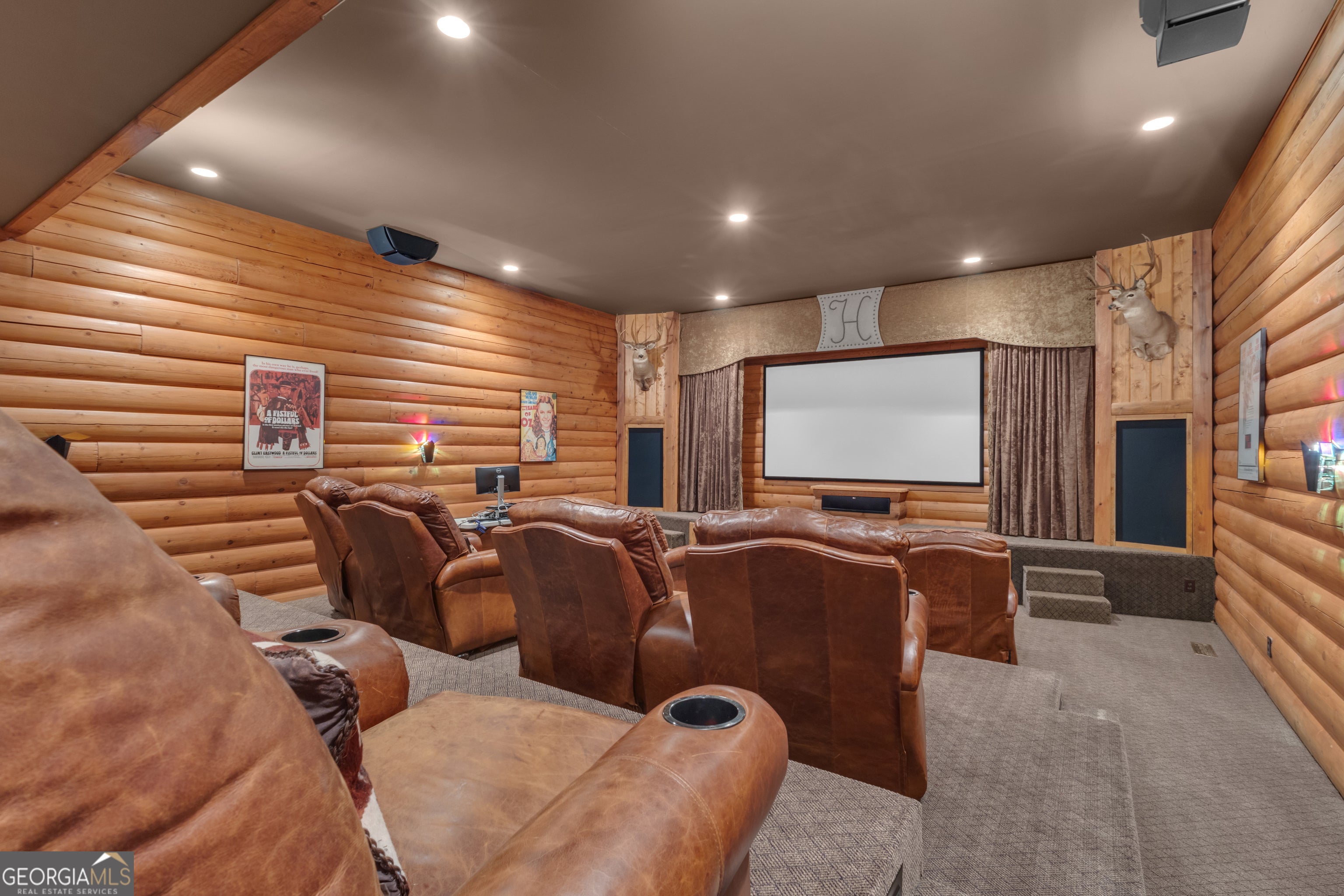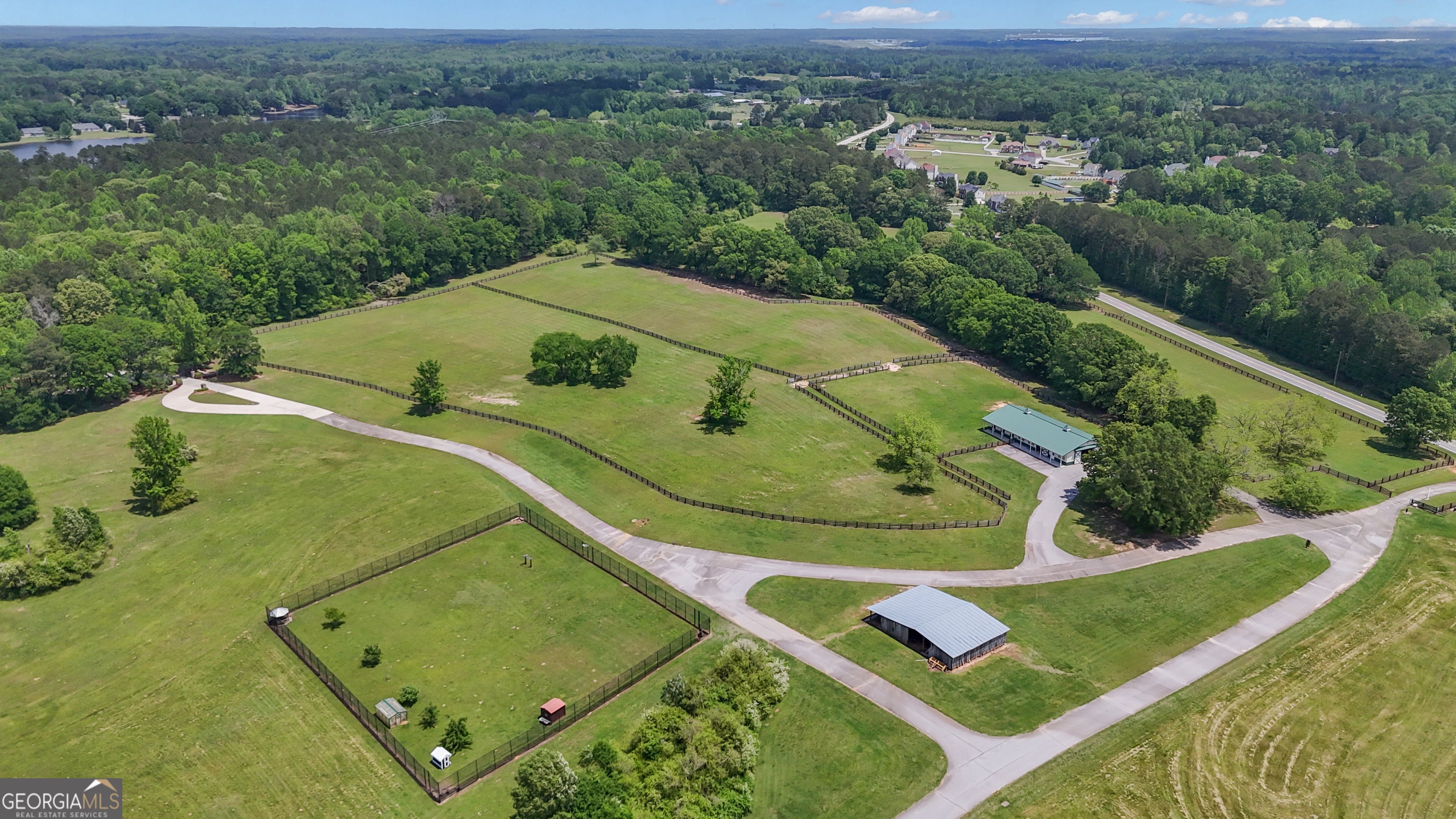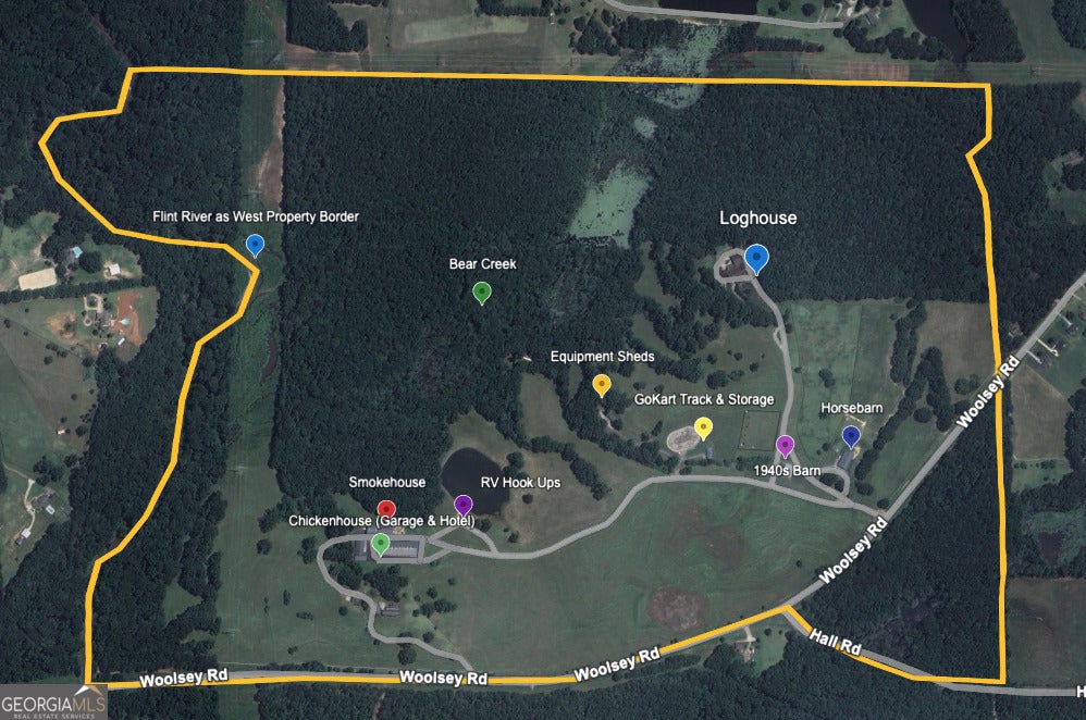 Watch Video! Experience unmatched luxury and recreation on 357 acres with over a mile of Flint River frontage and 4,000 ft along Bear Creek. This gated estate features a custom built loghouse and multiple high-quality steel Morton buildings. LOGHOUSE Stunning custom-built main house. Drive up to your own mountain style log retreat with a welcoming waterfall and around 20,000 finished sq ft. 2-story foyer entry and formal living space. A total of 5 bedrooms and 7 full bathrooms at the main house. There are two primary suites on the main floor. Custom kitchen with two working islands featuring copper hightops, breakfast area with fireplace, 3 ovens, large gas cooktop, built-in fridge and freezer. Laundry rooms on the main floor and upper floor. Pool with hot tub and stone fireplace. 12 seat theater with rumble seats. Gym room & sauna. Double deep garage holds 6+ cars with two industrial height doors and one standard door. Head upstairs to 3 suites, one suite is set up as an executive home office. Come hang out in the basement and be transported to an elegant lounge area with several gathering spaces, fireplace, library, copper ceiling, multiple TVs, full bar, wood paneled walls and columns, and game room with full bath. Large bonus room with full bath. Featured utility info: whole house automatic generator, 7 AC units, meridian phone system, Control4System for whole home TV controls, Rain Bird sprinkler system, commercial water drains. SMOKEHOUSE is your separate entertainment venue that includes a large performance theater with a full stage, 24 premium seats, flexible space for additional tables and seating, conference room, catering kitchen, and large stone patio space with firepit. CHICKENHOUSE Make way for your vehicles and guests at the Chickenhouse with Bunkhouse. This is a hotel style guest house with 5 bedrooms and 5.5 bathrooms connected to two enclosed drive through maintenance bays for vehicles, and open bays for additional RV and recreational storage. Water and air compressors built-in on each side of the shops. Fuel tanks on site. Additional 4 RV hook up stations with two around the private pond with electricity and water plus a blackwater connection site near two of the RV pads in front of the Chickenhouse. Both the Chickenhouse & Smokehouse are on backup generators. HORSEBARN Bring your animals to this 11 stall stables featuring a tack room with laundry hook ups, office with half bath, storage room, wash stall. Connected to 3 paddocks. GOKART TRACK & BARN Small GoKart Track and barn is located just off the main property road and also leads to the Equipment Sheds, three additional open bay storage buildings tucked away in the woods on the path to recreational trails. LOCATION Over one mile of road frontage on Woolsey Rd. Conveniently located about 4 miles to the local regional airport south of Atlanta and less than 24 miles from Hartsfield-Jackson Atlanta International Airport. 13 miles to Piedmont Fayette Hospital or 17 miles to Piedmont Henry. 15 miles to Trilith Studios.