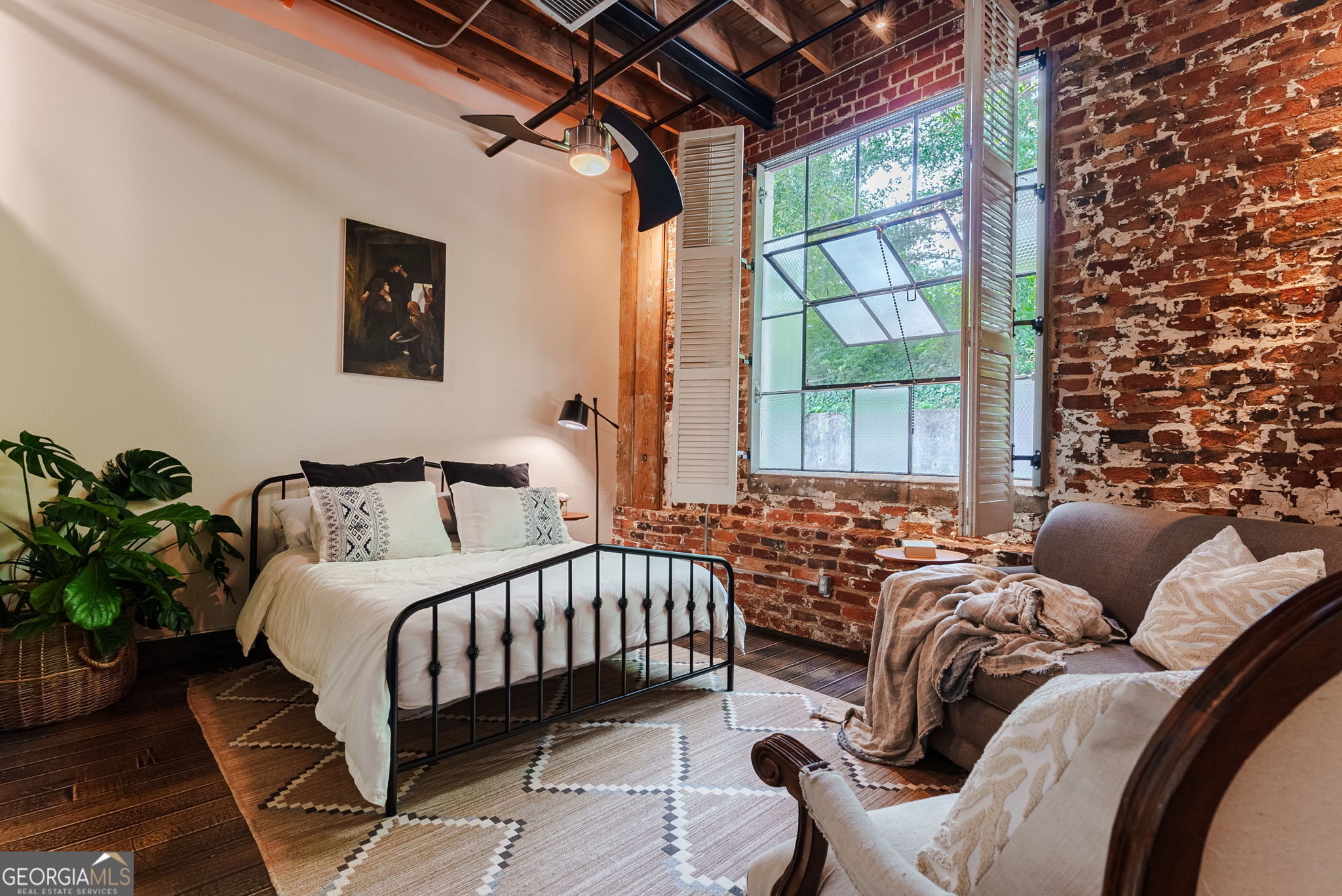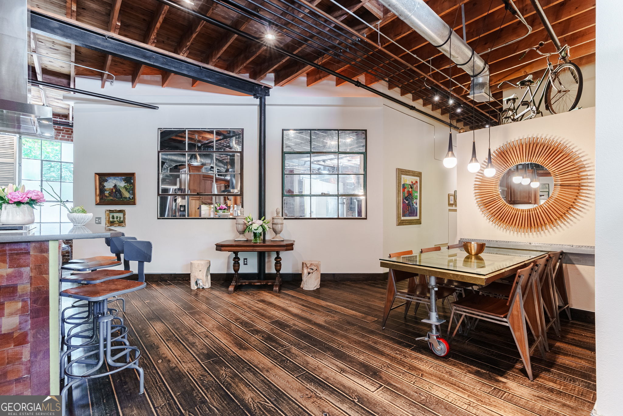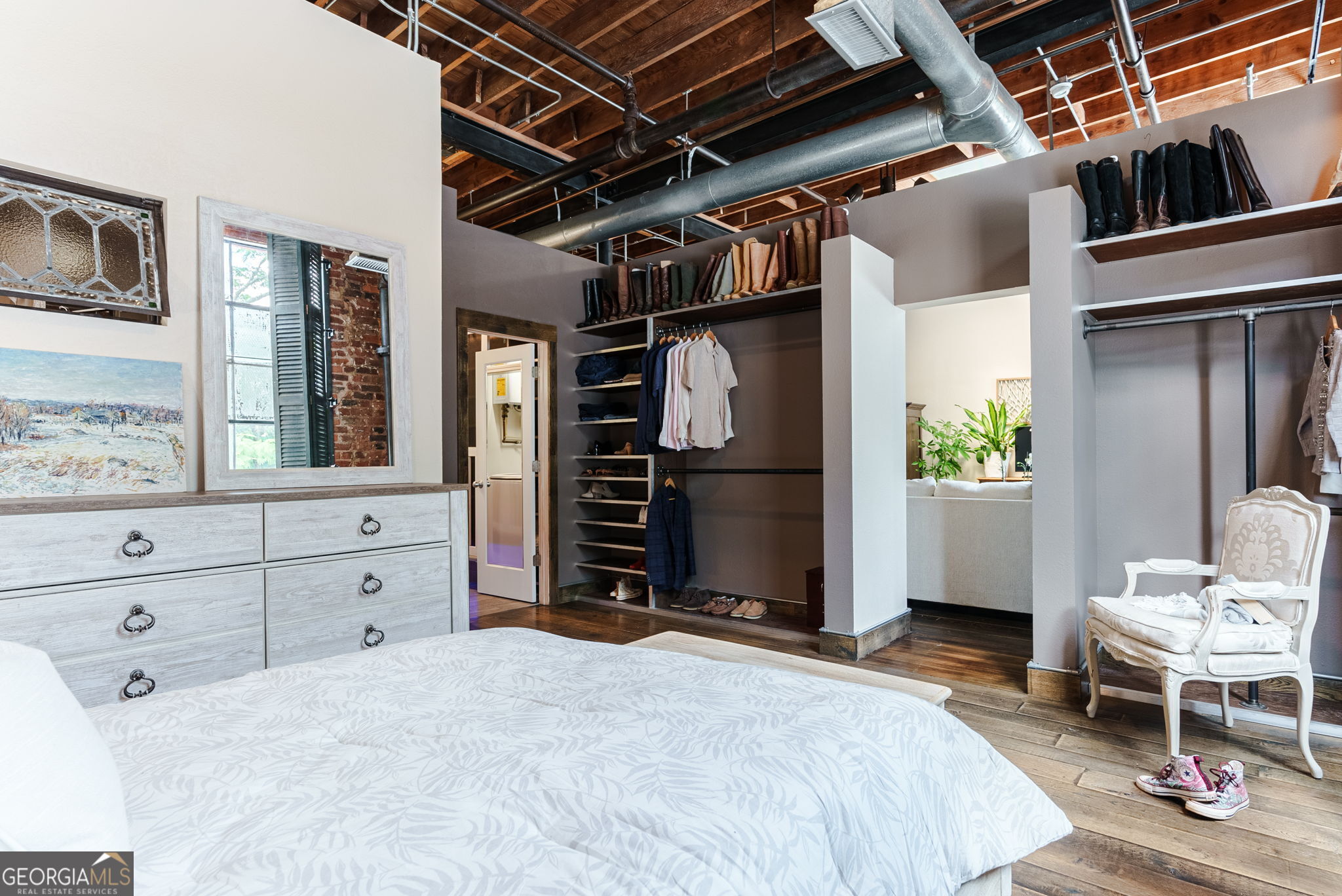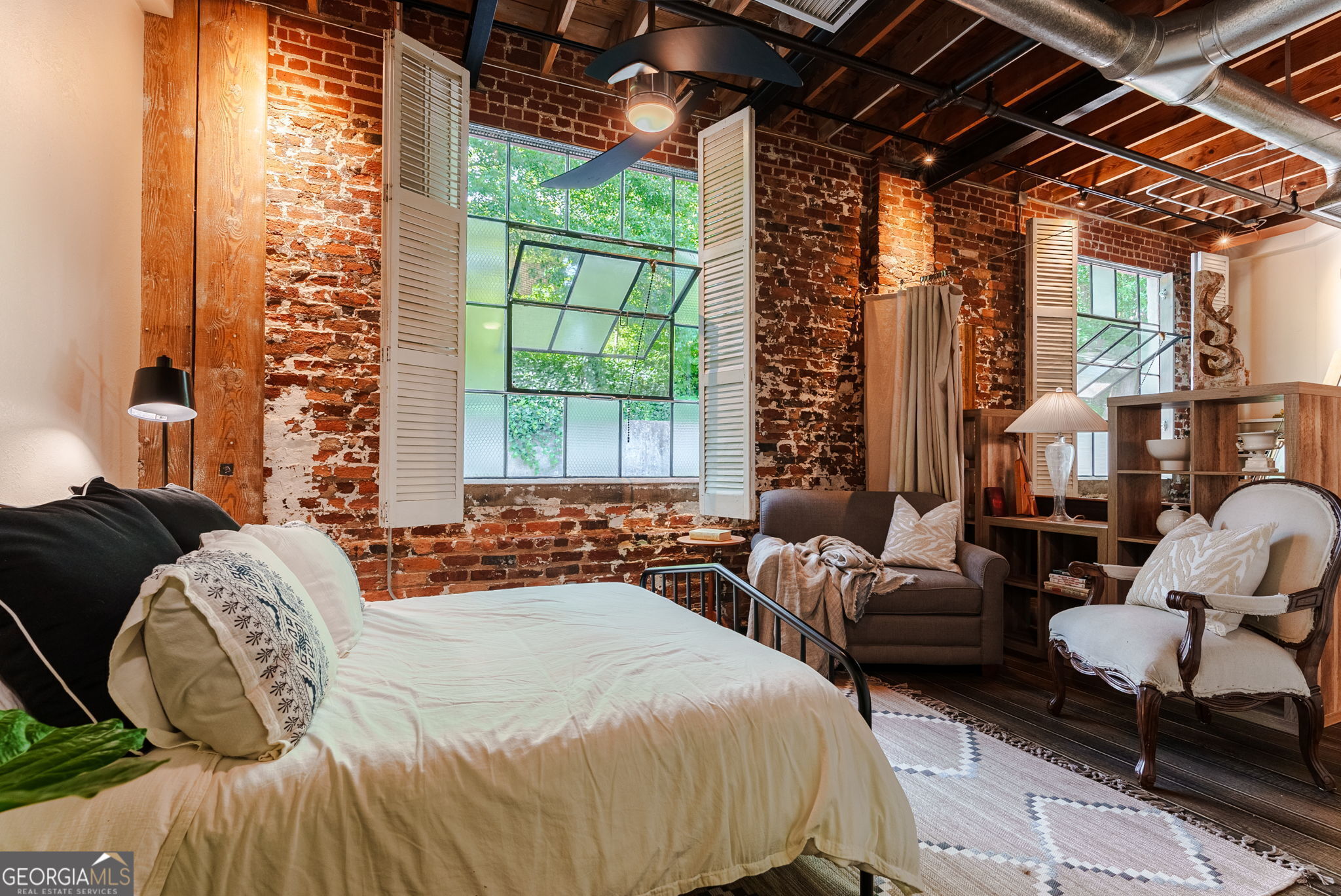 FURNISHED! Two Bedrooms, two full baths, plus a loft! This beautifully restored warehouse loft, designed by a master craftsman and preservationist, blends historic charm with modern luxury in the waterfront community of Whitehall Mill Lofts, a National Historic Landmark. Enter through a machine-burnished stainless-steel front door into an elegant Grand Foyer. The open layout reveals massive windows, offering sweeping views of the original textile warehouse. The kitchen, crafted from American walnut, features high-end Cambria countertops, copper sinks, and antique nautical lamps reworked with LED lighting. A butler's pantry and laundry room offer marble finishes and ample storage. Surrounding the kitchen are versatile spaces currently used as an art studio, second bedroom, dining room, and living room, with stunning windows and a vertical fireplace. The primary bedroom is designed with extensive storage and brushed aluminum trim, leading to a master bath with travertine floors, a vintage industrial copper tub, and a custom marble sink. Unique touches include antique English leaded stained glass, brass naval lamps, and a skylight. Additional storage includes two lofted areas-one near the entry for art displays and the other as a guest sleep loft. A spa bathroom features an infrared sauna for relaxation. The home preserves original elements like metal-frame windows, exposed brick, 13-foot ceilings, and heart pine beams. White oak plank floors and advanced soundproofing systems complete this exceptional space.