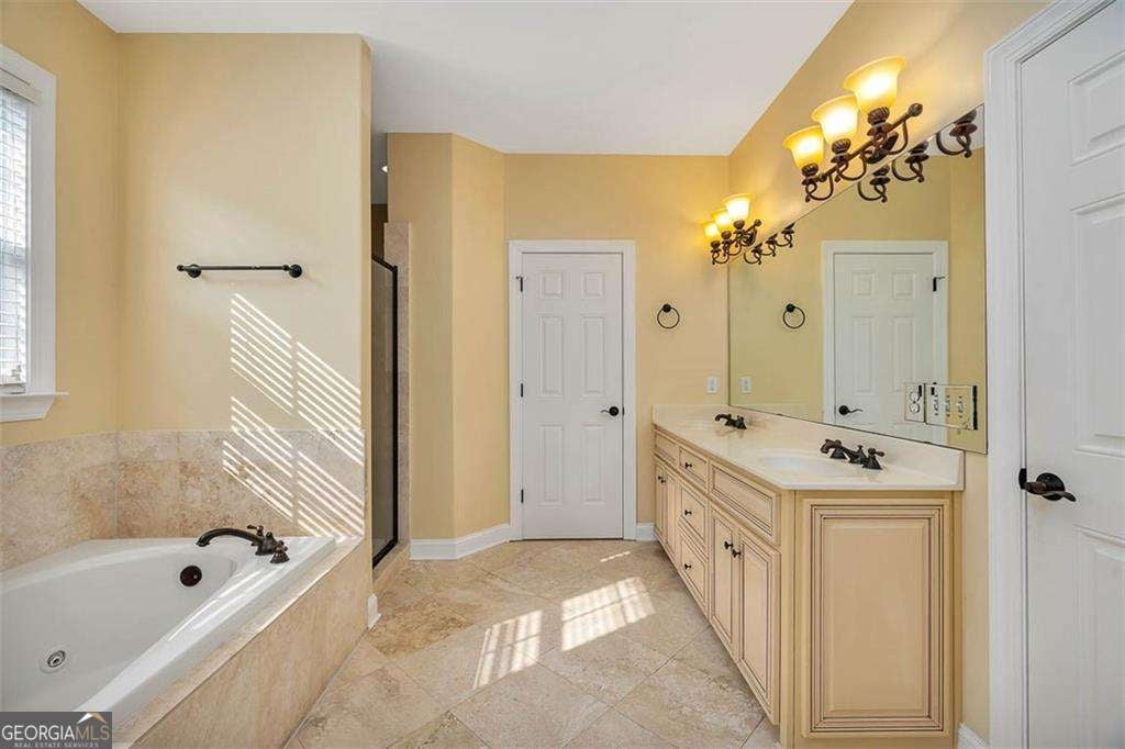 - Interior FeaturesBookcases, Double Vanity, Separate Shower, Soaking Tub, Two Story Foyer, Walk-In Closet(s), Split Foyer, Split Bedroom Plan