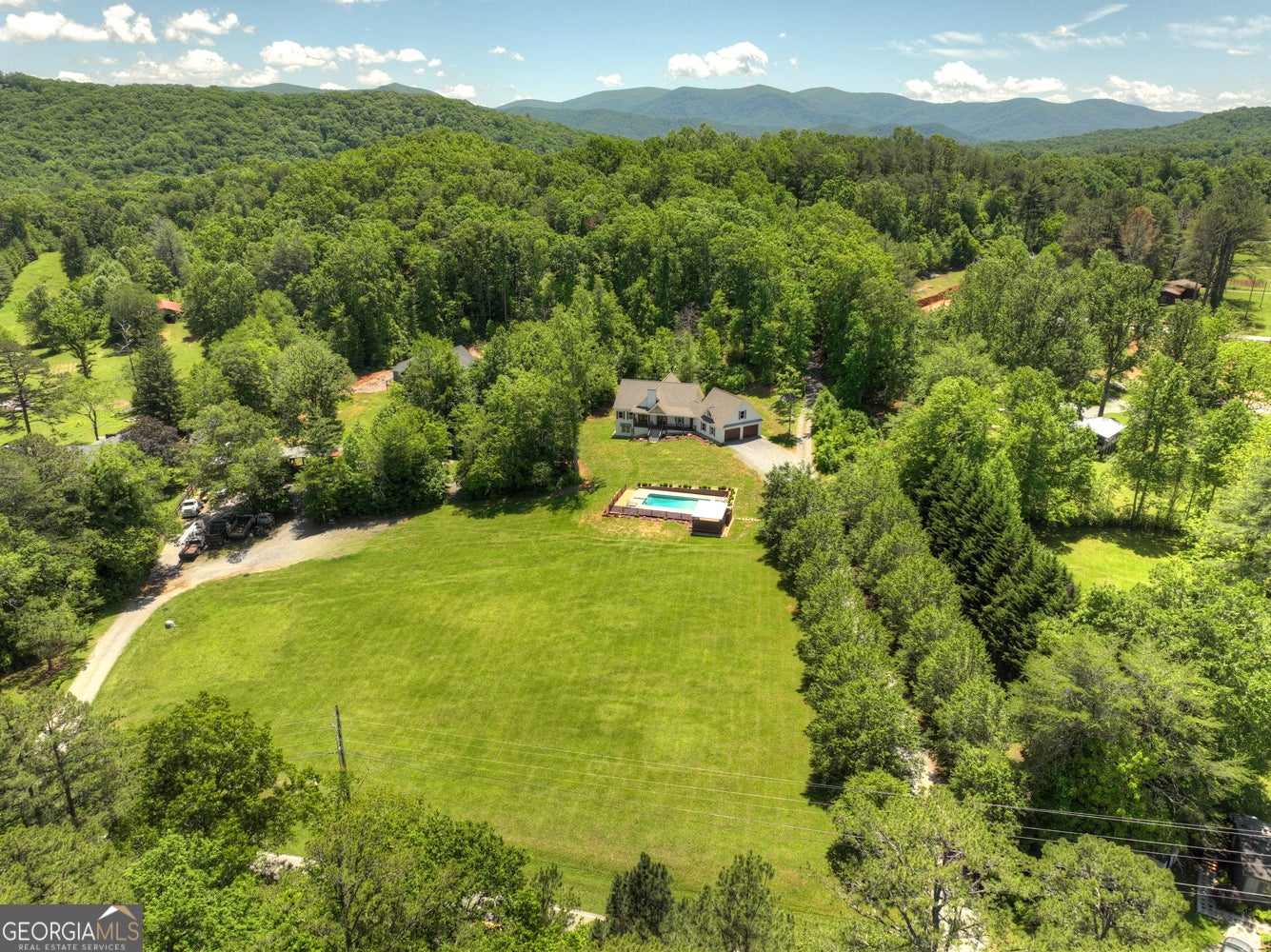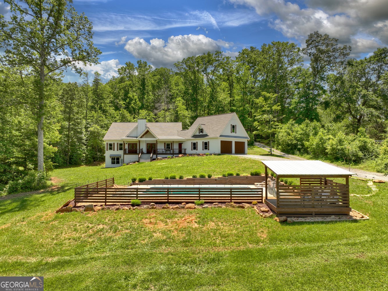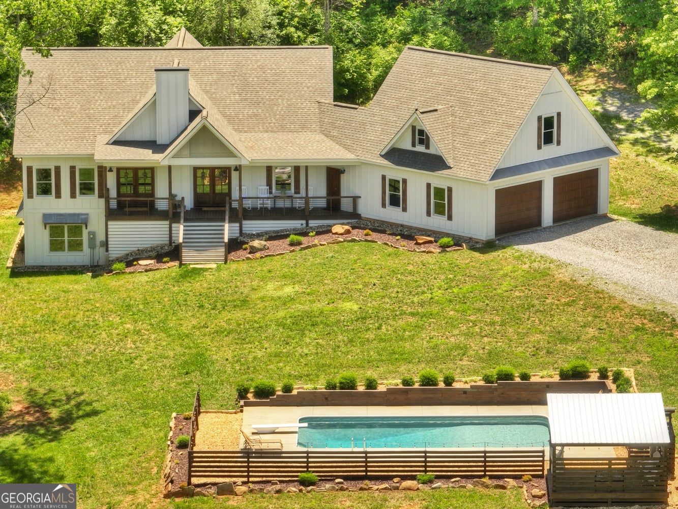 Welcome to your dream retreat tucked into the scenic Blue Ridge countryside. This three-bedroom, four-and-a-half-bath modern farmhouse blends luxury with rustic charm, offering a spacious layout suited for everyday comfort and upscale entertaining alike. Inside, warm wood flooring complements bright, airy walls, while sky-high ceilings and expansive windows flood the great room with natural light. A massive fireplace creates the ultimate gathering spot, and the chef's kitchen features custom cabinetry, a supersized island, and premium appliances that opens to oversize dining area.??Upstairs, a large loft adds flexibility to the living space-great for a second living area, office, or game room. Each bathroom boasts a spa-inspired design, complete with tiled shower in master and granite counters. The expansive primary bedroom is a true retreat, and the attached en-suite feels like a luxury day spa.??Step outside to find a private, level yard accented by lush landscaping and a perfectly positioned fire pit for starlit conversations. The covered rocking chair porch overlooks a picturesque mountain backdrop, along with a stunning pool and entertainment area that's sure to impress guests year-round. A 2+ car garage offers ample storage, and the bonus suite above is perfect for guests or a private studio space.?? Located just minutes from local parks, markets, and schools, this property sits on a scenic, paved country road and offers the peace of nature with convenient access to nearby amenities. With craftsmanship and character at every turn, this home isn't just a place to live-it's a lifestyle.