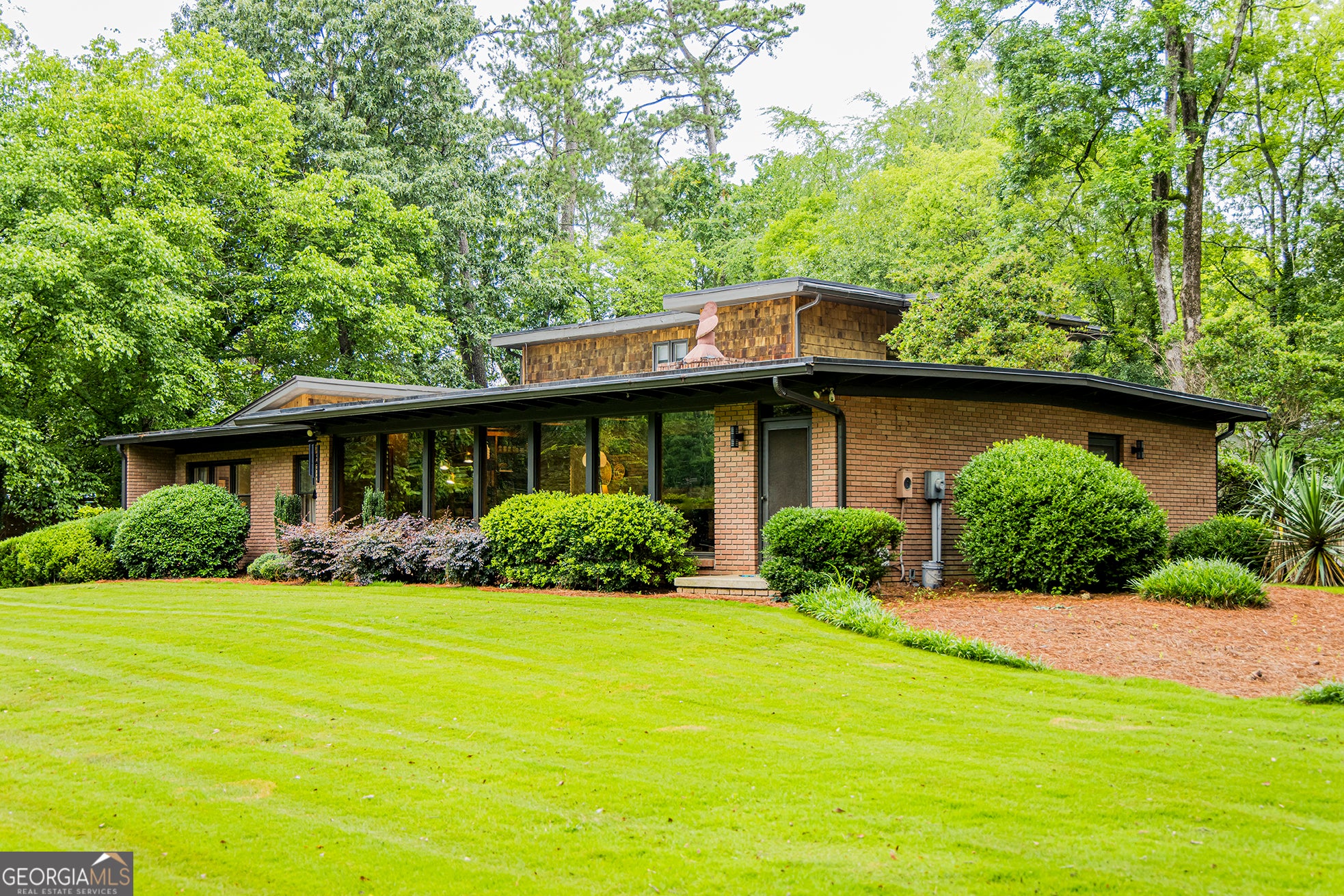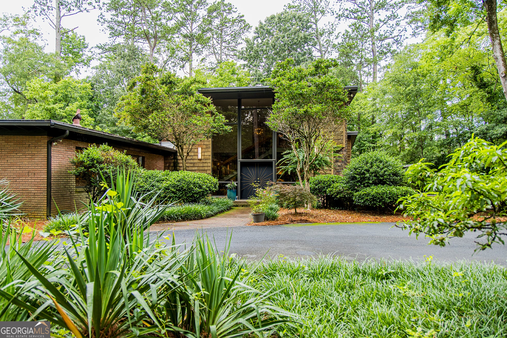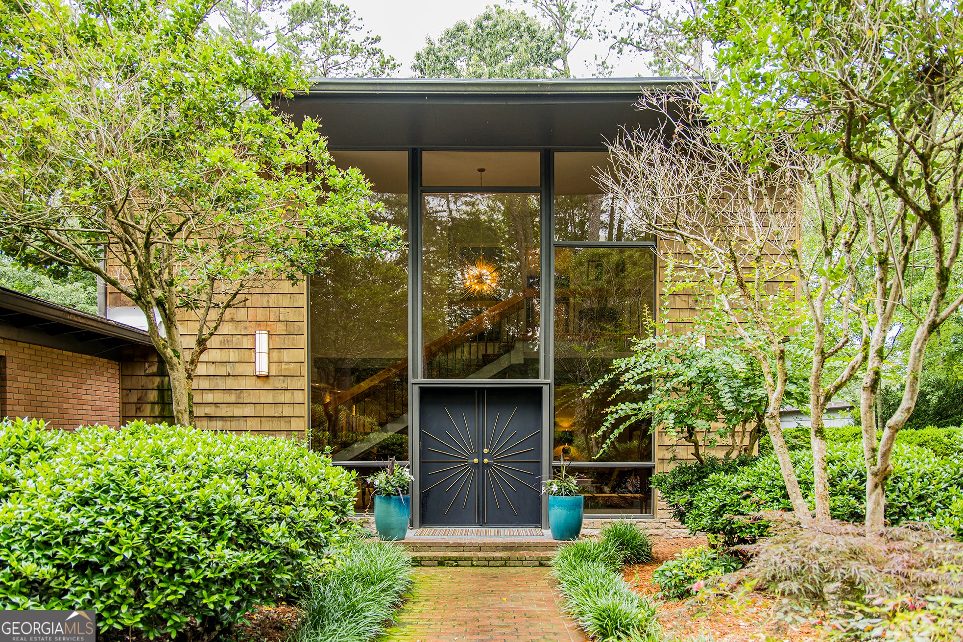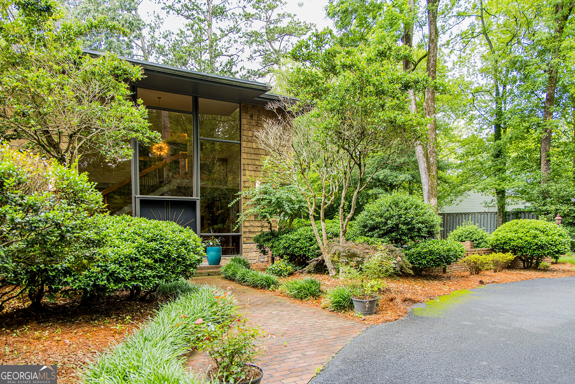 Step into timeless elegance with this stunning 1956 mid-century modern home, thoughtfully renovated to preserve its architectural heritage while offering today's luxury. Tucked away on 1.36 private, park-like acres along scenic Horseleg Creek in the historic College Heights neighborhood, this five-bedroom, four-bathroom residence is a true showstopper. From the moment you arrive, you'll be captivated by the striking two-story windows and custom sunburst-design entrance doors-an homage to the home's original 1950s styling. Inside, a dramatic open staircase with polished wood railings anchors the foyer, showcasing the sophistication of true mid-century architecture. A glamorous sitting room with a wood burning fireplace sets the tone when you enter, while the light-filled kitchen features a sunny breakfast area and flows seamlessly into the wood-adorned dining and living rooms. The living room is expansive and welcoming, with a beamed ceiling, gas log fireplace, and walls of windows that invite the lush natural surroundings inside. The main-level owner's suite is a serene retreat, complete with a spa-like bathroom offering a soaking tub, walk-in shower, and dual vanities. A versatile bonus space with a wooden ceiling-perfect for a home office, sunroom, or yoga studio-extends from the suite and opens onto a private deck. Two additional bedrooms and a full bath are also located on the main floor. Upstairs, two spacious suites each enjoy their own beautifully appointed private bathrooms, offering comfort and privacy for family or guests. Outside, entertain with ease around the fire pit, dine al fresco in the courtyard, or simply enjoy a quiet morning surrounded by nature. A detached two-car garage adds convenience and extra storage. With its impeccable renovation, classic lines, and rare setting, this home is more than a place to live-it's a legacy.