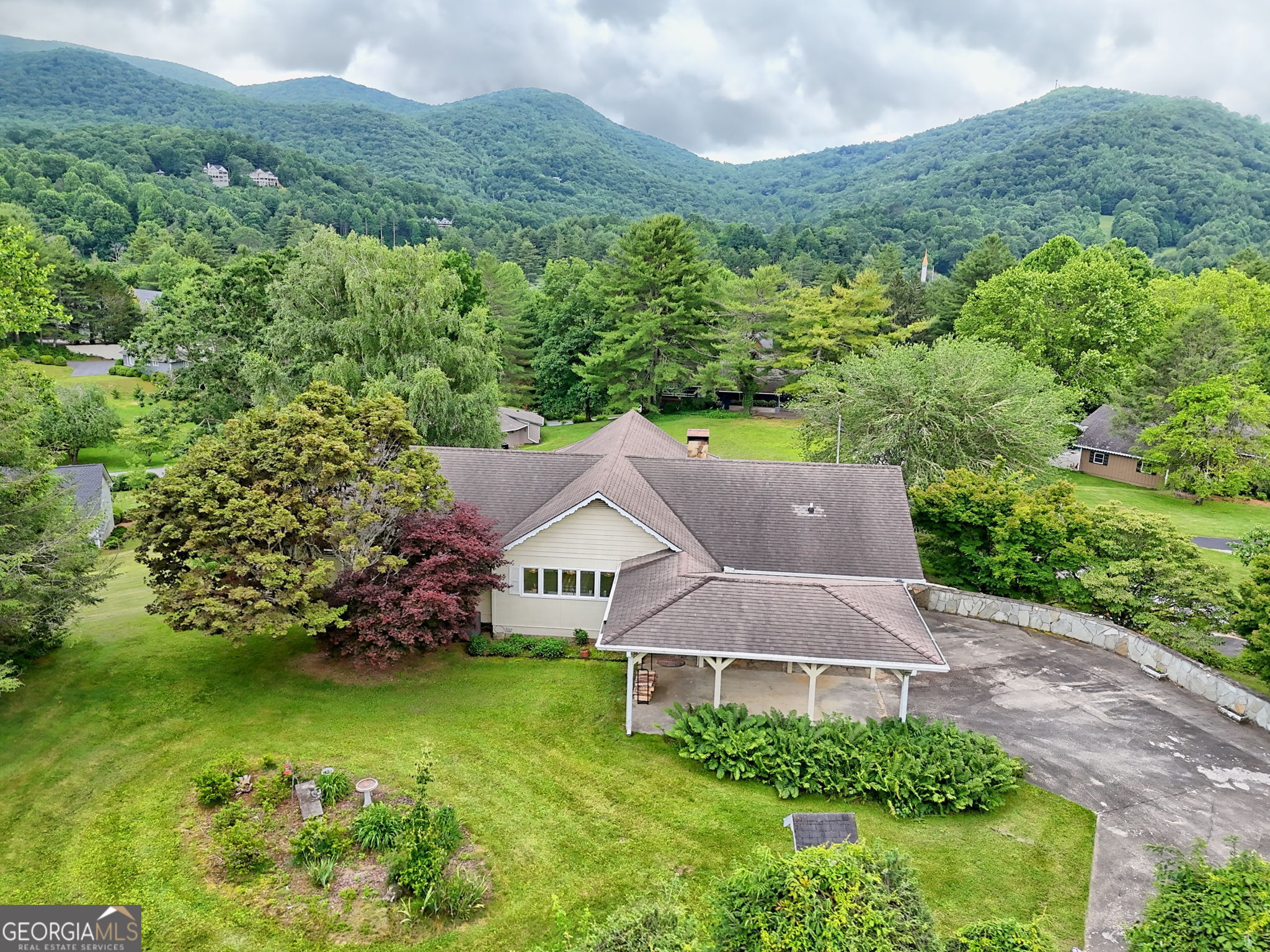 This beautiful, expansive, 4 bedroom, 5.5 bath home with a wonderful mountain view overlooks a big grassy yard in Sky Valley, near the 8th Fairway. With a large, covered porch, you will be able to enjoy the spectacular fireworks extravaganza every Fourth of July from the comfort of home. Never will you have to share the bathroom with your spouse again, with 2 full bathrooms located in the Main bedroom. Each of the 4 bedrooms has a private bathroom, large closets, and French doors leading to the patio. There are also 2 spa bathtubs. The main floor has 2 bedrooms, 3 baths, an open concept comfortable living room with a brick accent wall around the fireplace and vaulted ceilings. The living room is connected to a large eat-in kitchen where everyone can gather around the big family table together. It has all the modern appliances, solid surface countertops, and a row of windows to see the serene, landscaped back yard. The laundry room is located on the main floor as well and includes built-in storage cabinets. On the lower level, you will find the other 2 bedrooms, 2.5 bathrooms, another big comfortable living room with a woodburning fireplace, a wet bar, storage closets, and a small workshop. There is a separate paved driveway leading to the lower level for easy access and tons of parking. The main driveway has a beautiful rock wall, a lovely level yard with flowers, bushes, trees, plus an attached carport. There is plenty of space to grow a garden and play in the yard. This is a very special home that has held lots of family fun over the years and now it is time to pass it along to a new family to enjoy. Will include most furnishings, excluding personal items and family heirlooms. Sky Valley is at an elevation of over 3500 ft, so the temperatures generally stay cooler all summer. With paid membership to the Sky Valley Golf Club, you can have several amenities, including golf, croquet, pickleball, Clubhouse, and dining privileges. You are not required to join the Golf Club or join an HOA to live in Sky Valley; however, you do have to pay City Taxes. You can enjoy the view, the picnic areas, and the waterfalls for free. Only 25 minutes from Highlands, NC and Clayton, GA. Several wineries and restaurants within minutes. Scaly Mtn has Ziplining and Snow Tubing nearby.