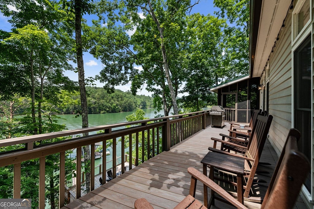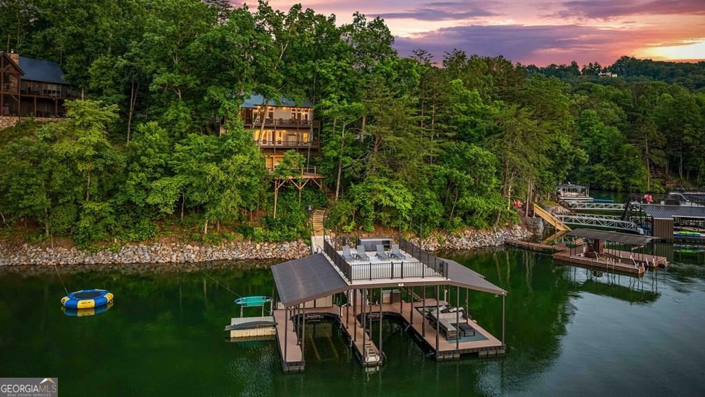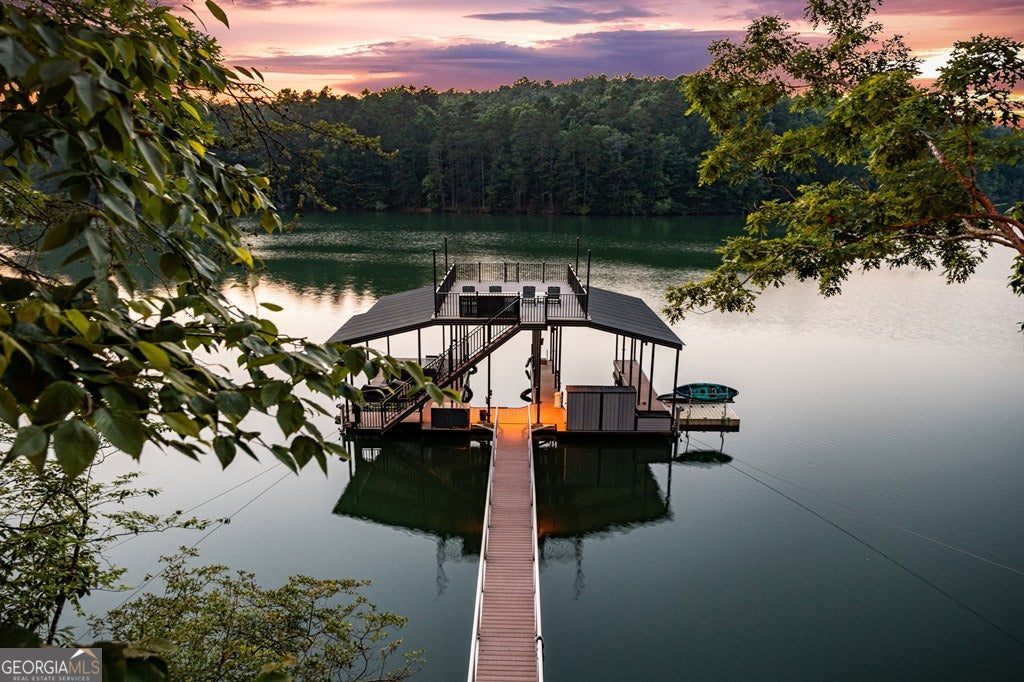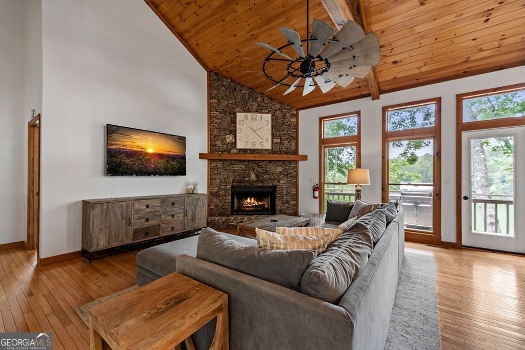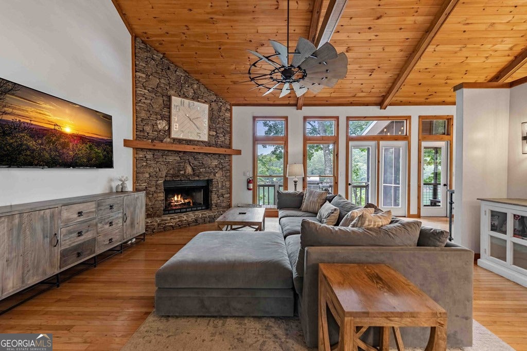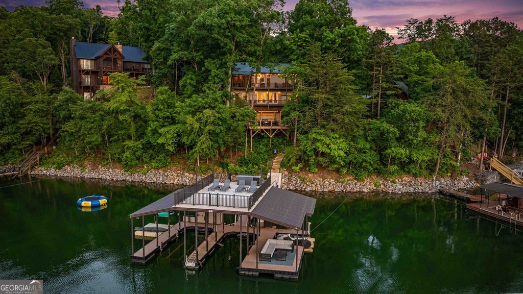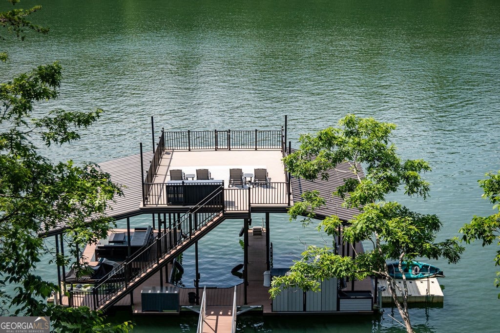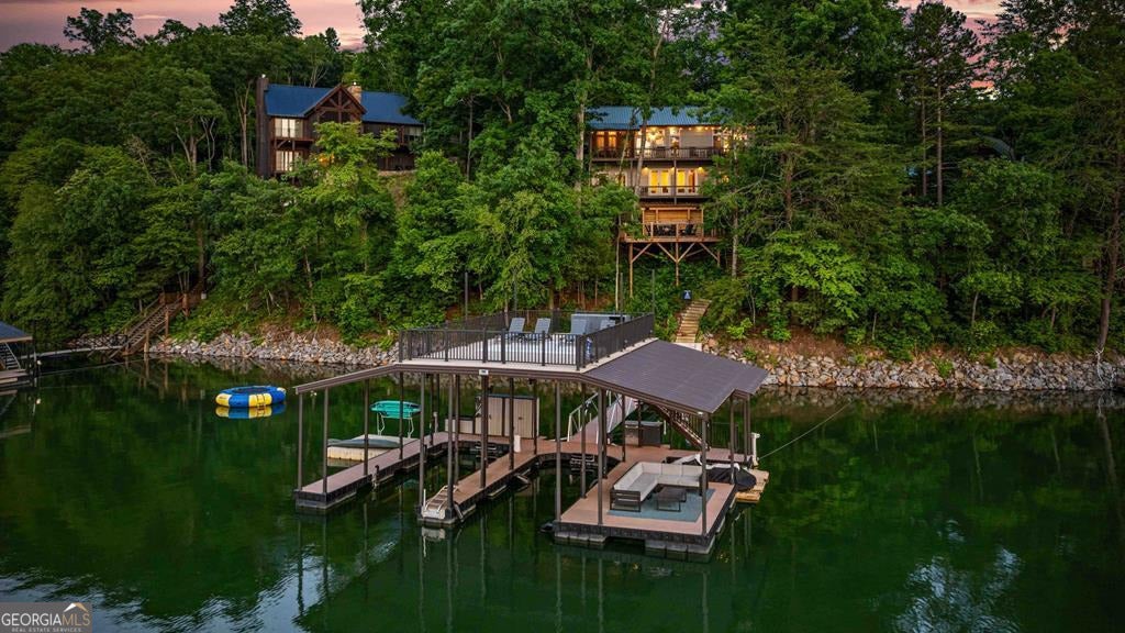 Lake Blue Ridge retreat featuring year-round deep water and breathtaking long-range lake and mountain views. This 4-bedroom, 3-bath getaway offers an open-concept kitchen and dining area with butcher block countertops, stainless steel appliances, and pantry. The great room showcases a gas log fireplace and a wall of windows framing the lake. The main-level primary suite features floor-to-ceiling windows and vaulted wood ceilings, creating a warm and inviting escape. A guest bedroom with a custom kids' loft offering additional sleeping space, along with a full bath, completes the main level. The terrace level includes a game room, bunk room, additional bedroom, full bath, and laundry-ideal for hosting family and friends. Outdoor living shines with a screened porch and an impressive waterside deck featuring a fire pit, bar, ice maker, and beverage cooler-perfect for entertaining or relaxing by the water. The crown jewel of this property is the Wahoo double-decker, two-slip dock with a boat lift, PWC ports, kayak rack, sun deck, and generous seating-ready to enjoy all year long. Easy, mostly paved access and just minutes from historic downtown Blue Ridge. Whether you're seeking a private lakefront escape or a turnkey short-term rental investment, this is a rare opportunity on one of Georgia's most coveted lakes.