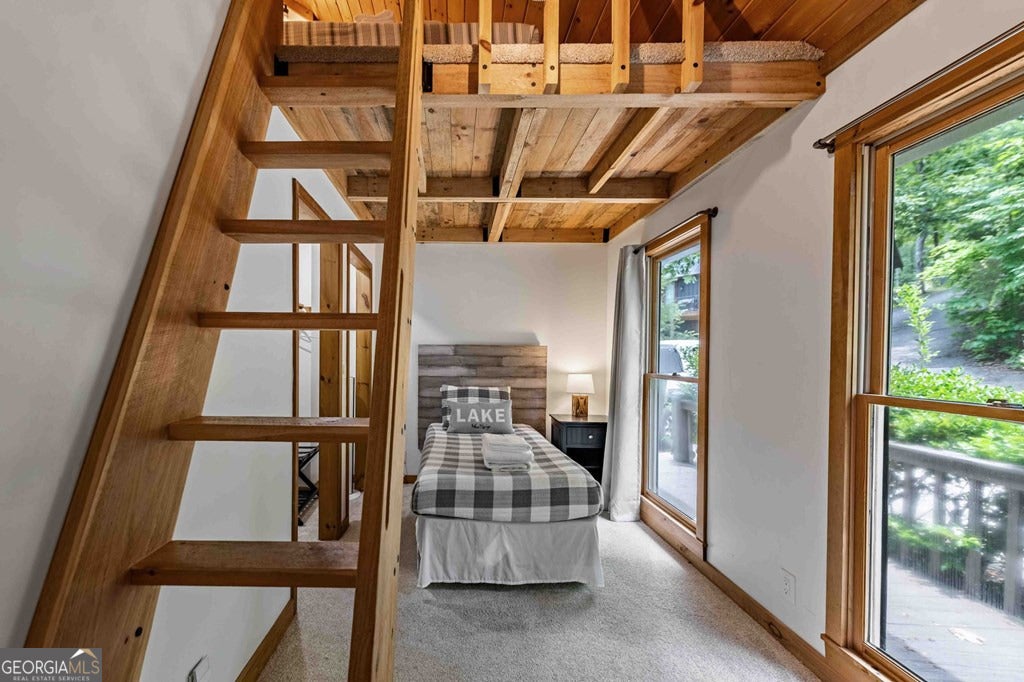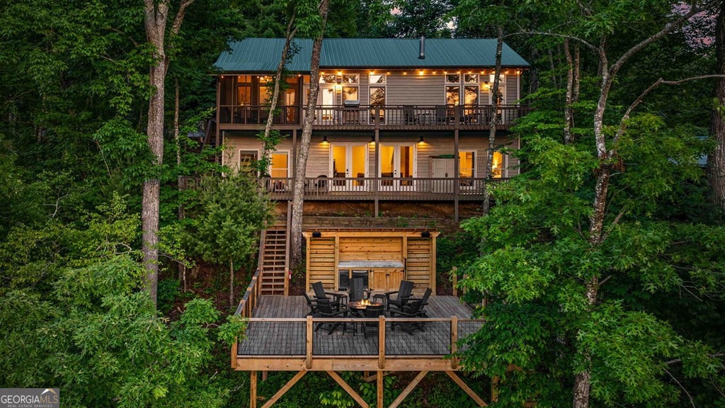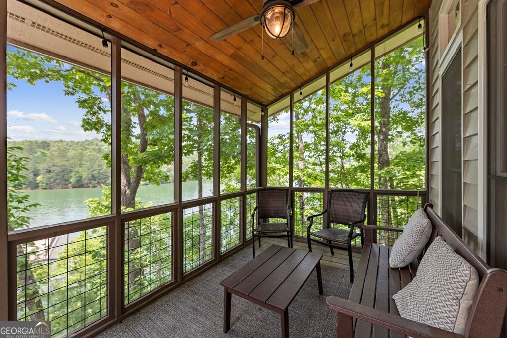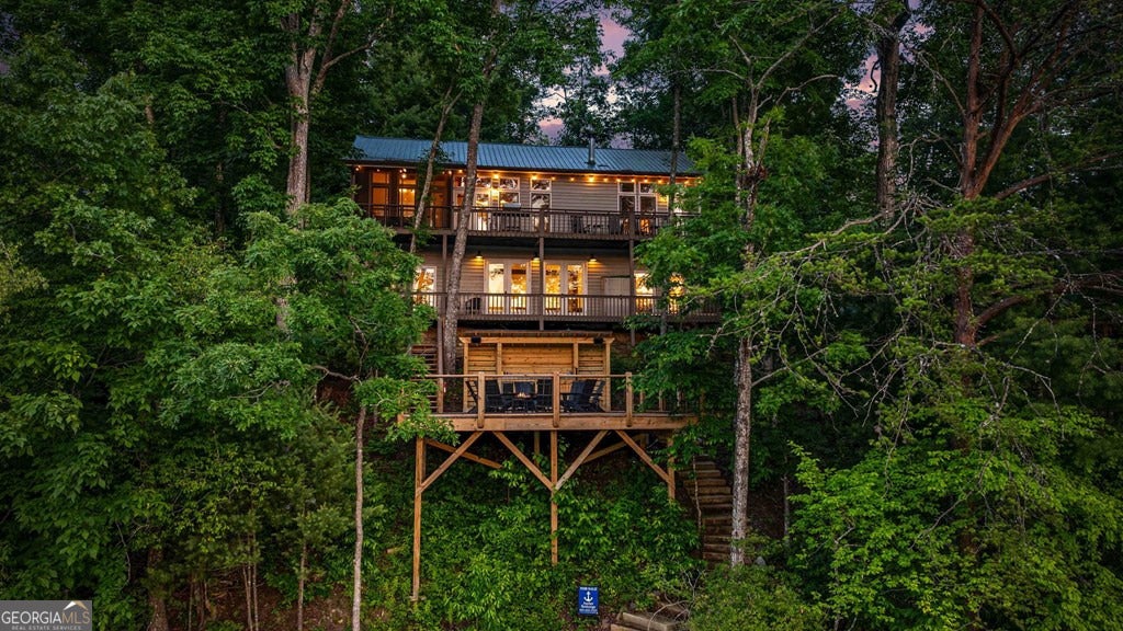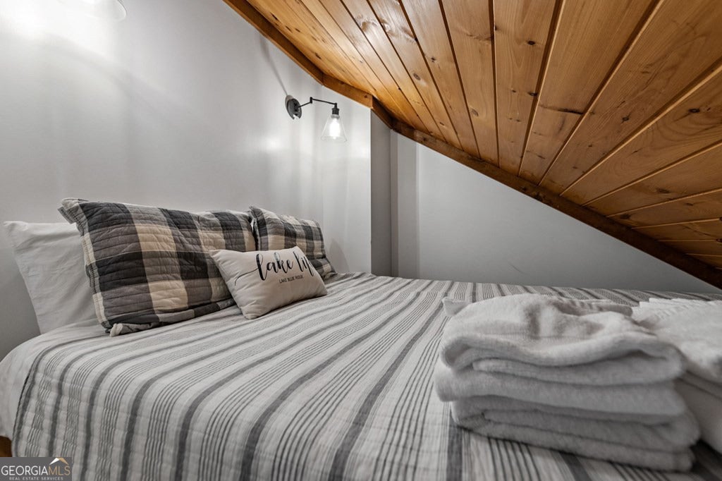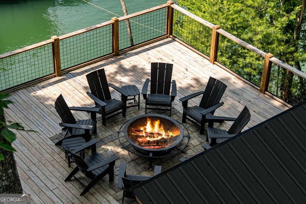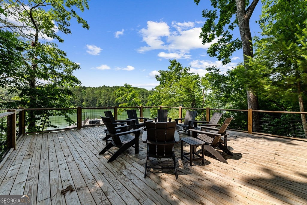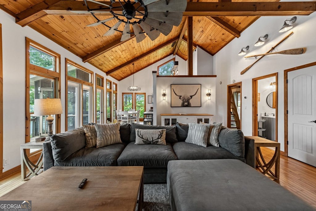Lake Blue Ridge retreat featuring year-round deep water and breathtaking long-range lake and mountain views. This 4-bedroom, 3-bath getaway offers an open-concept kitchen and dining area with butcher block countertops, stainless steel appliances, and pantry. The great room showcases a gas log fireplace and a wall of windows framing the lake. The main-level primary suite features floor-to-ceiling windows and vaulted wood ceilings, creating a warm and inviting escape. A guest bedroom with a custom kids' loft offering additional sleeping space, along with a full bath, completes the main level. The terrace level includes a game room, bunk room, additional bedroom, full bath, and laundry-ideal for hosting family and friends. Outdoor living shines with a screened porch and an impressive waterside deck featuring a fire pit, bar, ice maker, and beverage cooler-perfect for entertaining or relaxing by the water. The crown jewel of this property is the Wahoo double-decker, two-slip dock with a boat lift, PWC ports, kayak rack, sun deck, and generous seating-ready to enjoy all year long. Easy, mostly paved access and just minutes from historic downtown Blue Ridge. Whether you're seeking a private lakefront escape or a turnkey short-term rental investment, this is a rare opportunity on one of Georgia's most coveted lakes.