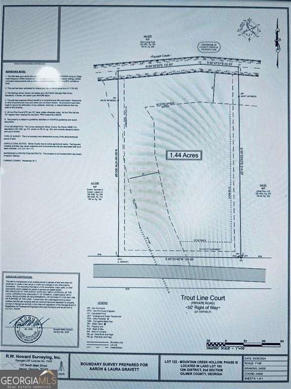 Build your home on this 1.44 Acre wooded lot with natural privacy while enjoying the soothing sounds of Fausett Creek just below passing along the back lower end of the property. Located in the gated community of Mountain Creek Hollow with amenities including a creek-side pavilion with fireplace and picnic tables, underground utilities, a covered bridge, stocked trout pond, community garden, water wheel and walking trails. Fausett Creek is a wide creek featuring many small, picturesque waterfalls and several trails to walk. This community has stunning landscaping with paved roads and underground utilities. Full Survey has been completed and all 4 point of the lot have been marked with red flags. Embrace the tranquility and seclusion of this mountain getaway community and within 10 minutes to shops and restaurants in Ellijay. Community is ideally centered between both Ellijay and Jasper. Look for marker for Lot #122. *Please note: No Short-Term Rentals Allowed. Min build requirement 2000sqft, main level min 1400sqft on perm foundation. After build commencement then have 12 months to complete. Underground public water and electric, need only septic.