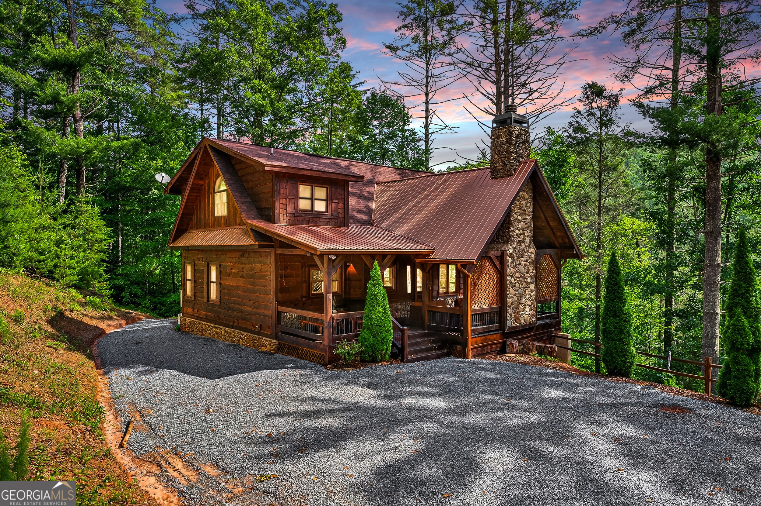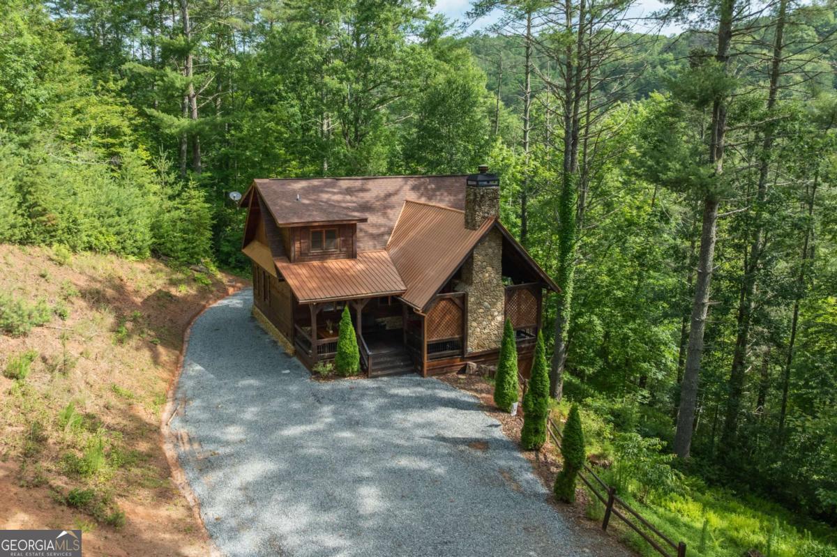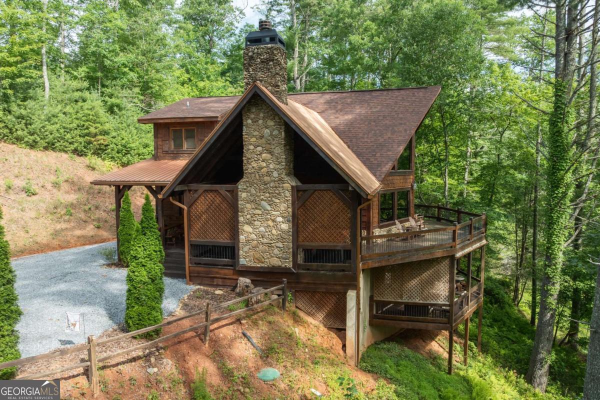 Location, location, location! Privately nestled in the sought-after Aska Adventure Area, this elegantly rustic 3BR/3BA retreat borders the Chattahoochee National Forest while remaining just minutes from hiking, mountain biking, the Toccoa River, Lake Blue Ridge, and downtown Blue Ridge. Beautiful craftsmanship shines throughout with large beams, stone accents, soaring cathedral ceilings, and dramatic walls of windows. The main level offers an open concept floor plan with a great room full of natural light, wide-open views, and a stone gas log fireplace. The spacious kitchen features custom cabinetry, stainless appliances, granite countertops, and plenty of dining space. A guest bedroom and full bath complete the main level. The upper level features a loft overlooking the great room (a perfect study, game spot, or home office nook) and a primary suite with a custom stone shower, separate soaking tub, and double vanity. The lower level includes a game room with a second kitchen, a second stone gas log fireplace, a guest bedroom, a full bath, and laundry. Outdoor living is a dream with a large covered party deck featuring a wood-burning stone fireplace, open wraparound deck, lower-level covered porch with hot tub, and plenty of space to enjoy the peaceful mountain setting. A whole-house generator offers added convenience plus peace of mind. Best of all, you're close enough to hear the rushing waters of the Toccoa River. This gorgeous mountain dream home is being sold turn-key and fully furnished. Don't miss this rare opportunity to own a fully furnished mountain retreat in one of Blue Ridge's most desirable locations. Schedule your private showing today and start living the mountain lifestyle you've been dreaming of!