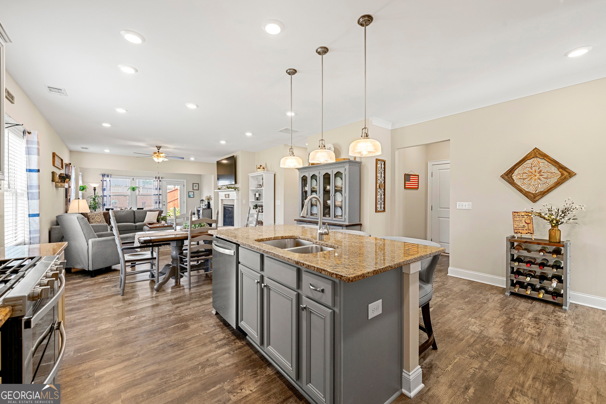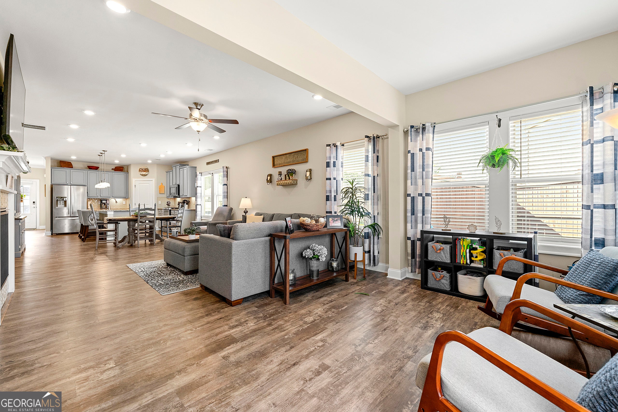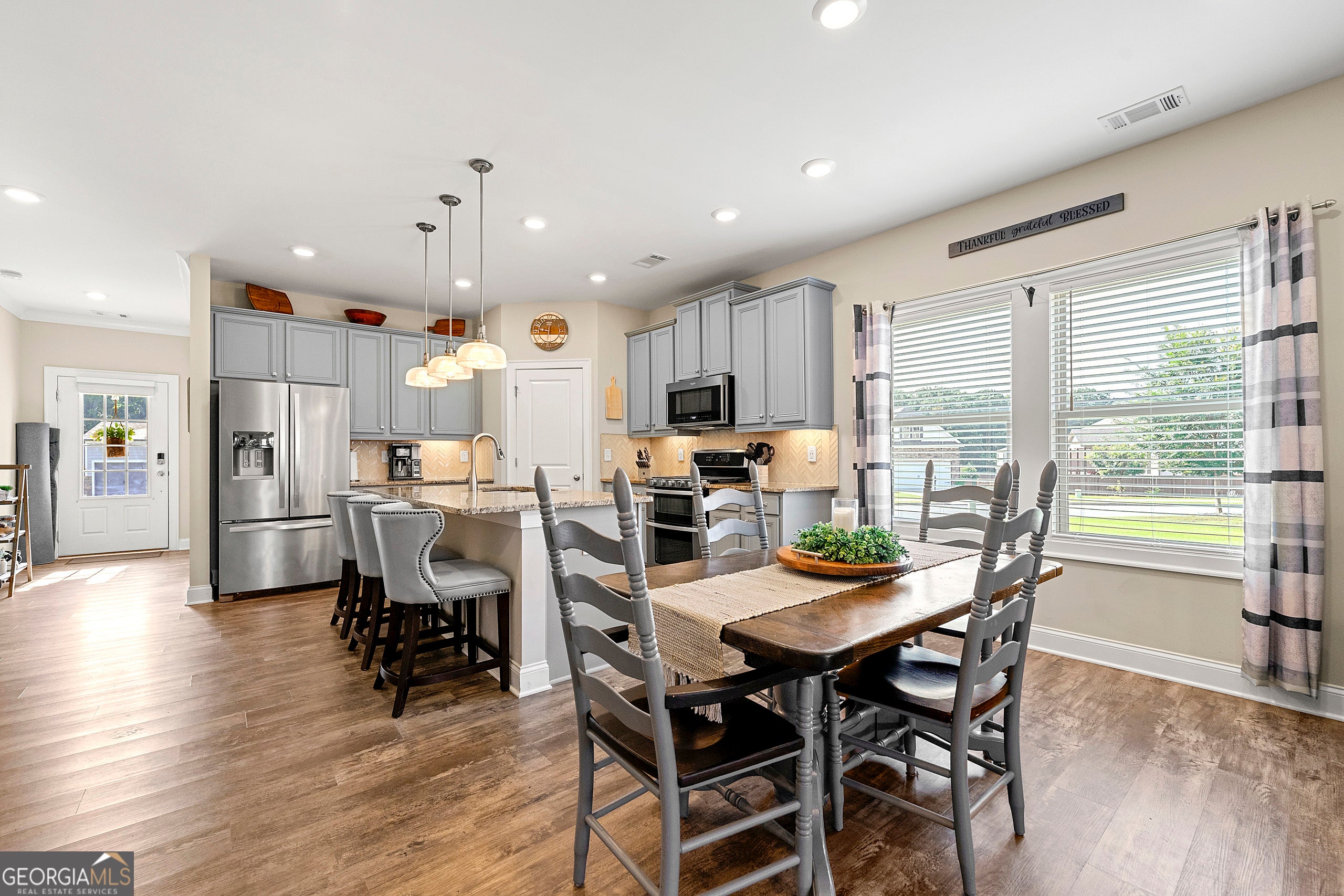 Step into an inviting open-concept ranch that blends style and comfort in a sought-after swim/tennis community. With soaring 9ft ceilings, warm neutral tones and abundant natural light streaming through LowE windows, this home exudes freshness and charm. The chef-inspired kitchen is a standout-featuring granite counters, softclose cabinetry, stainless steel appliances, a massive center island and a spacious walkin pantry that makes entertaining a breeze. Flow effortlessly into the fireside family room, and extend your gathering space into the versatile sunroom-perfect for an office, play area or cozy retreat. The primary suite delivers a spalike experience with dual granitetop vanities, a tiled shower and a generous walkin closet. Two additional bedrooms and a full bath round out the single-floor layout. Efficiency meets comfort here, with a Rinnai tankless water heater, insulated attic, highefficiency HVAC and LED lighting throughout. Outdoors is your private oasis: lush landscaping, a charming gazebo, and a newly installed extended patio-seller-installed to maximize entertaining and outdoor lifestyle. Top it all off with an attached twocar garage, smart Ring doorbell security and community perks like clubhouse, pool, and tennis courts. This home offers turnkey living-better than new and ready for its next chapter!