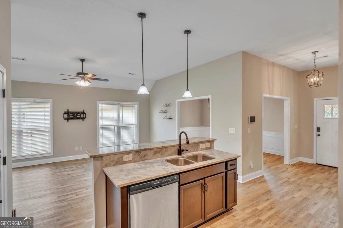 OPEN HOUSE ON SATURDAY 7/19 from 2:00-4:00PM!! Welcome to this beautifully maintained 3-bedroom, 2-bath in Hawks Ridge subdivision-just minutes from shopping, dining, and everyday conveniences. Inside, you'll find tall ceilings and an abundance of natural light throughout the open living spaces. Stylish LVP flooring flows through the living and dining areas, while the formal dining room is accented with elegant judges panels. The gorgeous kitchen features rich expresso cabinetry, light stone countertops, and stainless steel appliances. The spacious primary bedroom is sure to impress with its gorgeous five-piece ensuite and a walk-in closet. Out back, enjoy a private fenced yard and a covered patio-perfect for grilling or dining alfresco. This home combines comfort, style, and a prime location. Don't miss your opportunity to make it yours!