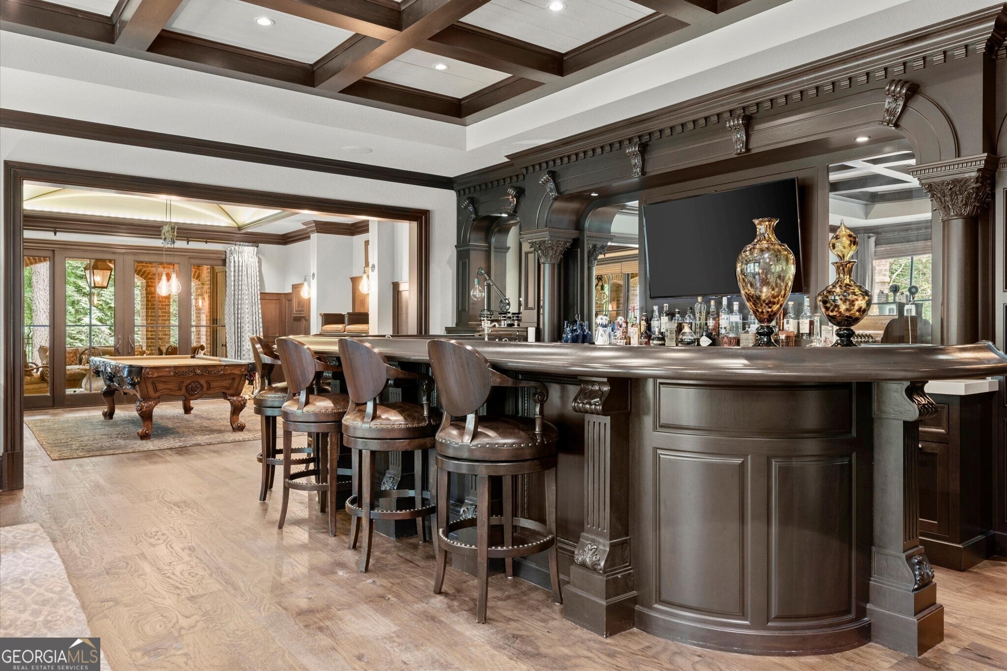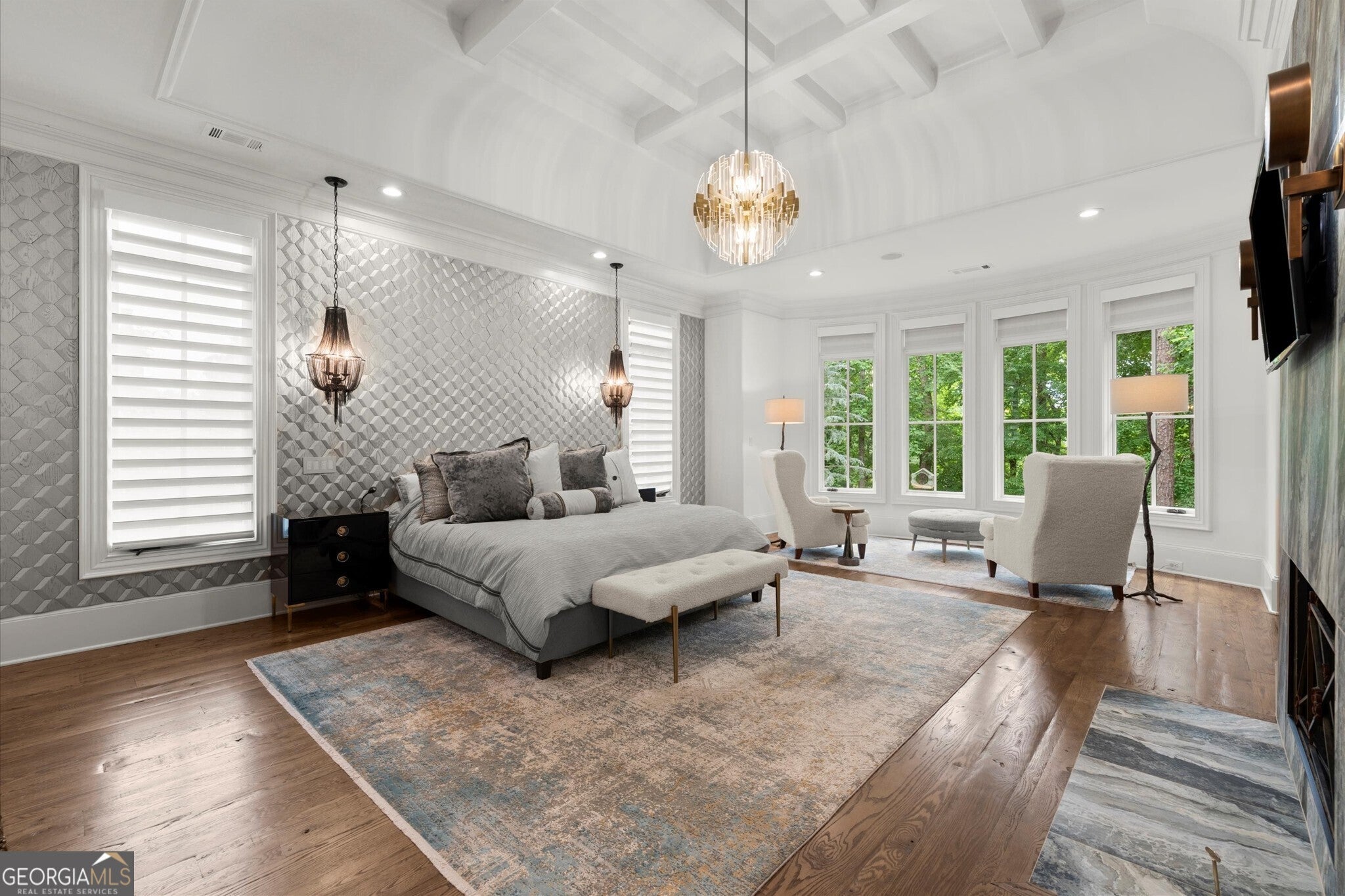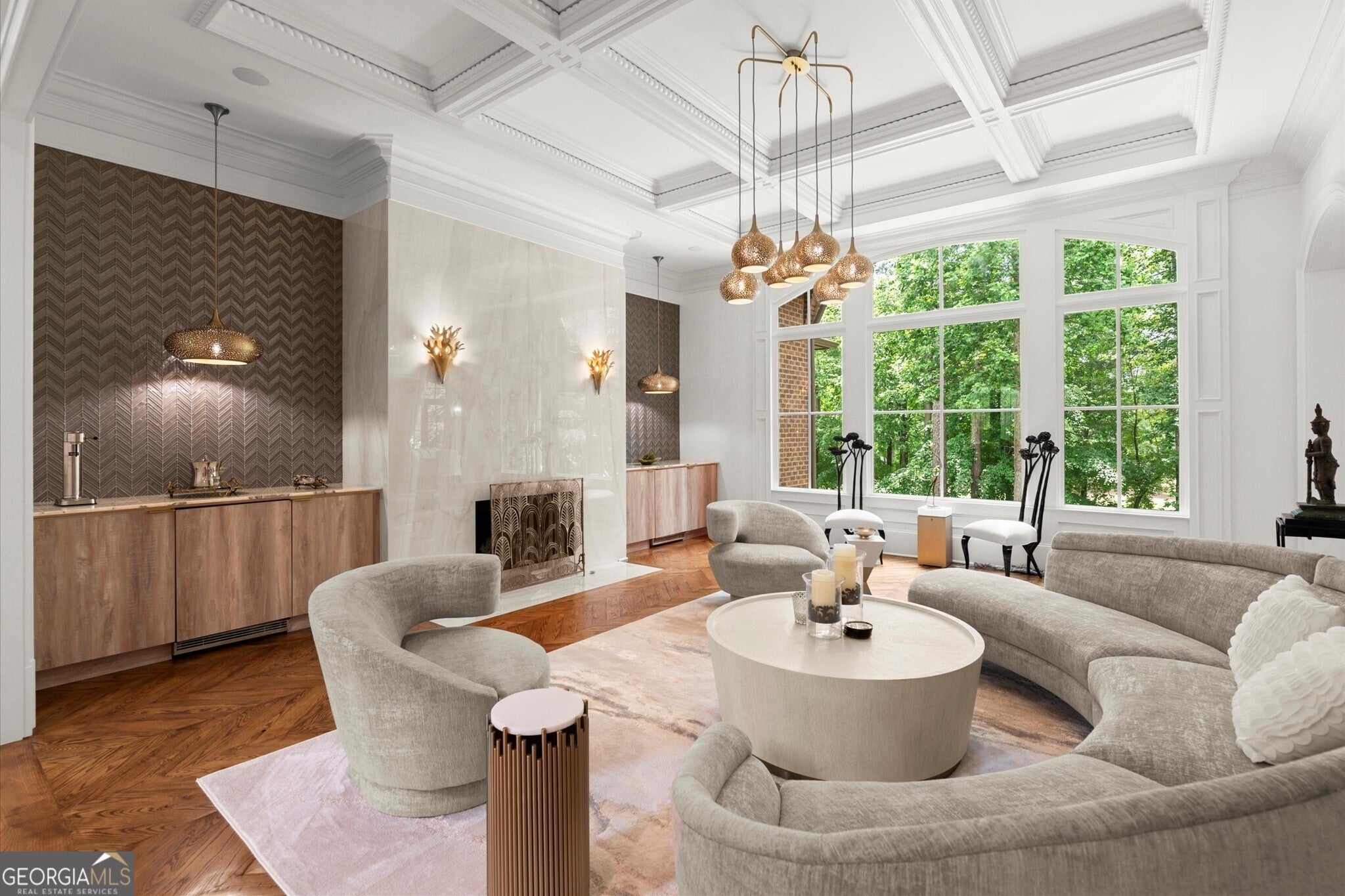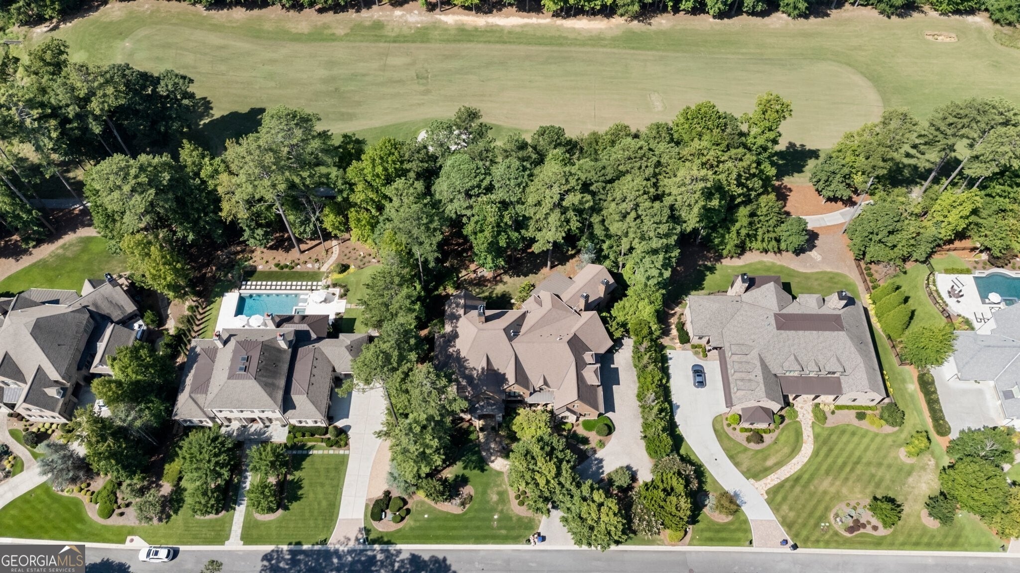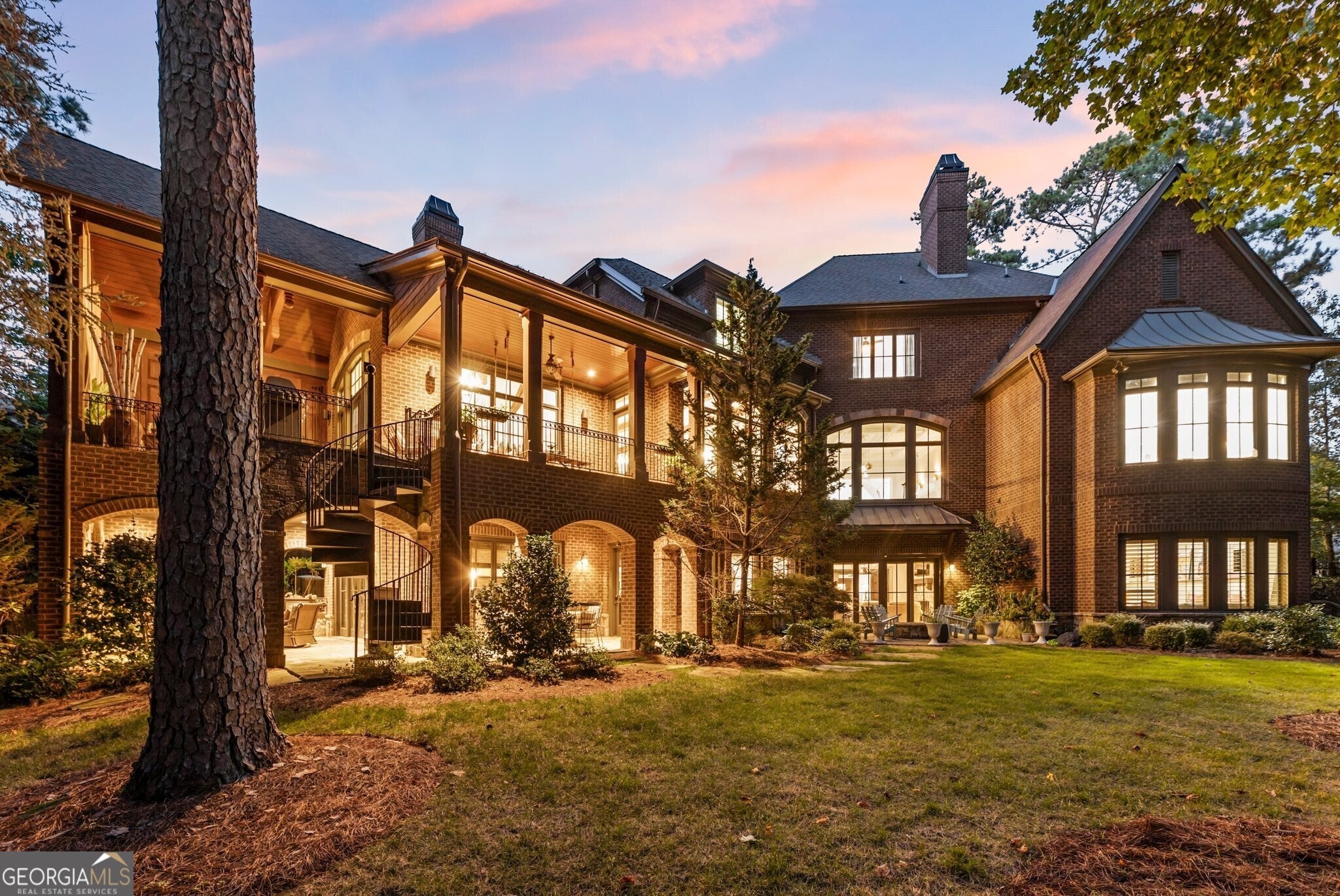 Welcome to The River Club, one of Metro Atlanta's most coveted gated communities, where timeless elegance meets unparalleled luxury. This custom-crafted masterpiece home was designed by the renowned Culver Builders and is perfectly positioned overlooking the lush fairways of the fourth hole on the Greg Norman-designed championship golf course offering breathtaking views and an unrivaled lifestyle. From the moment you step through the gorgeous double front doors, this residence captivates you with its sophisticated design and meticulous craftsmanship. The grand two-story foyer sets the tone with soaring barrel-vaulted ceilings, designer crystal chandeliers, and an exquisite curved staircase. To the left, a refined study with fireplace beckons with rich cherry wood-paneled walls, and architectural beams, creating an ideal private office or serene retreat. Entertain in style in the banquet-sized dining room adorned with a coffered ceiling and intricate millwork or gather in the expansive living room with a beautiful fireplace where chevron-patterned hardwood floors, a custom backlit entertaining bar, and a wall of windows showcases panoramic views of the meticulously landscaped yard which transforms into a magical oasis under evening lights. The gourmet chef's kitchen is a culinary haven featuring top-of-the-line Wolf and Sub-Zero appliances, a sprawling quartzite island, and exposed Chicago brick accents that add warmth and character. Seamlessly connected to a butler's pantry with dual wine coolers, Viking ice makers, and abundant storage, this space is designed for effortless hosting. The kitchen flows into a charming breakfast nook and cozy keeping room, anchored by a floor-to-ceiling stone fireplace and framed by French doors that open to a covered and vaulted fireside porch. This outdoor living space is complete with surround sound and is the perfect place for year-round al fresco dining and intimate gatherings. The main-level owner's retreat is a sanctuary of indulgence, boasting soaring coffered ceilings, a romantic fireplace, and a custom feature wall. Dual walk-in closets with bespoke shelving lead to a spa-inspired bathroom, complete with heated marble floors, dual vanities, a freestanding soaking tub, and an oversized frameless glass shower with multiple rain heads. Ascend to the second level, where four generously proportioned suites await, each with private en-suite bathrooms and expansive closets. One oversized suite features an attached private living area, ideal for teens, in-laws, or an au pair, offering versatility and comfort. The terrace level is an entertainer's paradise designed to impress with a speakeasy-inspired lounge featuring a handcrafted Brunswick bar, a climate-controlled wine cellar, a billiards room, and a dedicated shoeshine nook. The fireside media room opens to a private, fenced backyard, where a custom fire pit, covered patio, and lush landscaping create an intimate setting for outdoor relaxation. This level also includes space for a future home gym, guest suite, still with ample storage. Additional highlights include a private elevator servicing all three levels, a four-car garage and space for a golf cart, two laundry rooms, and smart-home technology controlling lighting, security, and climate. Nestled within The River Club, a certified Audubon Sanctuary is located along the banks of the iconic Chattahoochee River and offers access to world-class amenities including a Greg Norman-designed golf course, a newly renovated racquet club with clay and hard courts, a junior-Olympic lap pool with splash pad and slide, and a cutting-edge fitness center. Savor culinary delights at multiple dining venues, from casual to fine dining, all within the community. With 24/7 gated security and proximity to top-rated schools, upscale shopping, and vibrant cultural attractions, The River Club redefines luxury living.