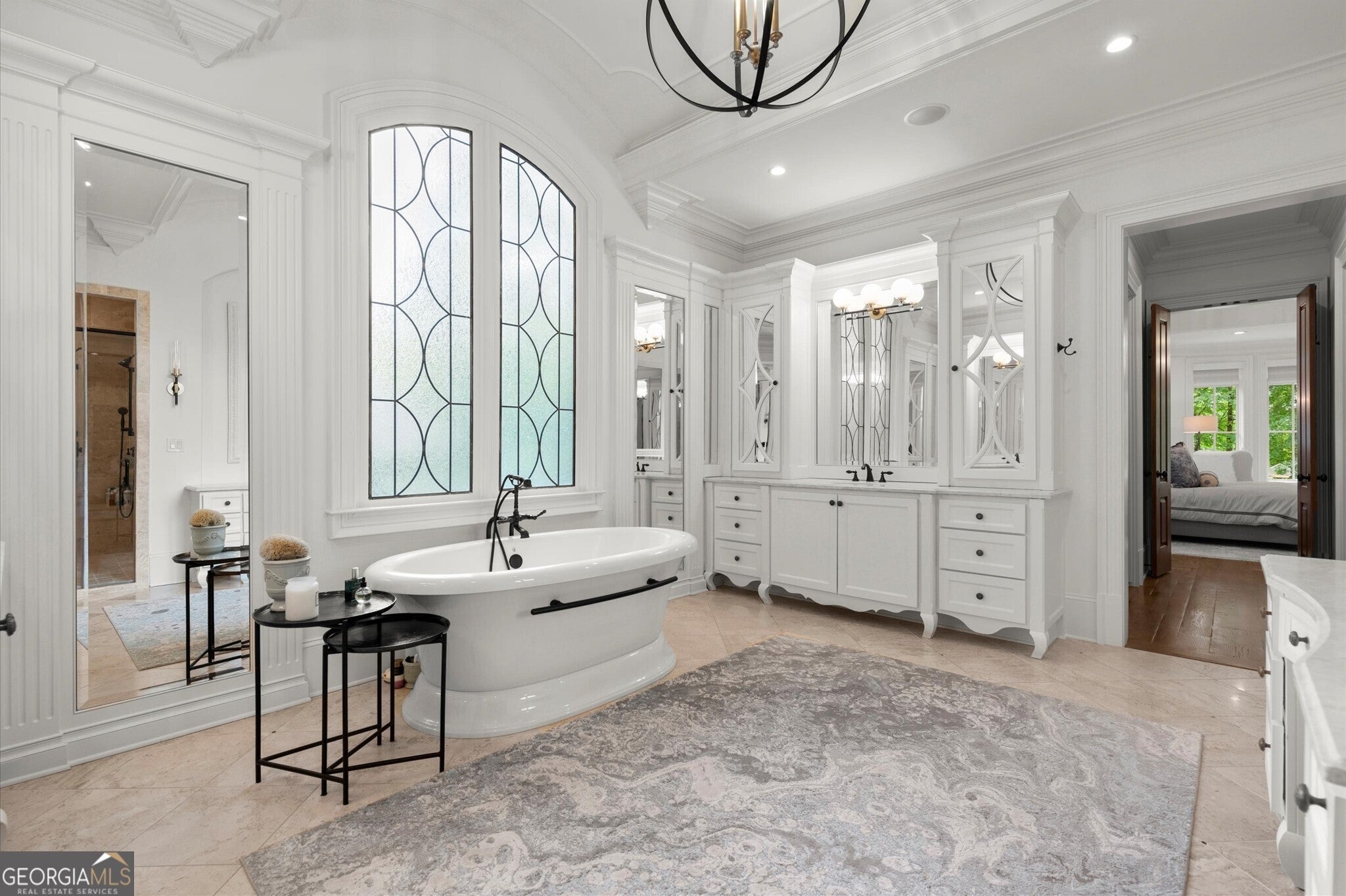 - Interior FeaturesHigh Ceilings, Bookcases, Double Vanity, Beamed Ceilings, Two Story Foyer, Soaking Tub, Master On Main Level, Separate Shower, Wet Bar, Wine Cellar, Walk-In Closet(s)