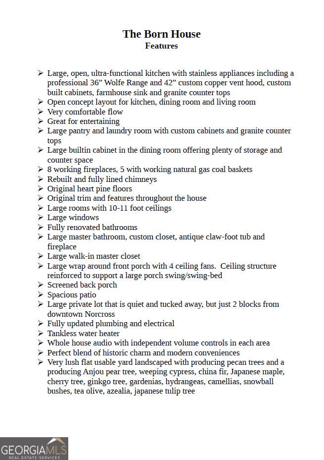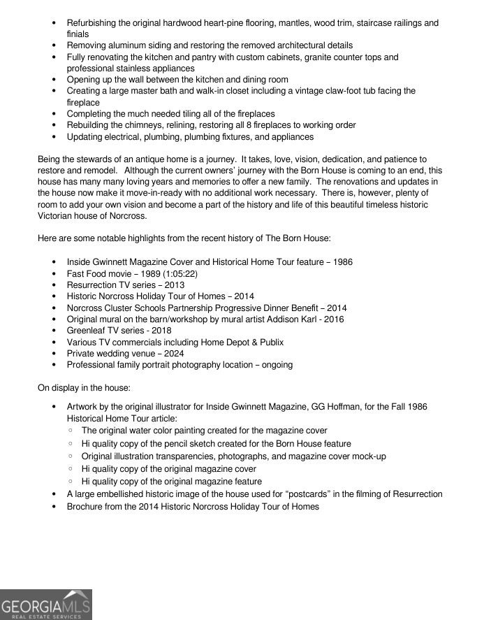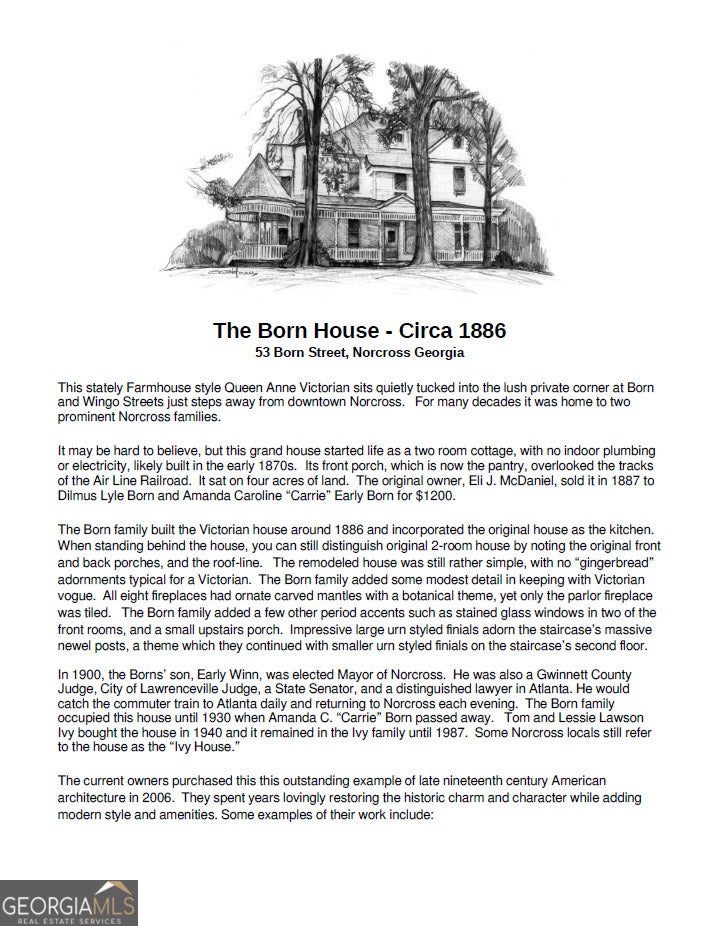 **SEE OUR VIDEO HOME TOUR IN "View 2nd virtual tour" BELOW!!** **The Born House: A Timeless Masterpiece in Historic Norcross** Step into history with this stately Farmhouse-style Queen Anne Victorian tucked away on a large lush private corner in downtown Historic Norcross. This home was originally built in the 1870s as a humble two-room cottage without indoor plumbing or electricity and later (in 1886) transformed into the elegant Victorian Home it is today. The Born House now captivates with a large wrap-around porch, central hallway, and original heart pine floors that echo its storied past. The home proudly showcases eleven-foot ceilings, massive newel posts, and natural wood trim-a beautiful blend of historic charm and modern craftsmanship that has been lovingly restored over years by devoted owners. The property carries a fascinating legacy. It has been featured in various films, magazines, books, art installations and home tours. Each thoughtful restoration preserves the home's heritage while infusing it with contemporary comforts. Whether it's a quiet morning on the inviting porch or an evening spent in a room that resonates with antique allure, this lovely home offers a living story where every detail has been meticulously curated. Embrace the rare opportunity to own a piece of Norcross history-where timeless elegance meets modern living. This home invites discerning buyers who value character, heritage, and the beauty of thoughtful restoration. Bonus Opportunity: The adjacent buildable .402-acre lot at 63 Born St, perfect for expansion, guest quarters, or investment potential, is also available for purchase. See GAMLS listing #10591418. Package Deal Available: Lower pricing on house and lot combined. Buy both properties together to create a sizable combined estate of 0.837 acres. Whether you're a developer, investor, or someone dreaming of a private estate with historic charm and buildable space, this is a rare opportunity to own a piece of Norcross history with endless possibilities. See GAMLS listing #10591499 for the package listing.