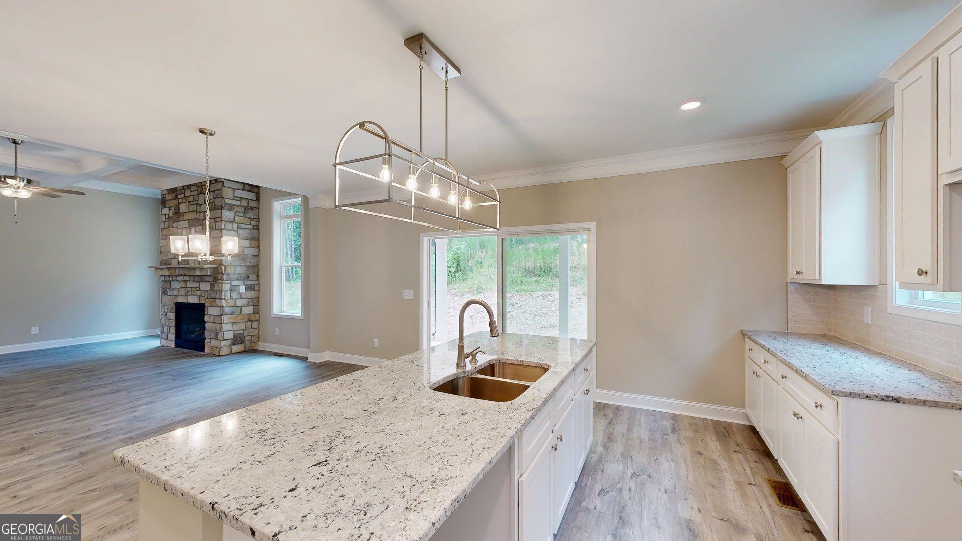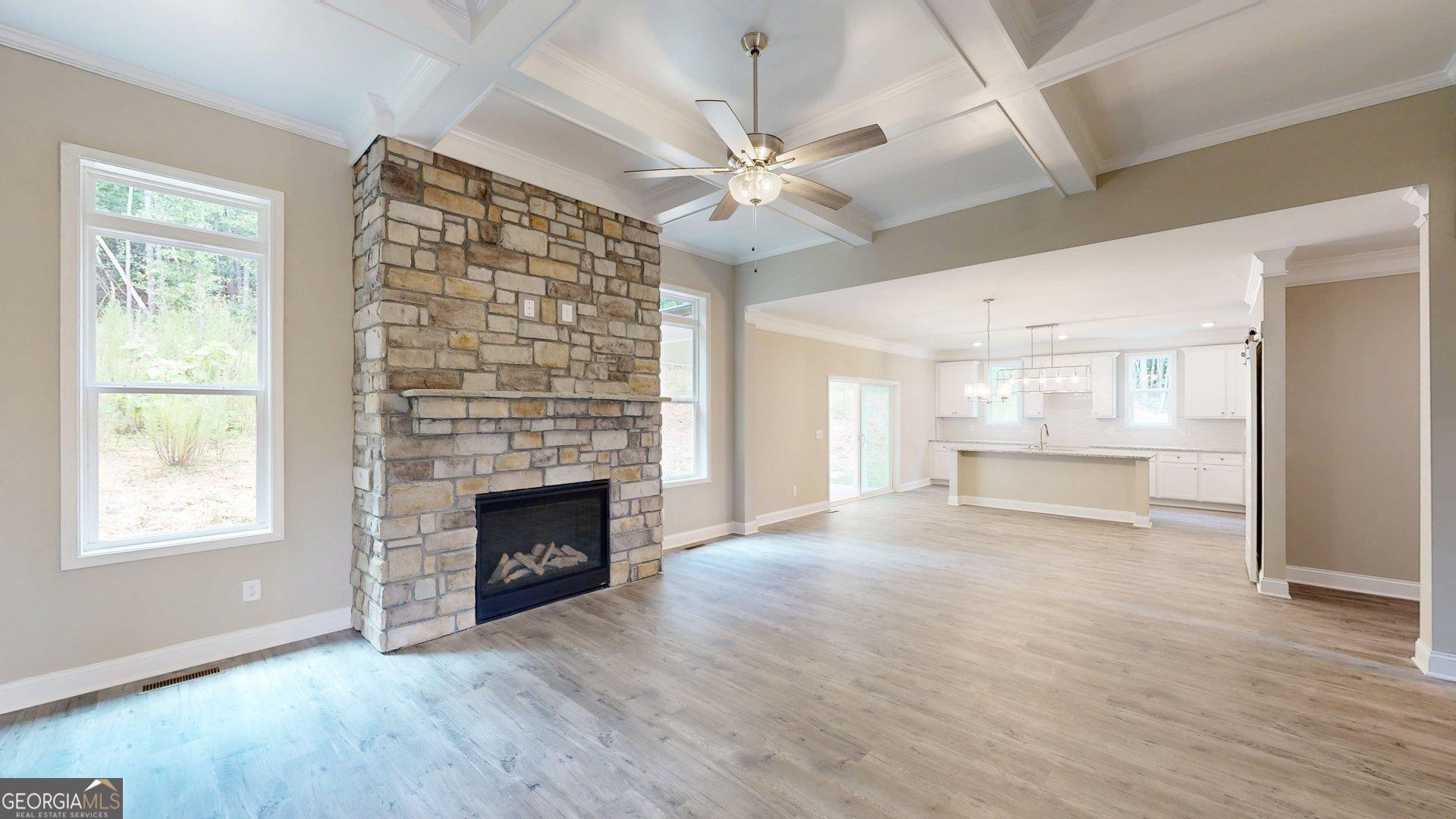 Welcome home to this beautifully crafted, two-story modern farmhouse nestled on a full unfinished basement-already stubbed for an additional bath-offering endless possibilities for future expansion. Located in a sought-after gated community, this home combines timeless charm with luxury finishes. Step onto the inviting covered front porch and into a grand foyer that leads to an elegant family room featuring a striking stone fireplace and eye-catching coffered ceiling. This thoughtfully designed floor plan includes 4 spacious bedrooms, 2.5 luxurious baths, and a finished bonus room that can easily serve as a 5th bedroom, home office, or media room. The gourmet kitchen is a chef's dream-boasting granite countertops, soft-close cabinetry, a walk-in pantry with a charming barn door, breakfast bar, and an oversized sliding glass door that opens to a serene covered patio-perfect for entertaining or relaxing. Retreat to the main-level owner's suite with spa-inspired details, while all additional bedrooms are conveniently located upstairs. Bathrooms are adorned with stylish tile showers, frameless glass doors, and granite countertops for a polished, upscale feel. This brand-new home offers the perfect blend of comfort, function, and elegance-all within a private, gated setting. Seller and Lender closing credits available with preferred lender. Be Sure to view our interactive 3D Matterport tour under the virtual tour tab.
