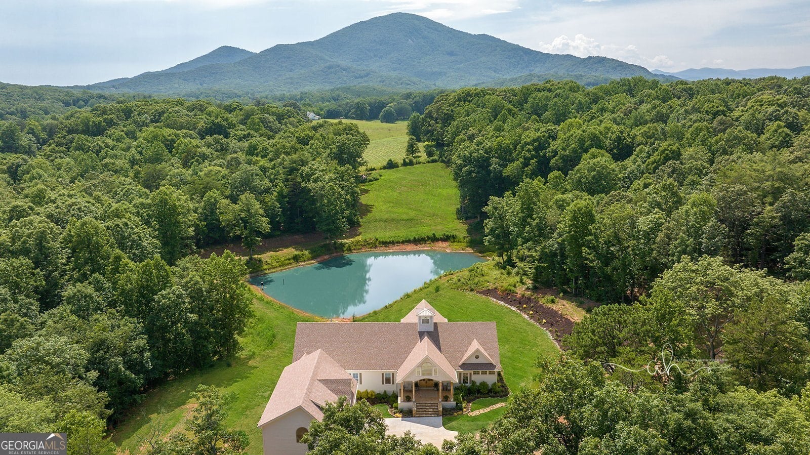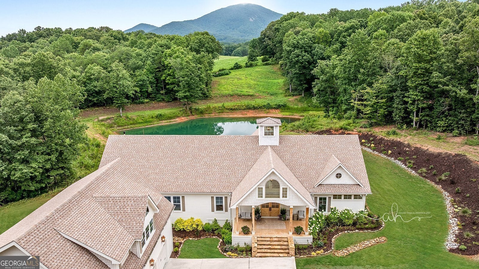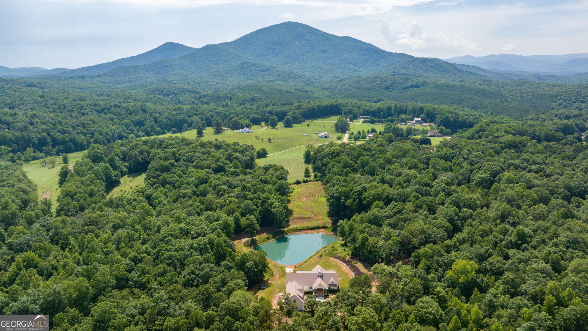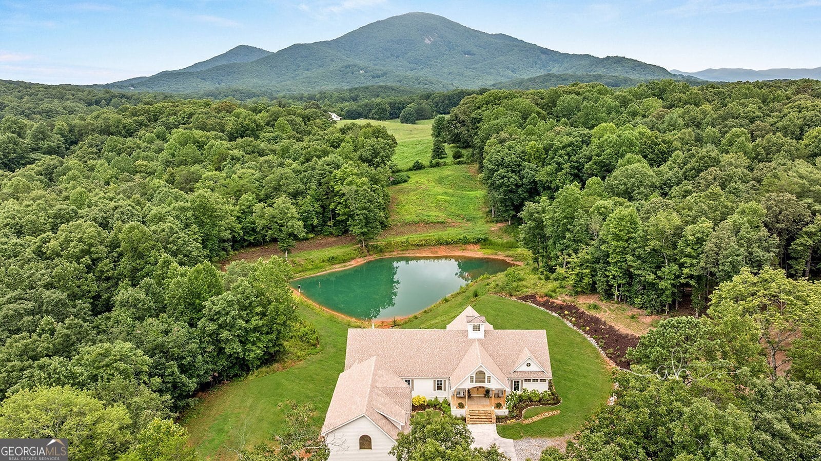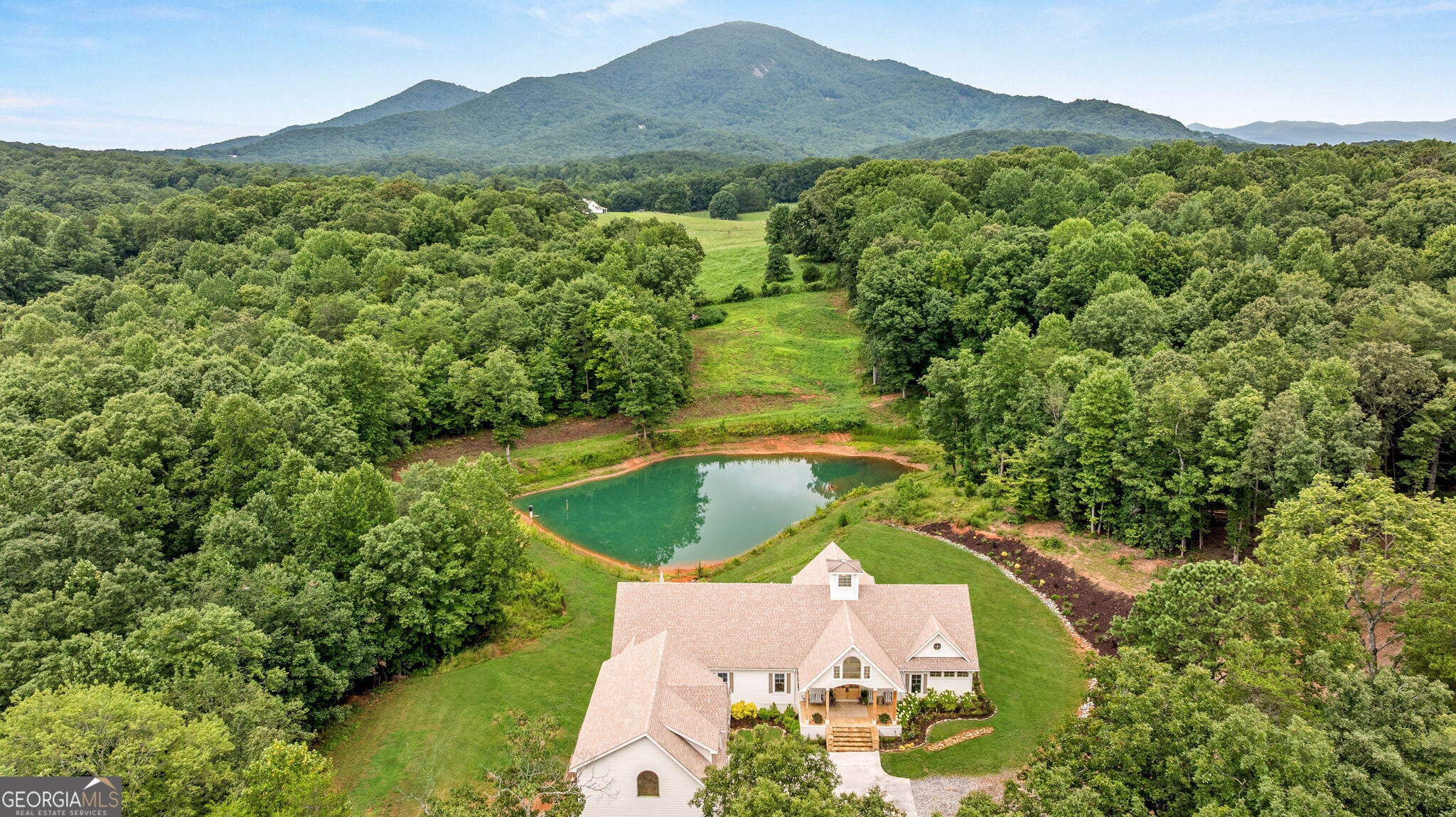 Discover a masterpiece of modern craftsmanship and natural splendor. Perched on 13.21 serene acres, this 2022 custom-built estate offers an experience of refined mountain living with staggering, uninterrupted views of Mt. Yonah from nearly every room. This is not just a home; it is a destination. Step inside to a sprawling single-level layout of 3,708 sqft, where a true open-concept design is taken to new heights. Soaring vaulted ceilings, accented by magnificent white oak beams milled from trees on the estate itself, draw the eye upward. Ten-foot ceilings and eight-foot doors create a sense of grandeur, while a real, functional cupola bathes the great room in glorious natural light. Two stately Texas limestone fireplaces provide a warm and inviting ambiance for quiet evenings or grand-scale entertaining. The luxurious primary suite is a private retreat, offering generous space, comfort, and a spa-like bath designed for ultimate relaxation. Every bedroom, along with the gourmet kitchen and main living area, is perfectly positioned to capture the majestic mountain vistas. A dedicated office provides a tranquil workspace, while the oversized laundry room adds everyday convenience. The expansive covered back porch is the perfect setting to savor your morning coffee or host gatherings against a spectacular natural backdrop. The grounds are a private paradise. Explore your own wooded walking trails, cast a line in the stocked pond, or simply relax to the soothing sounds of a year-round creek. For the hobbyist or collector, the attached 1,400 sqft 3-car garage features a vaulted bonus room with plumbing already in place for a future bathroom, offering limitless potential. An immense 24x36 crawl space with both walk-through and garage-door access provides unparalleled storage solutions. Experience absolute seclusion while remaining conveniently located just 10 minutes from the charms of Helen, Cleveland, and Clarkesville, and a mere 40 minutes from Gainesville. This property represents a rare and remarkable opportunity to own a piece of North Georgia's finest scenery, where luxury design and the tranquility of nature exist in perfect harmony.